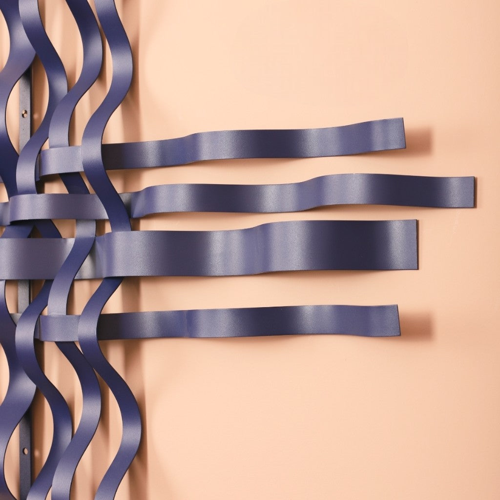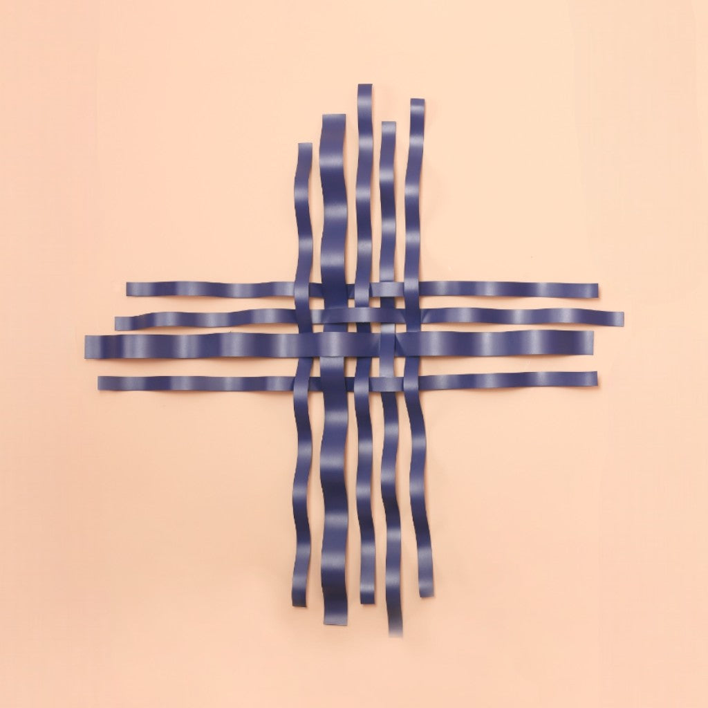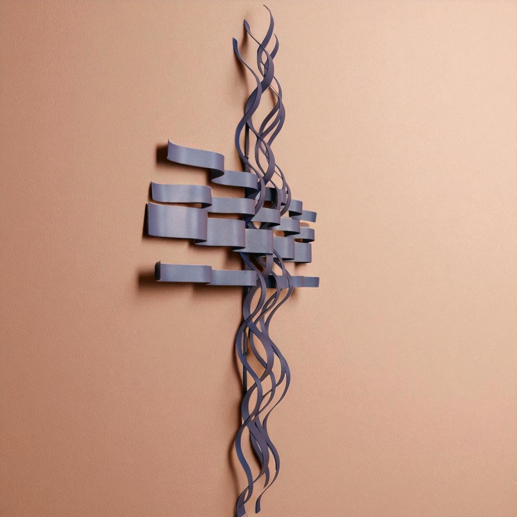 Lacivert renkte statik boyalı sac levha şeritlerden oluşmuş amorf bir kompozisyondan oluşmaktadır.