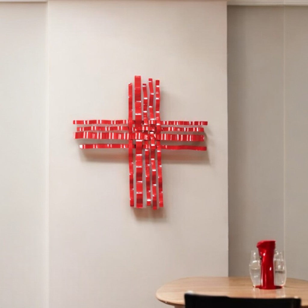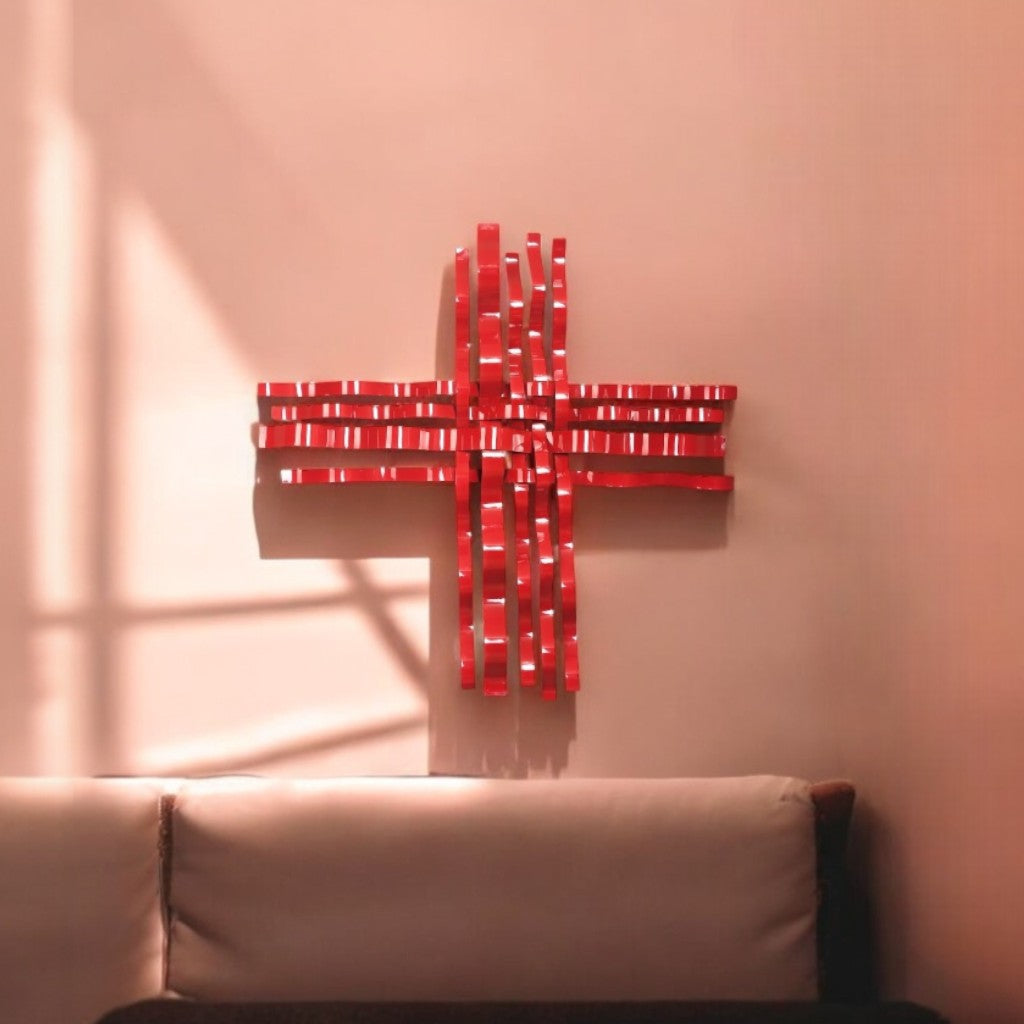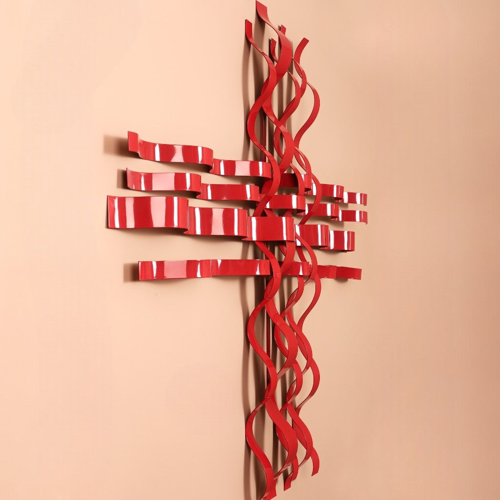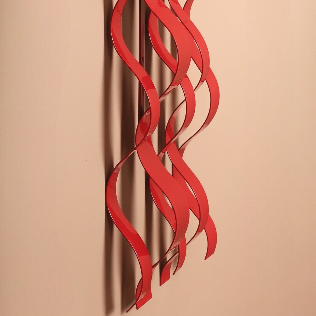 Kırmızı renkte statik boyalı sac levha şeritlerden oluşmuş amorf bir kompozisyondan oluşmaktadır.