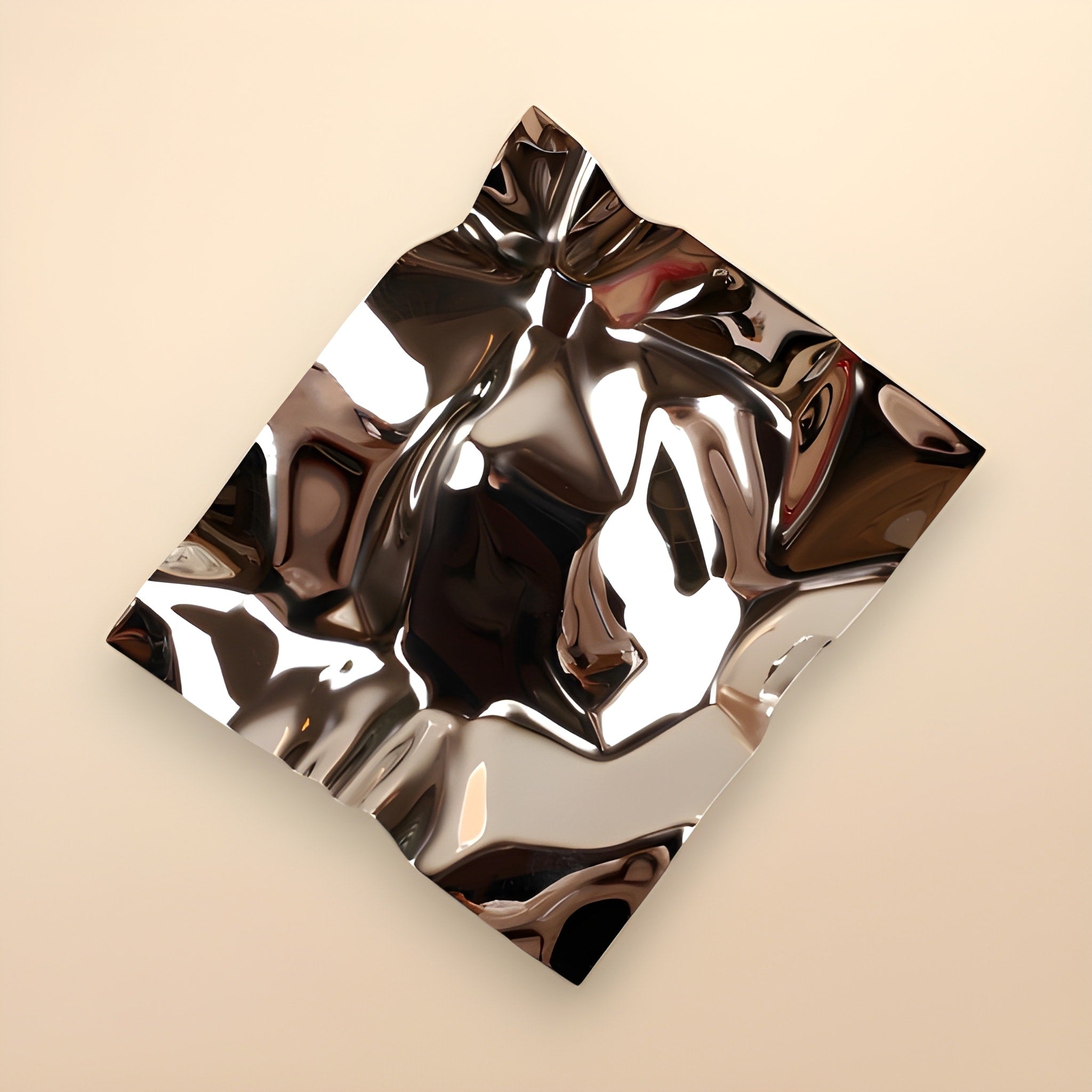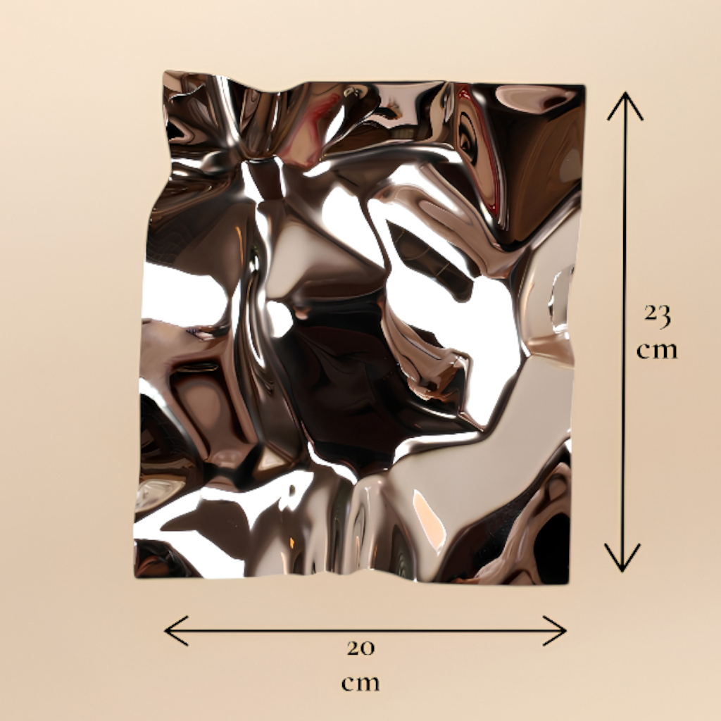 Buruşuk kağıt formunda tasarlanmış gümüş renkte paslanmaz çelik malzemeden oluşmaktadır.
