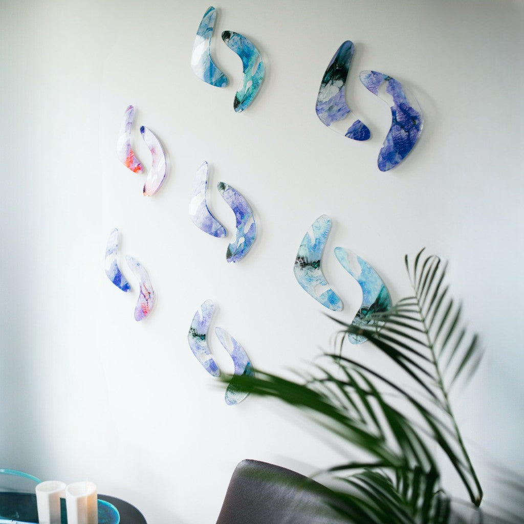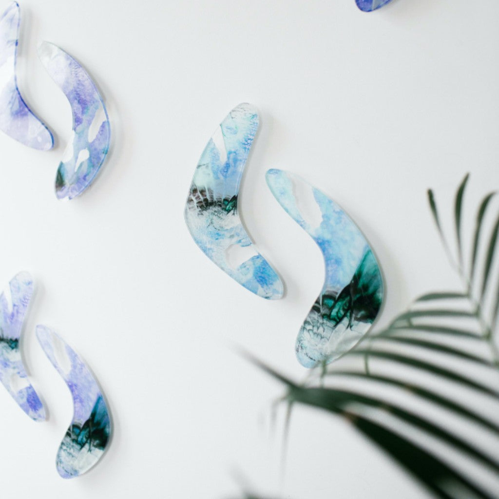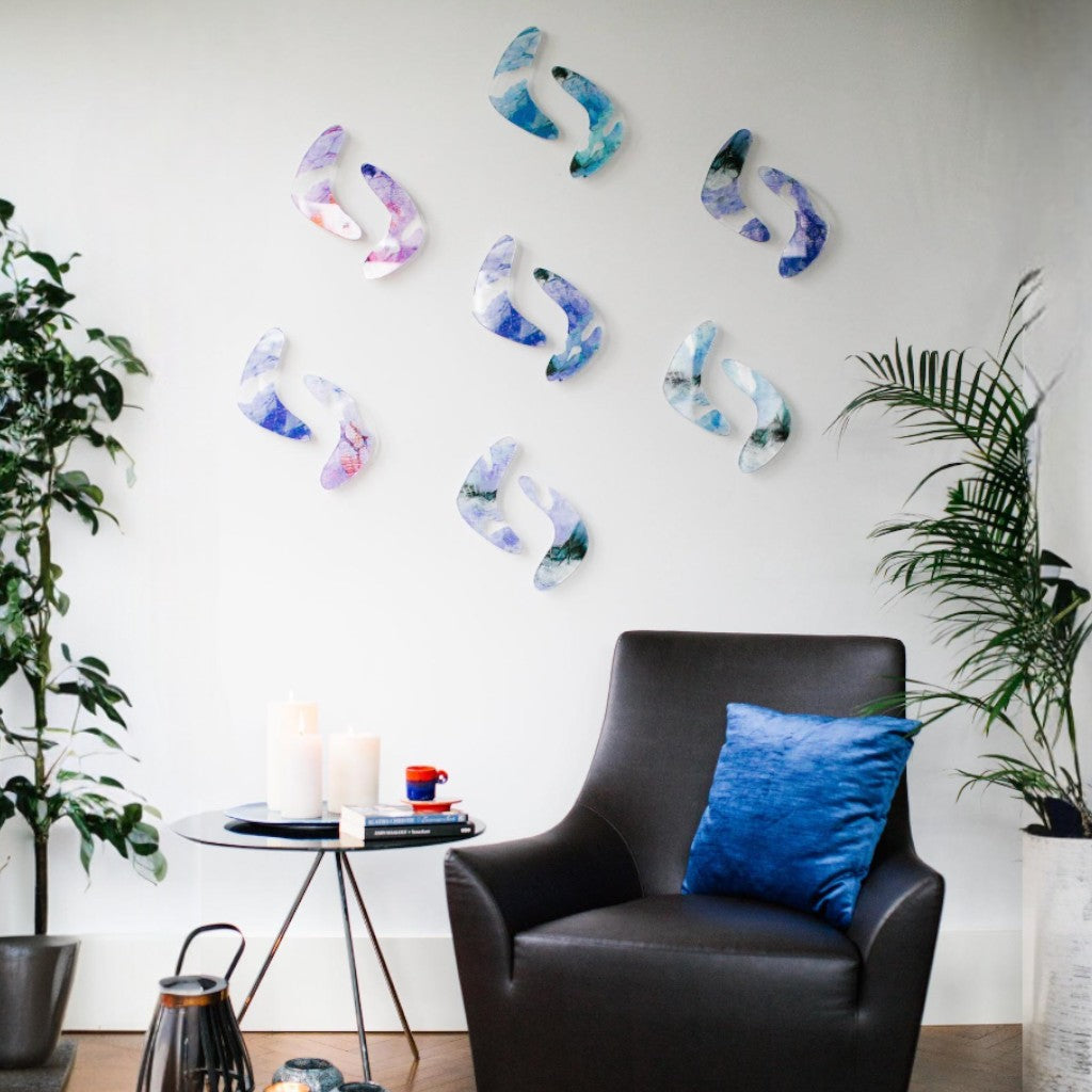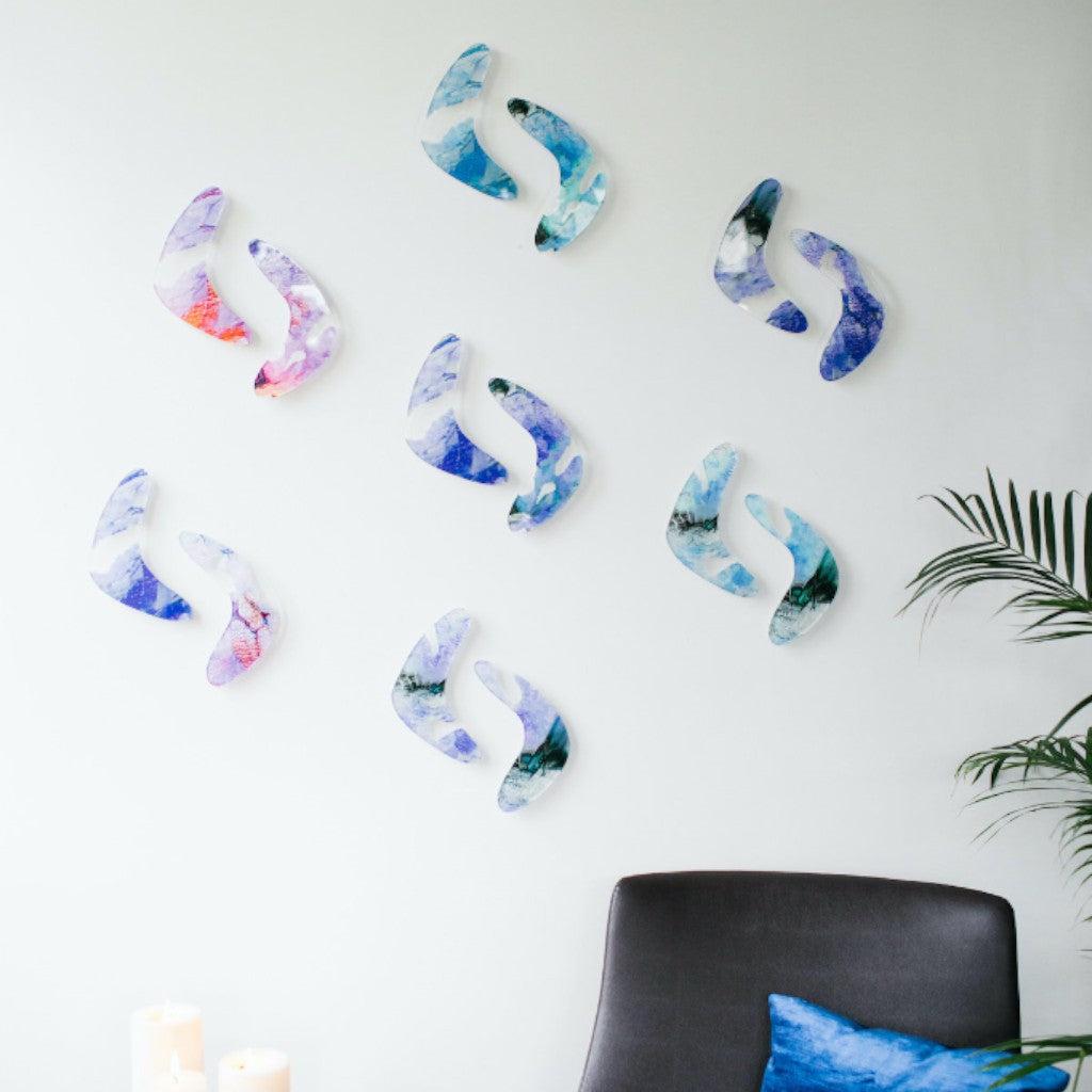 24 cm boyutlarında, Bumerang formundan esinlenilerek tasarlanıp kesimi yapılmış pleksi üzerine Melis Önalan Altıparmak’a ait çalışma detayı dijital baskı yapılmıştır. Arka yüzlerinde bulunan kaideler ile duvardan önde durmakta; duvara yapışık durmamaktadır. Bir pakette 7 çift; toplamda 14 adet ürün bulunmaktadır.
