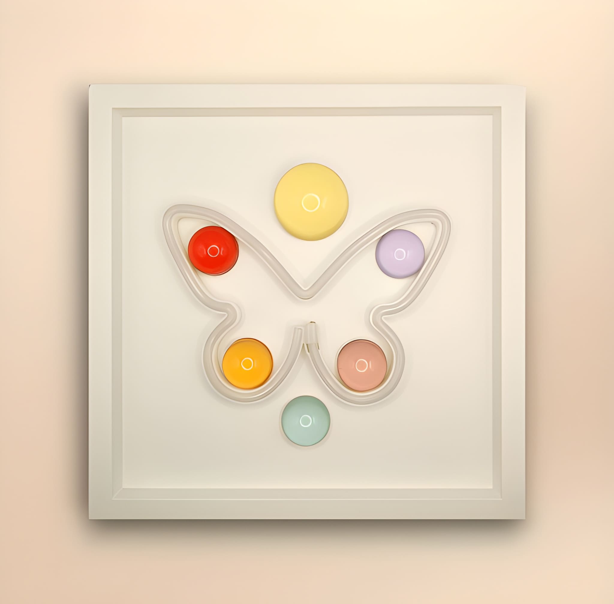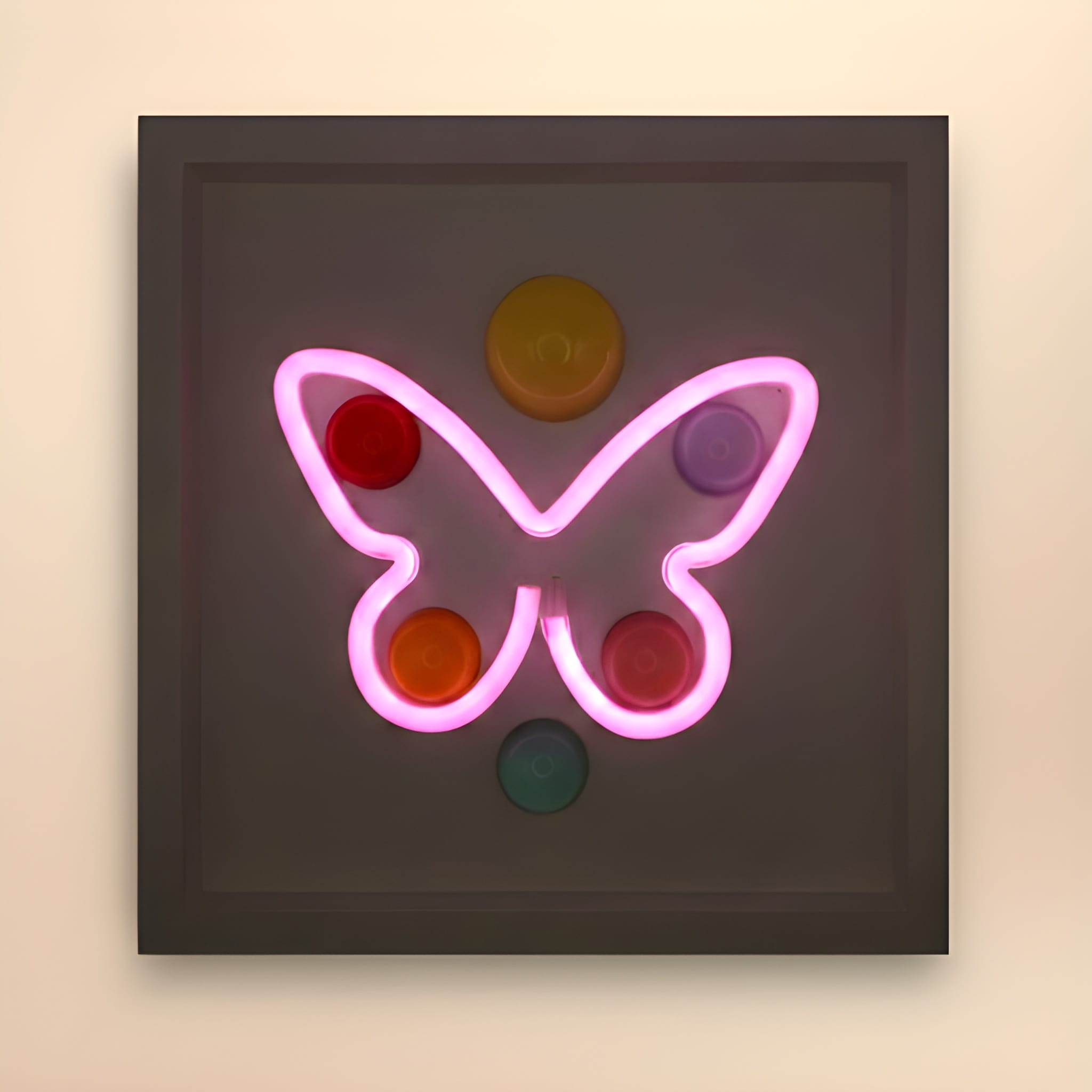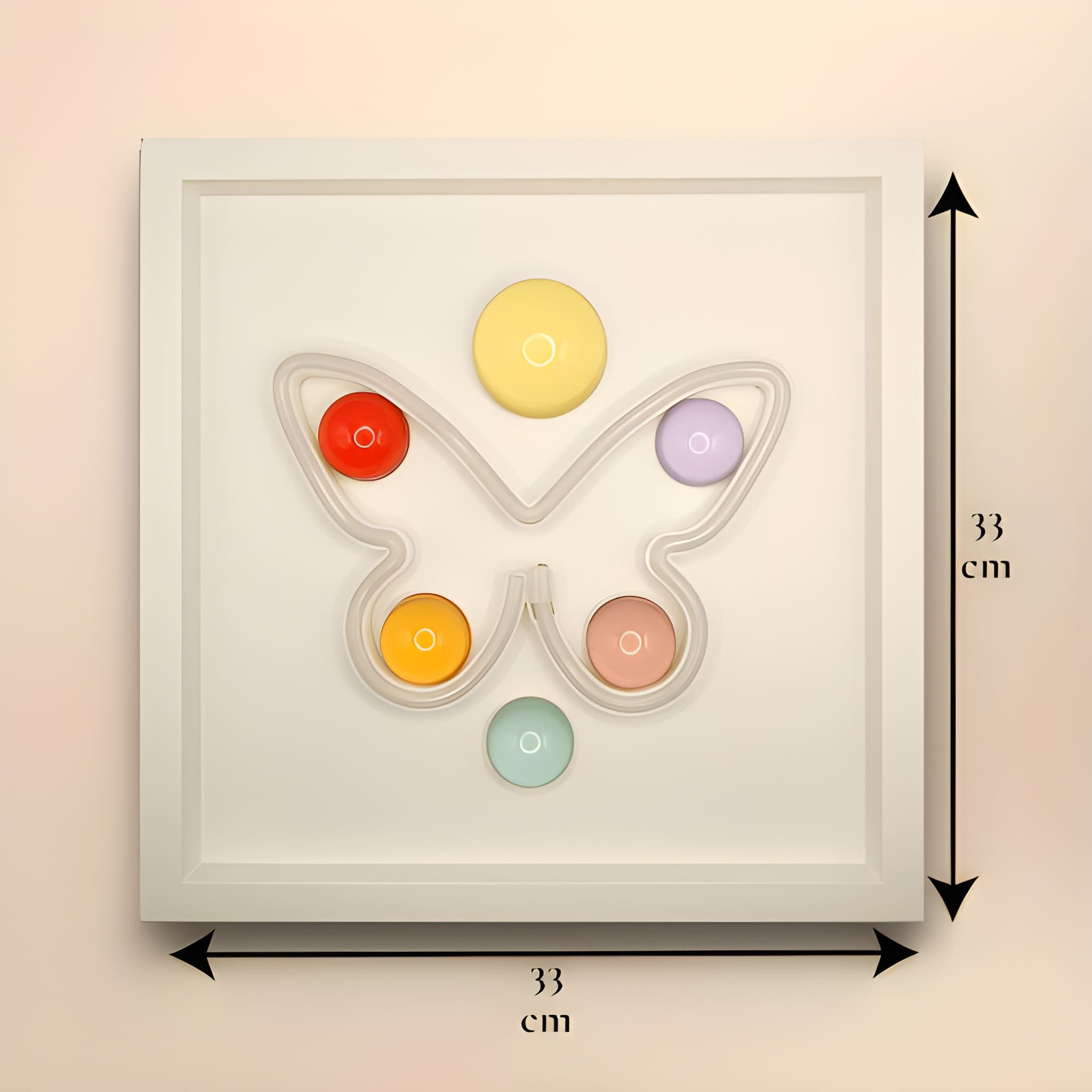 33x33 cm derinlikli kırık beyaz renk çerçeve içine pilli özel sistemiyle yerleştirilmiş “kelebek” formundan pembe renkdeki ışık ile 6 adet Wallipop ürününün birleştirilmesiyle oluşturulmuştur.