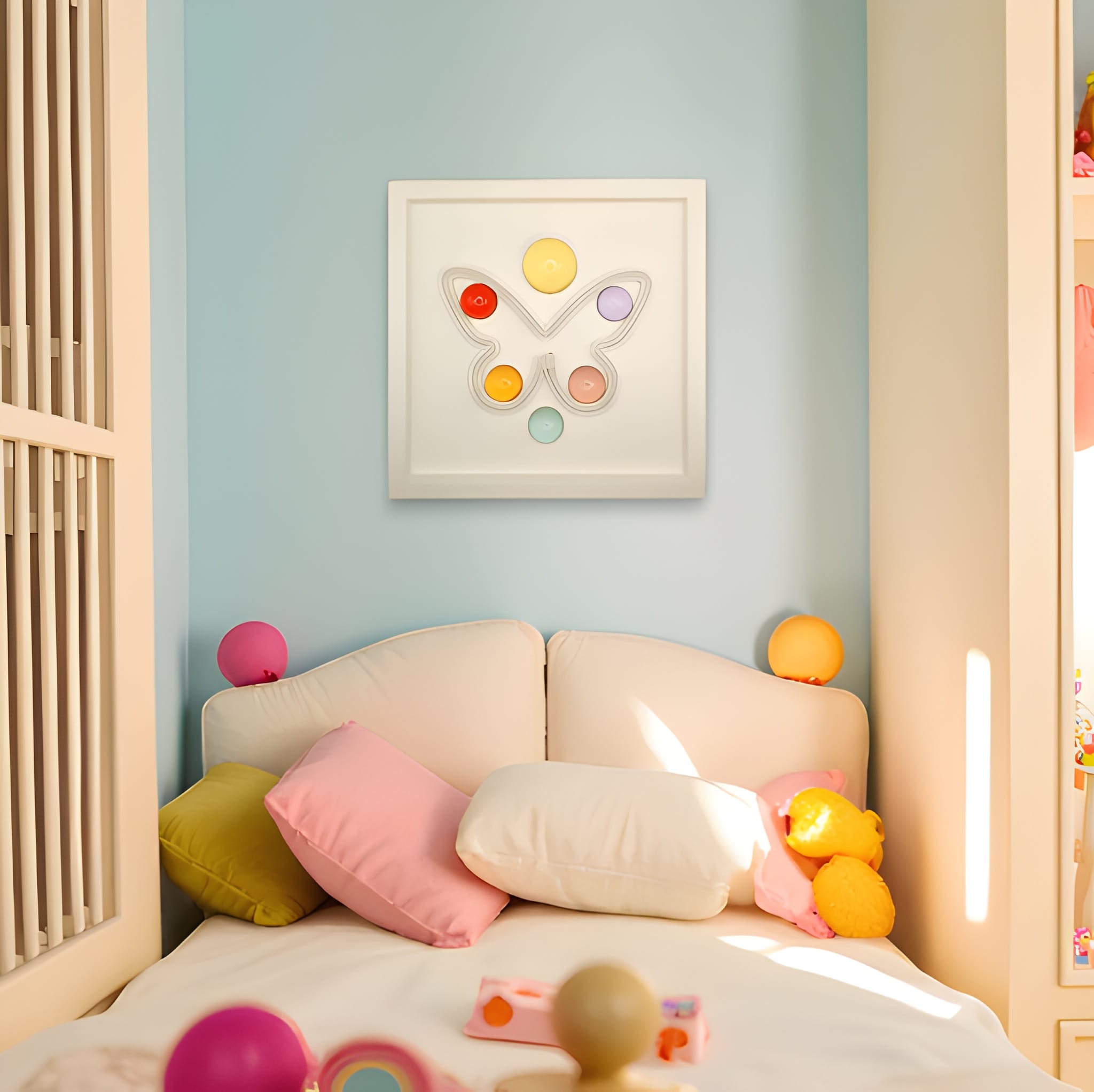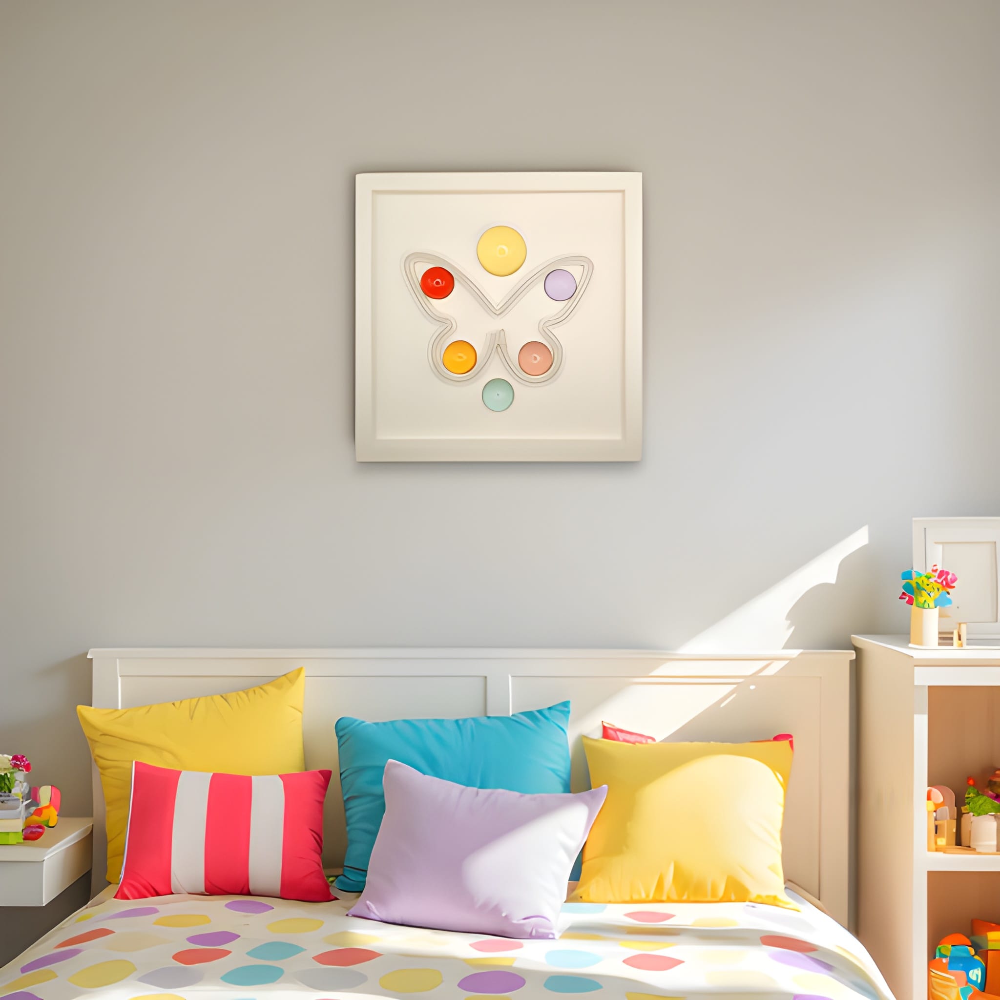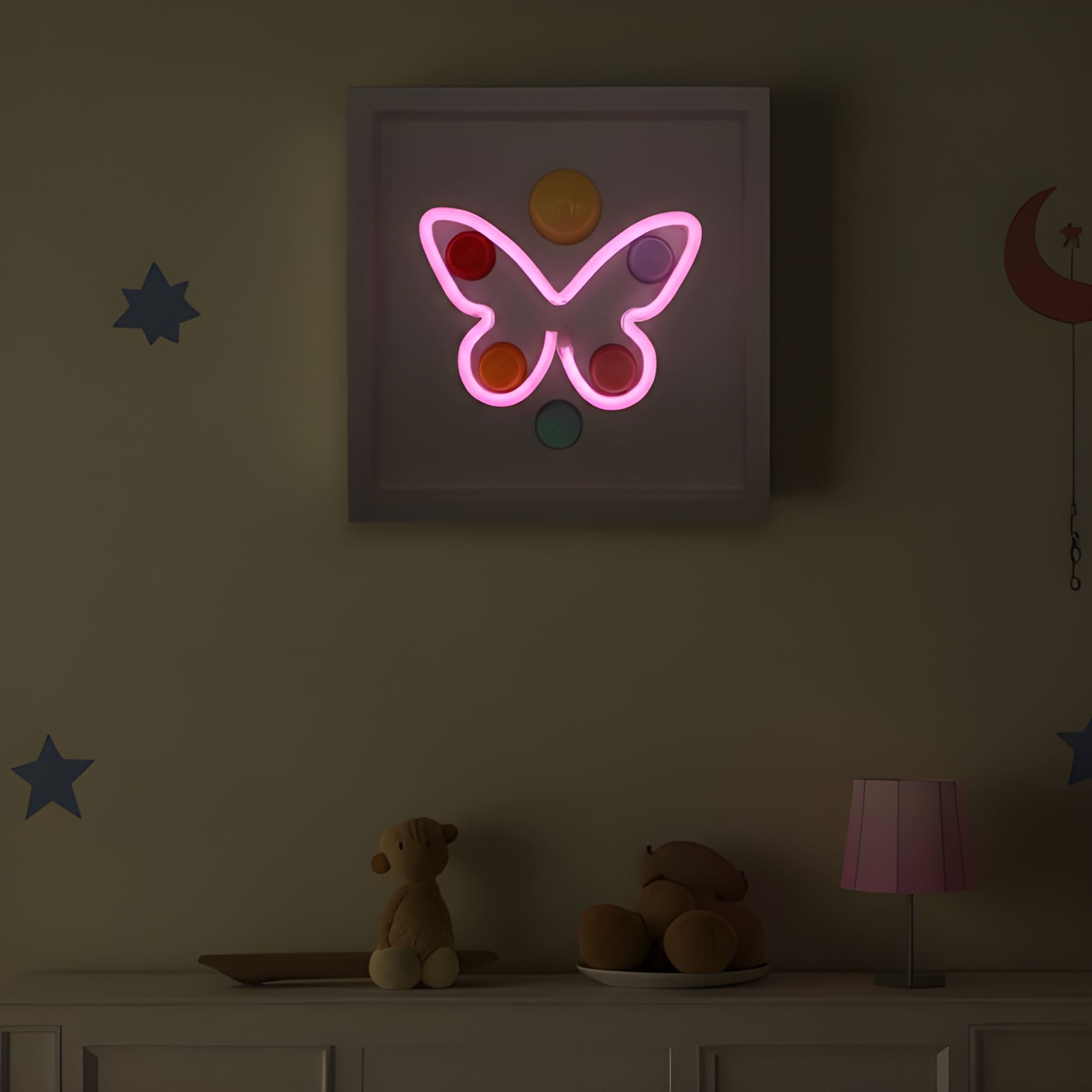 33x33 cm derinlikli kırık beyaz renk çerçeve içine pilli özel sistemiyle yerleştirilmiş “kelebek” formundan pembe renkdeki ışık ile 6 adet Wallipop ürününün birleştirilmesiyle oluşturulmuştur.