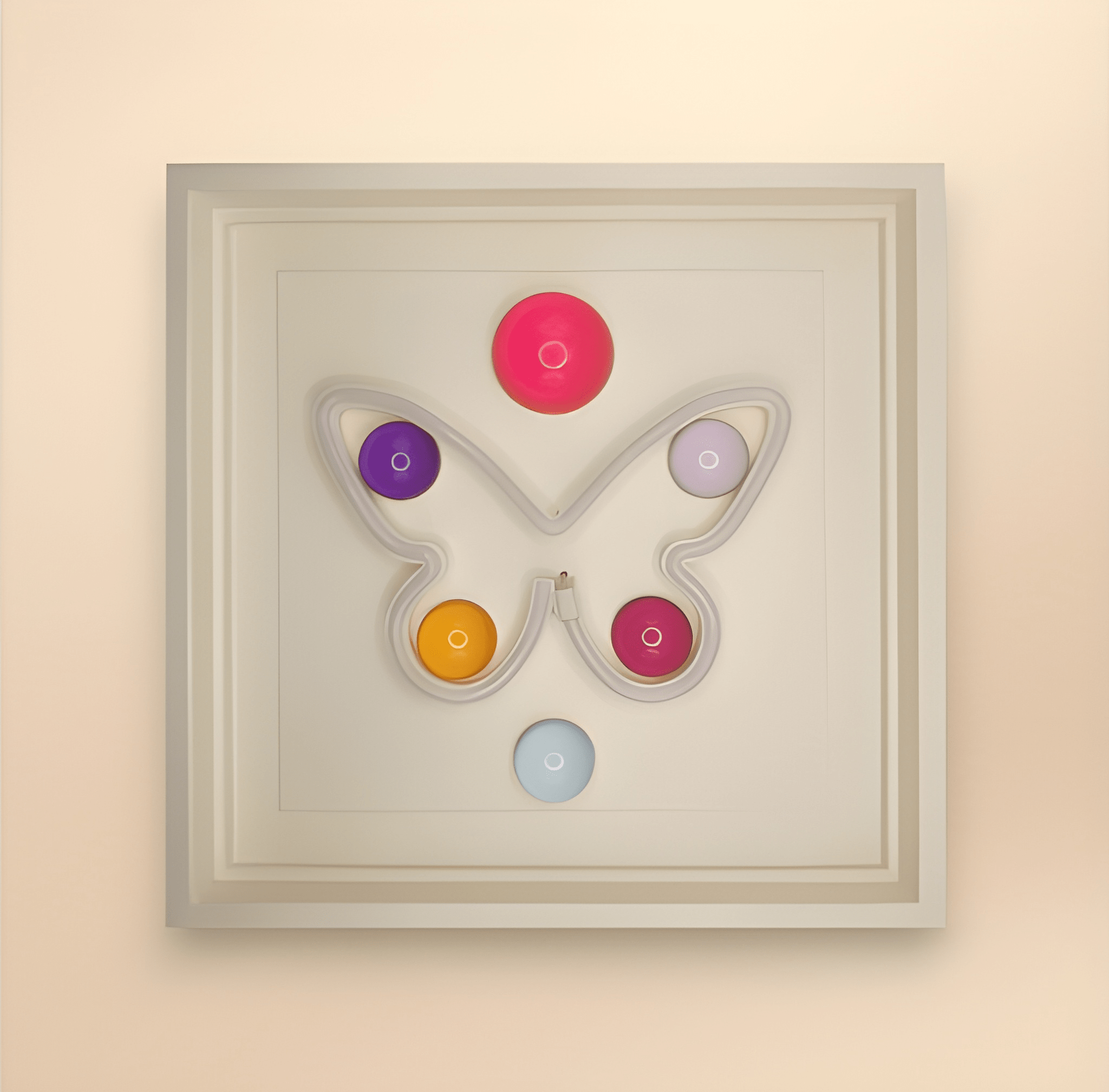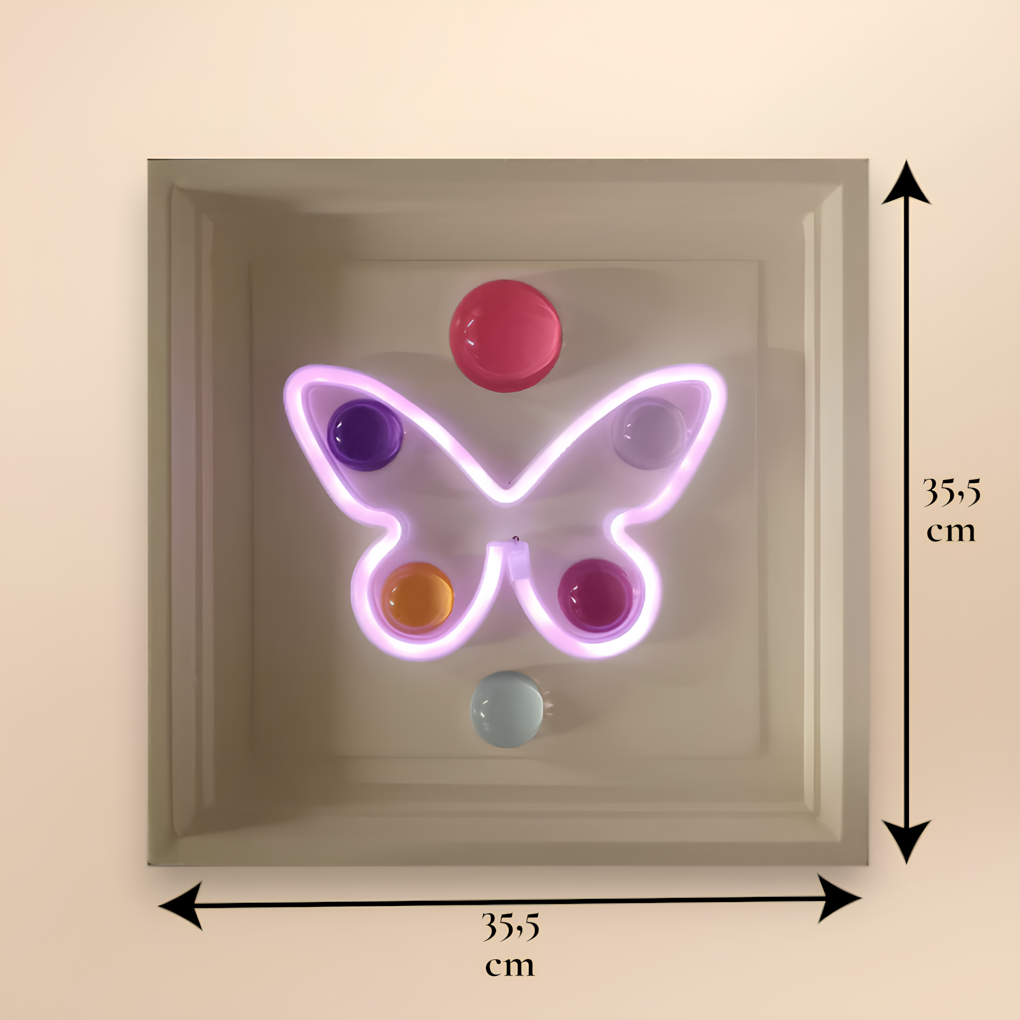 35,5x35,5 cm derinlikli kırık beyaz renk çerçeve içine pilli özel sistemiyle yerleştirilmiş “joystick” formundan pembe renkdeki ışık ile 6 adet Wallipop ürününün birleştirilmesiyle oluşturulmuştur.