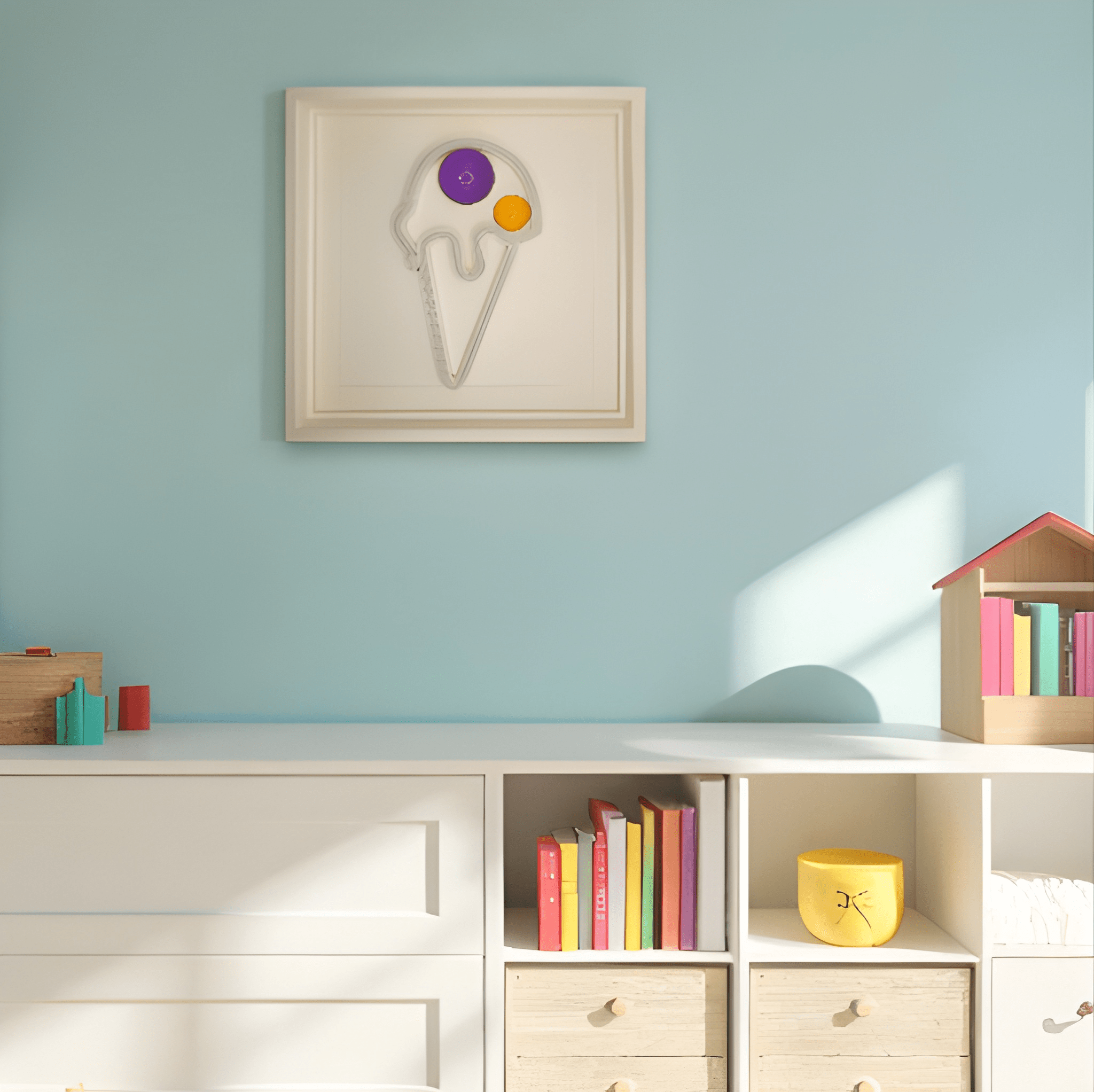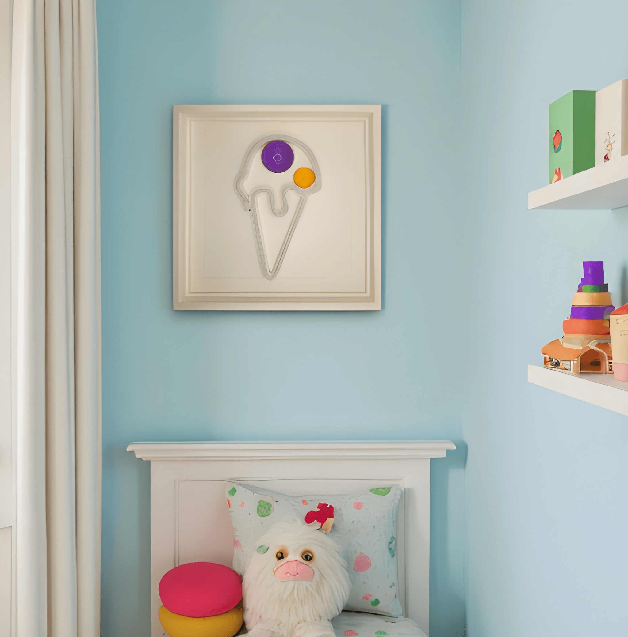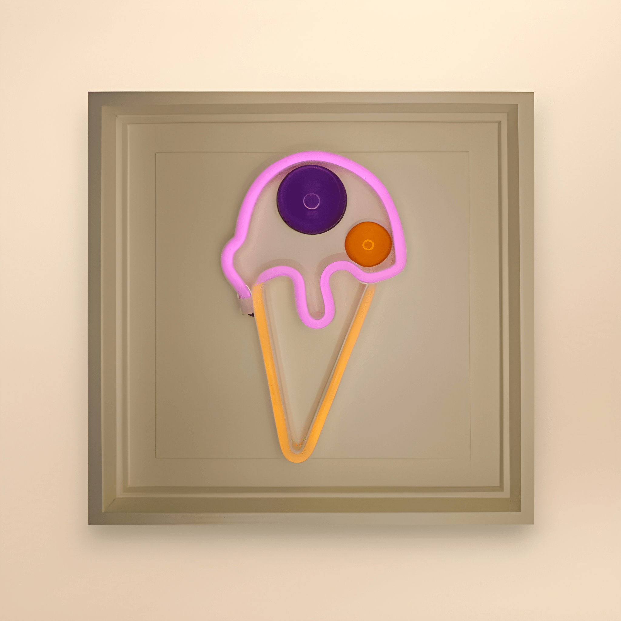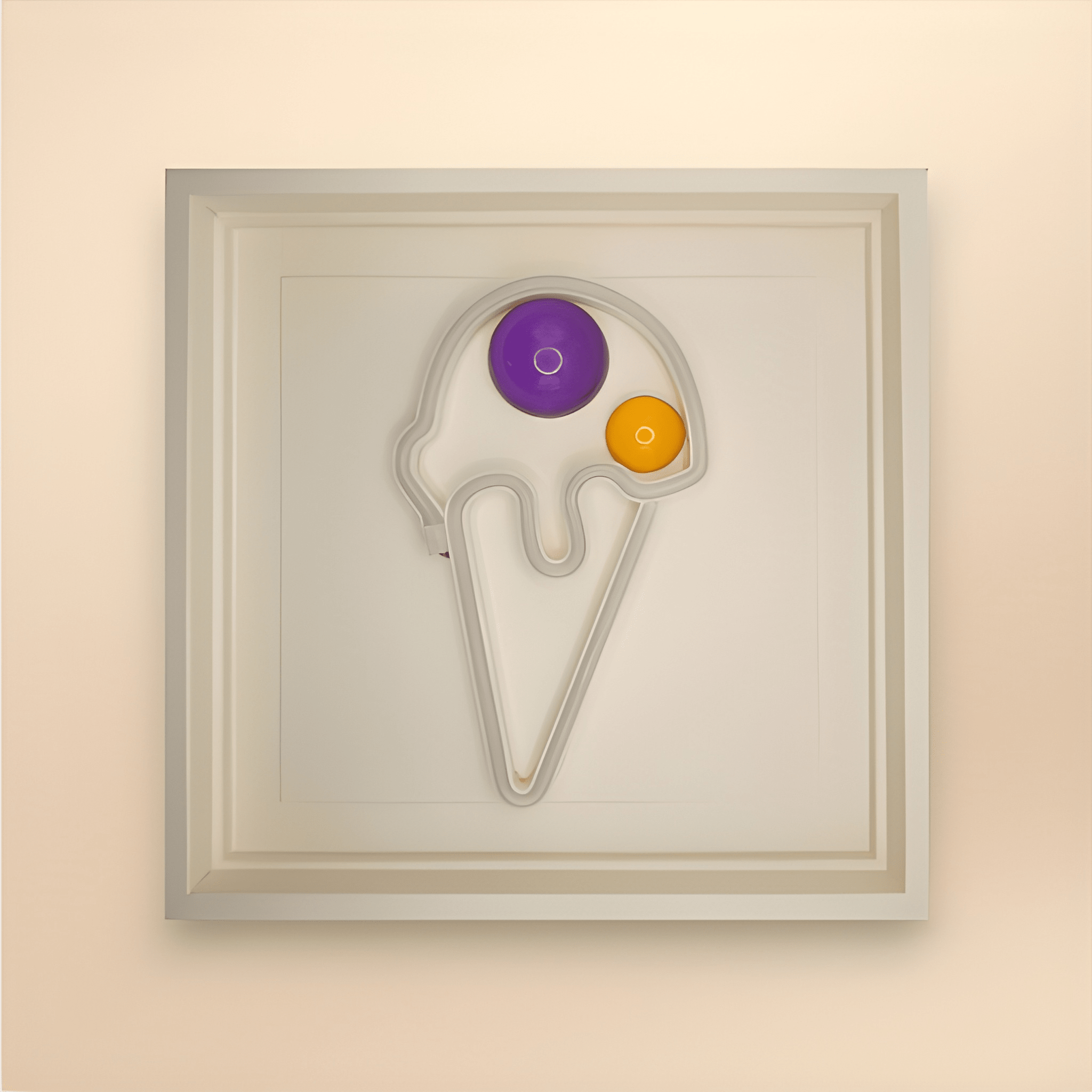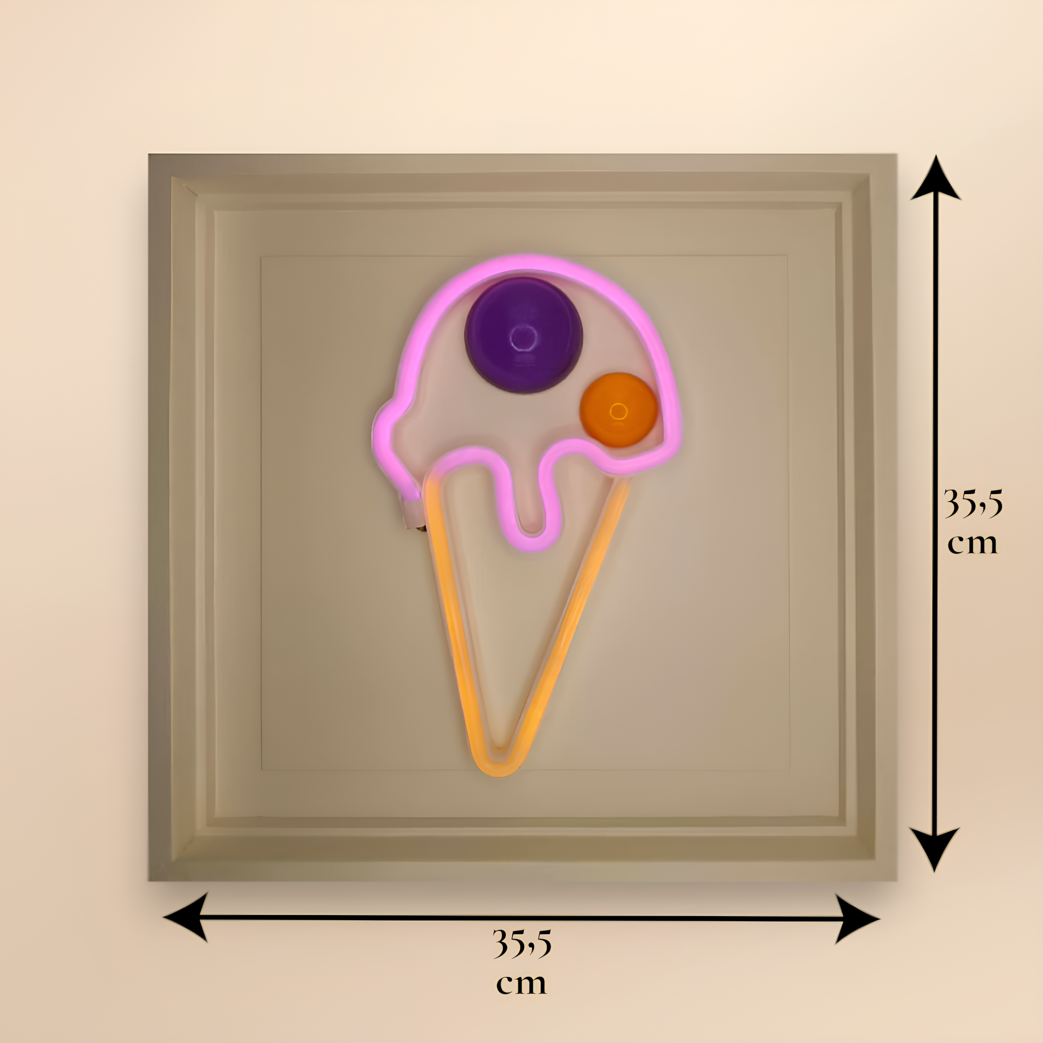 35,5x35,5 cm derinlikli kırık beyaz renk çerçeve içine pilli özel sistemiyle yerleştirilmiş “dondurma” formundan pembe ve turuncu ışık ile 2 adet Wallipop ürününün birleştirilmesiyle oluşturulmuştur.