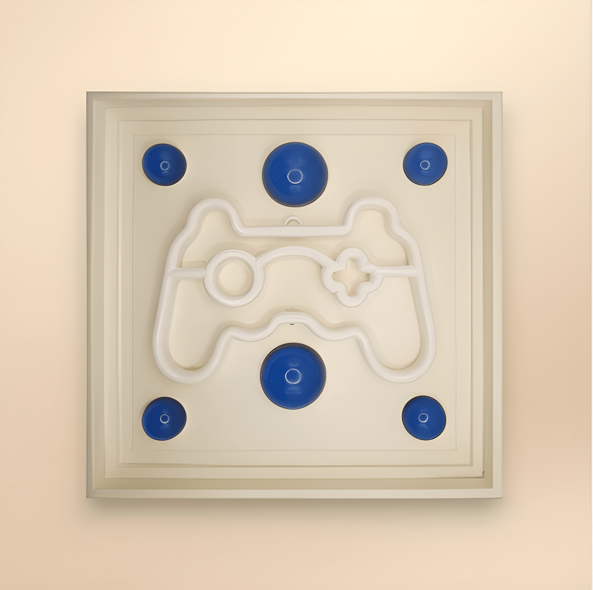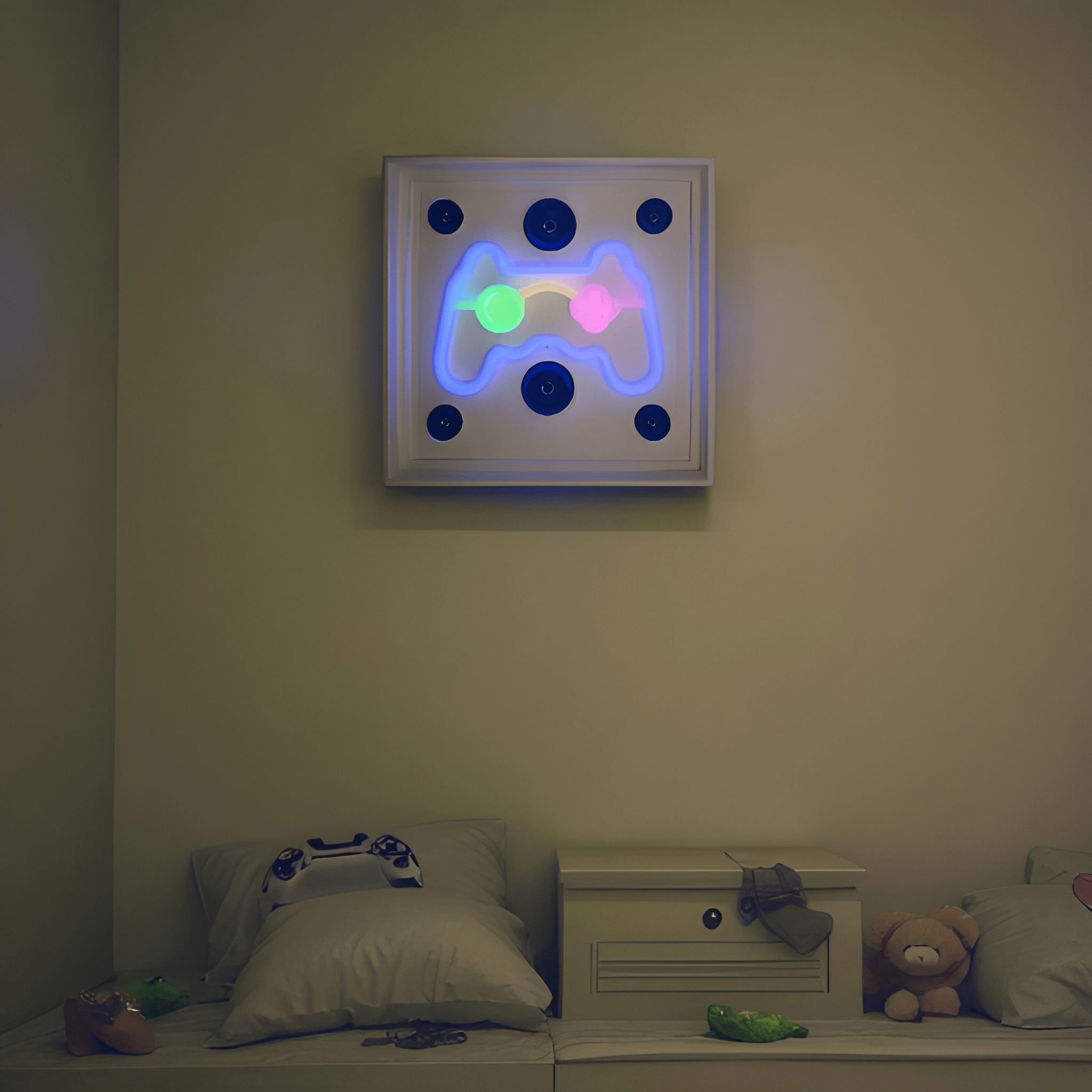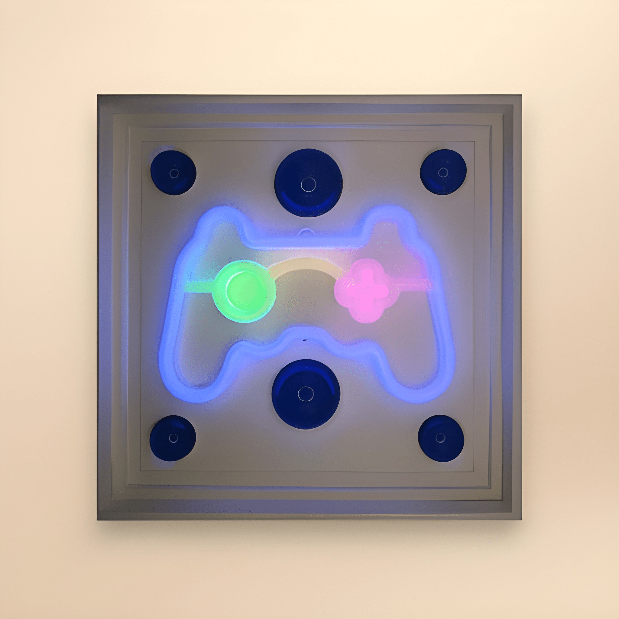 35,5x35,5 cm derinlikli kırık beyaz renk çerçeve içine pilli özel sistemiyle yerleştirilmiş “joystick” formundan karışık renklerdeki ışık ile 6 adet Wallipop ürününün birleştirilmesiyle oluşturulmuştur.