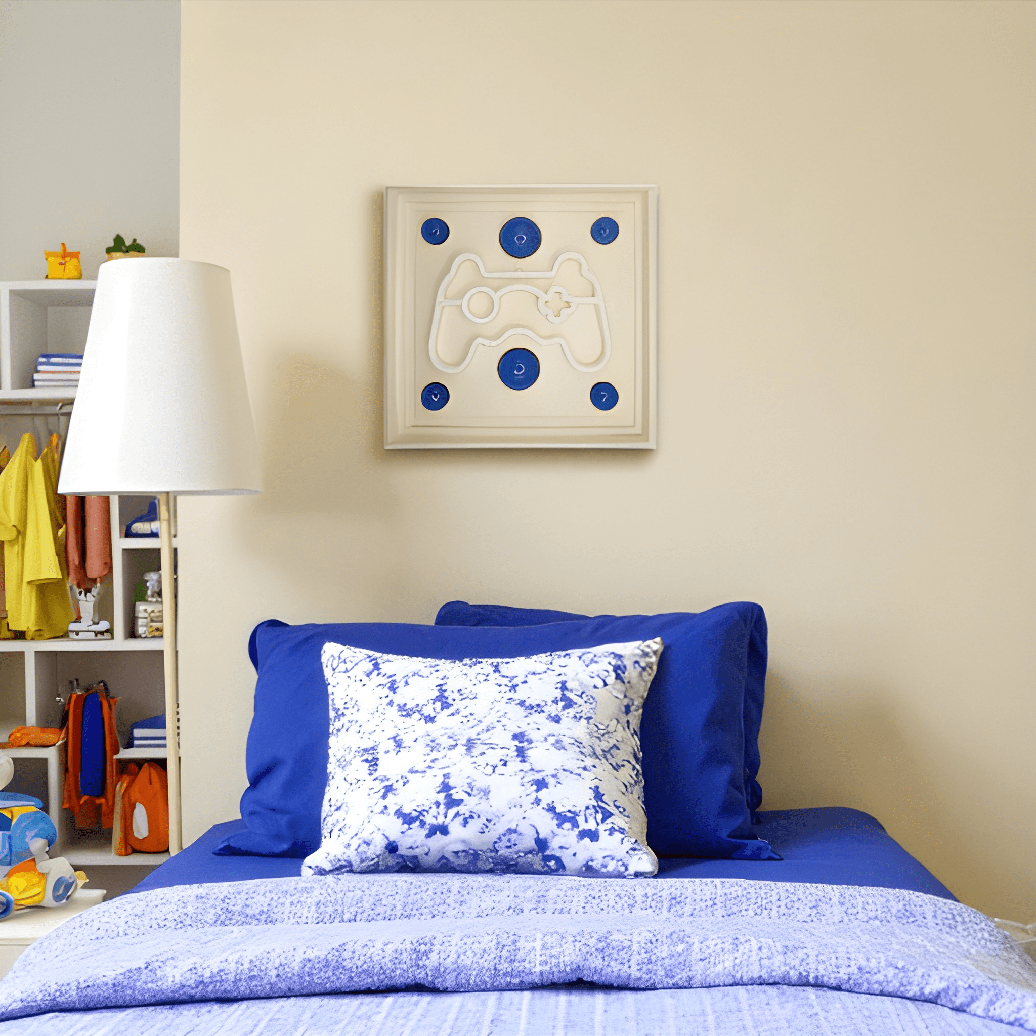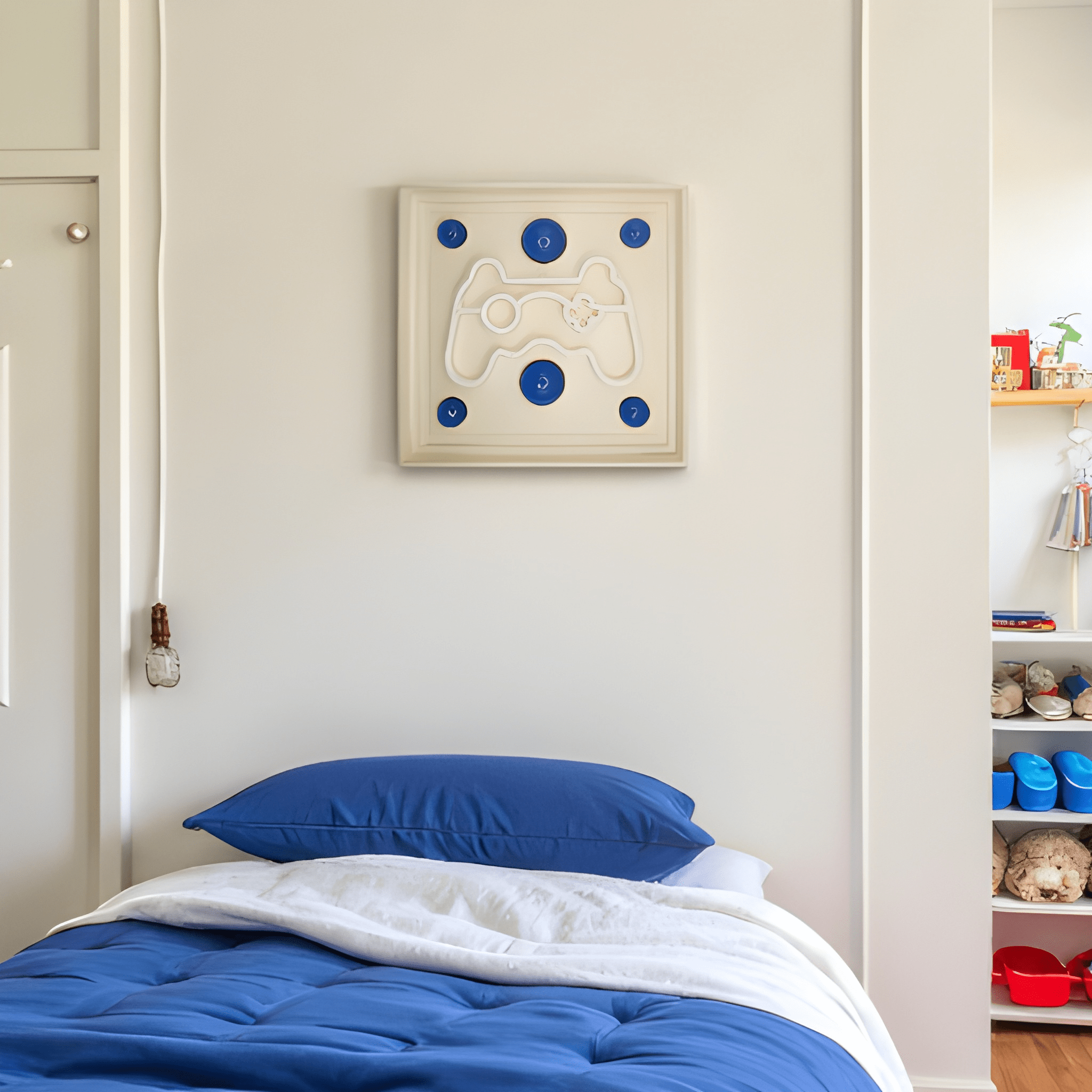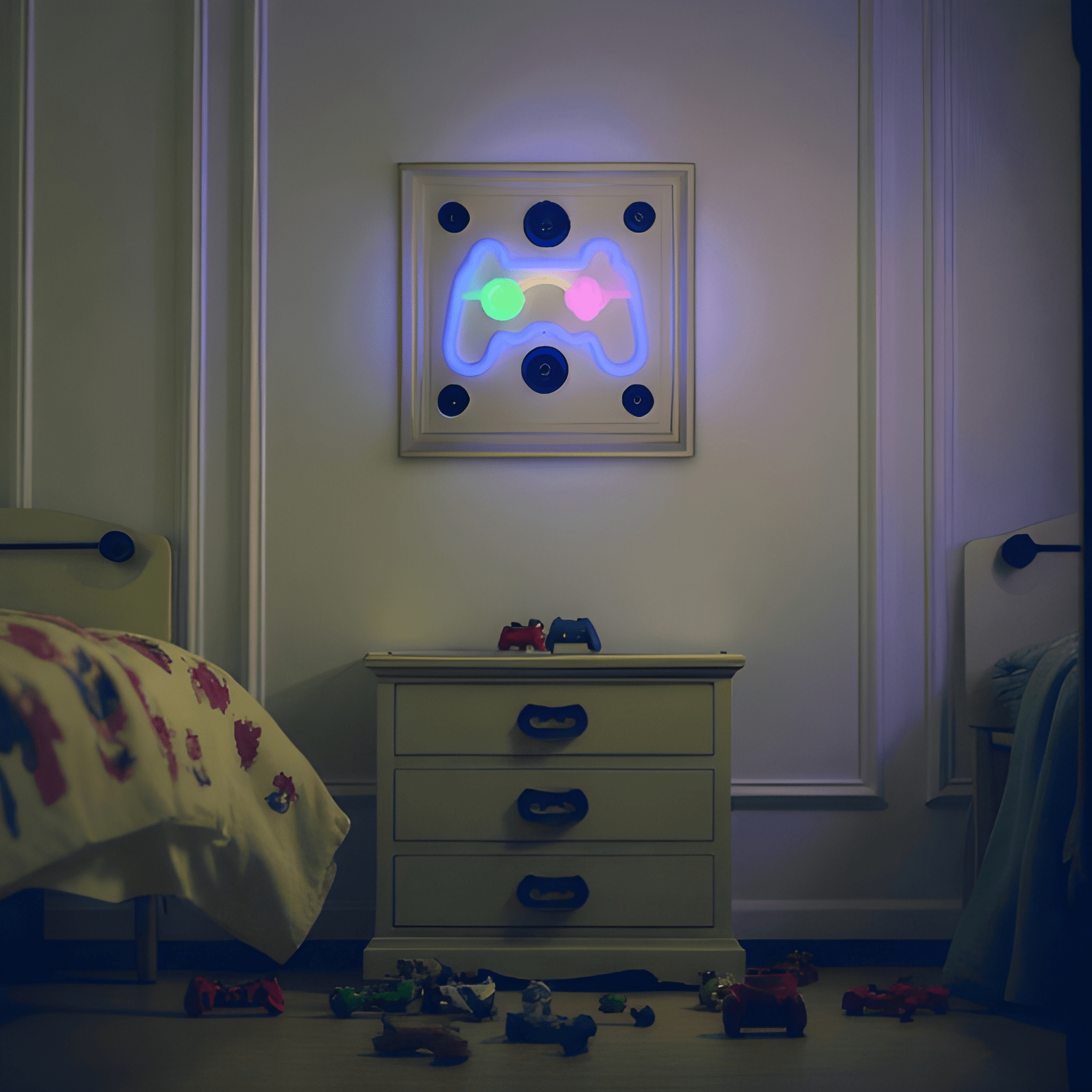 35,5x35,5 cm derinlikli kırık beyaz renk çerçeve içine pilli özel sistemiyle yerleştirilmiş “joystick” formundan karışık renklerdeki ışık ile 6 adet Wallipop ürününün birleştirilmesiyle oluşturulmuştur.