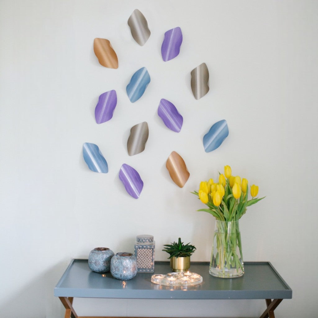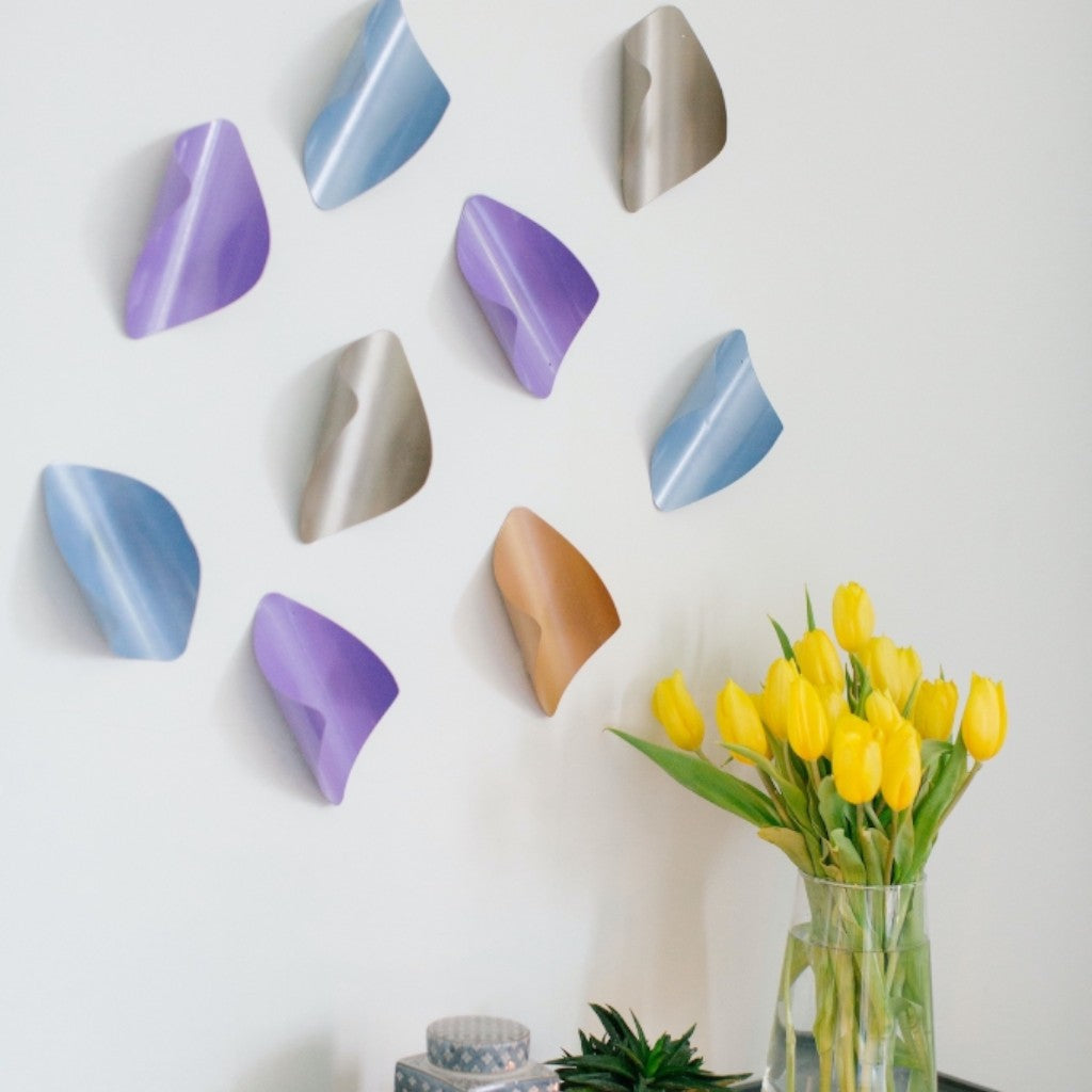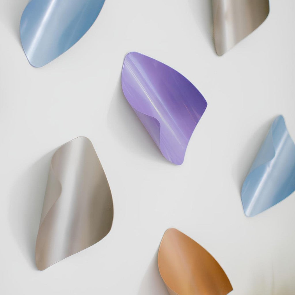 Pakette 3'er adet karışık renkli toplam 12 adet ürün bulunur. Asimetrik lazer kesim metal levhaların bükülmesi ve elektrostatik boya uygulaması ile amorf yaprak formunda tasarlanan dekoratif üründür.