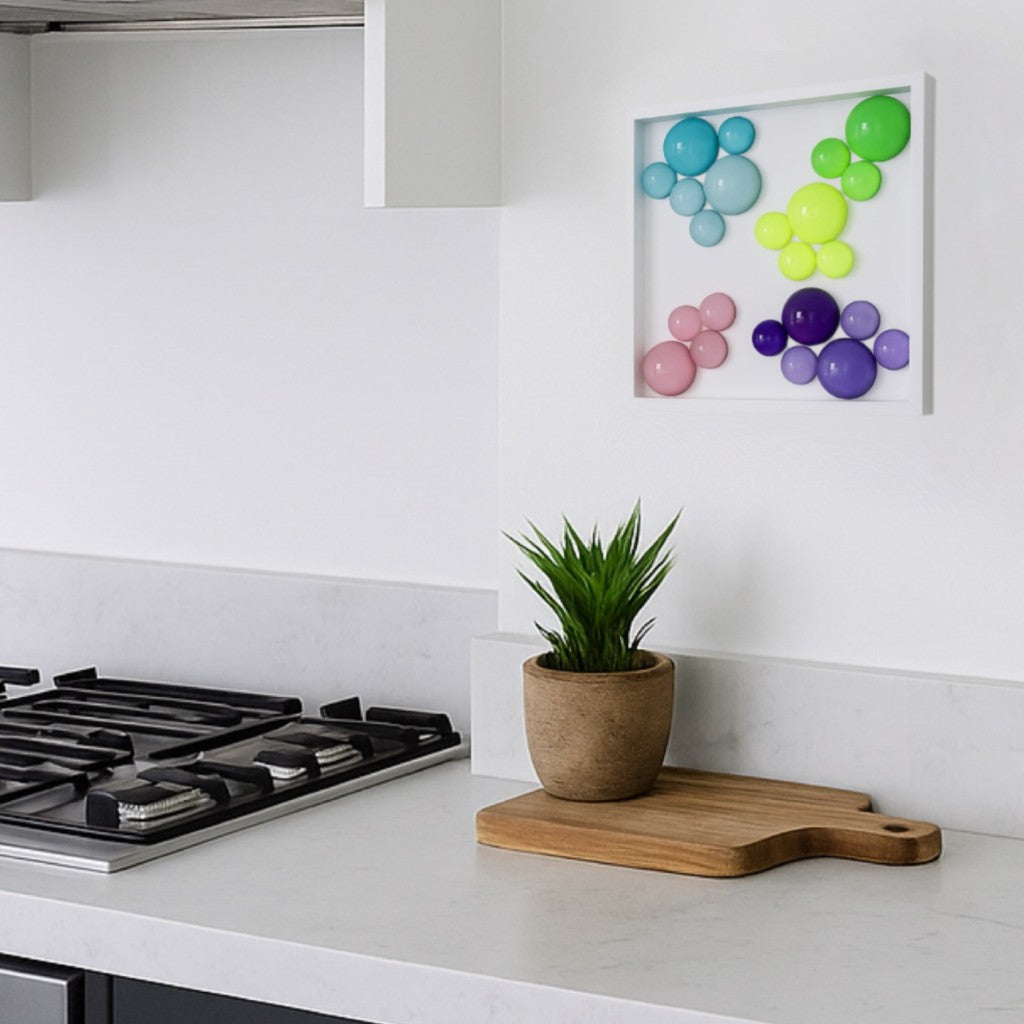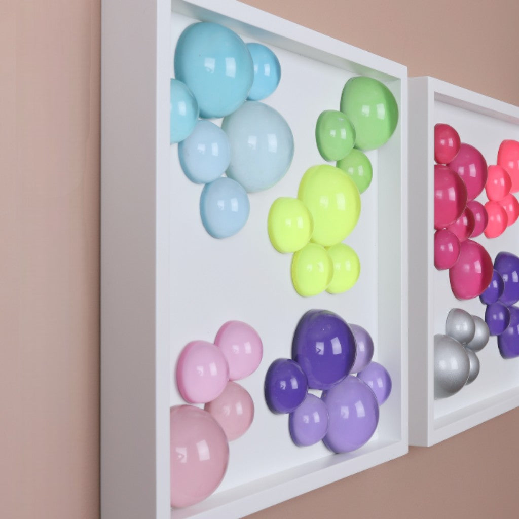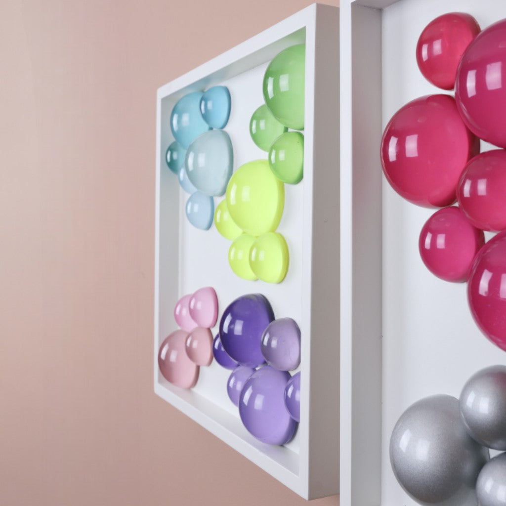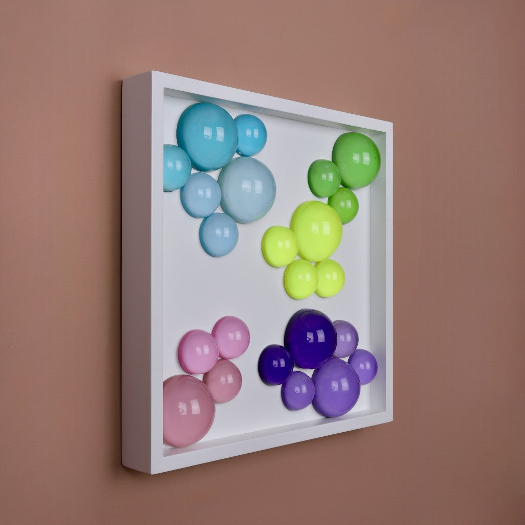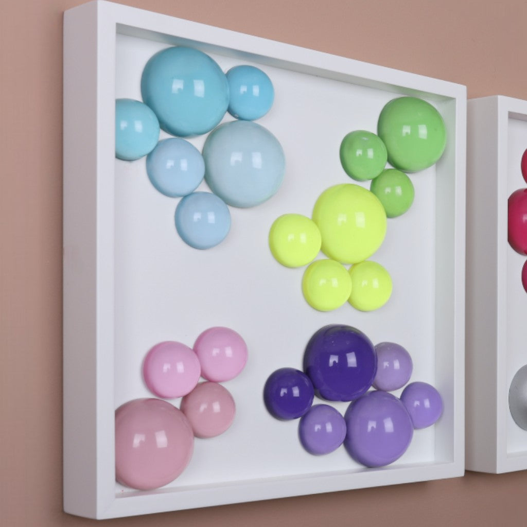 32x32 cm derinlikli kırık beyaz renk çerçeve içine 23 adet irili ufaklı pembe, sarı, mavi, yeşil ve mor tonlarında “Wallipop” ürününün yerleştirilmesiyle oluşturulmuştur.