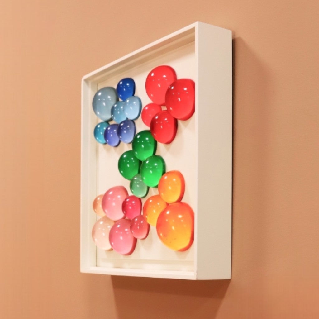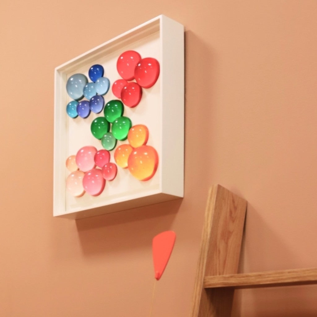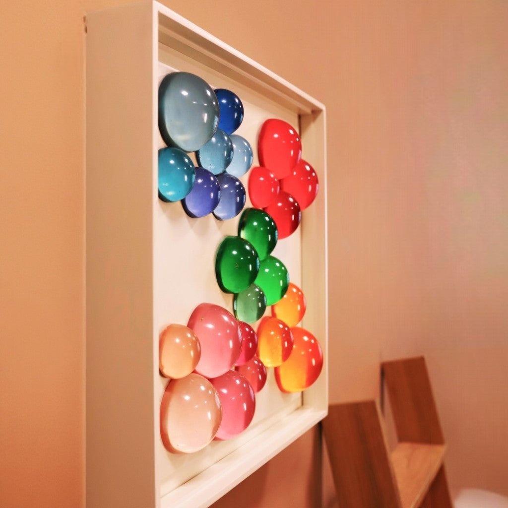 32x32 cm derinlikli kırık beyaz renk çerçeve içine 24 adet irili ufaklı pembe, turuncu, mavi, yeşil ve nar çiçeği tonlarında “Wallipop” ürününün yerleştirilmesiyle oluşturulmuştur.