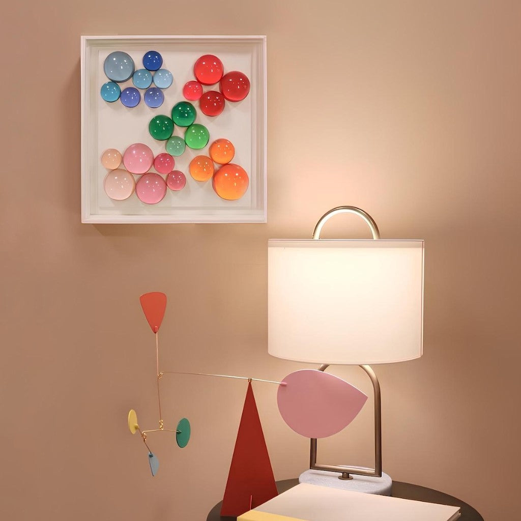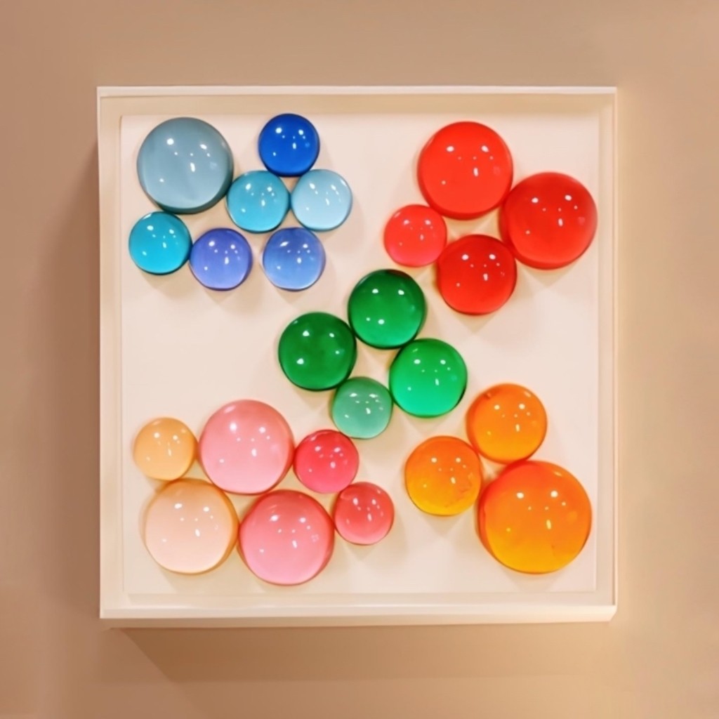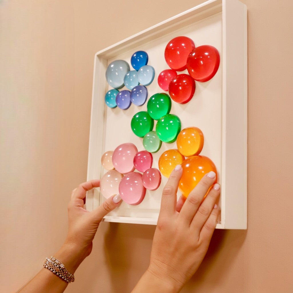 32x32 cm derinlikli kırık beyaz renk çerçeve içine 24 adet irili ufaklı pembe, turuncu, mavi, yeşil ve nar çiçeği tonlarında “Wallipop” ürününün yerleştirilmesiyle oluşturulmuştur.