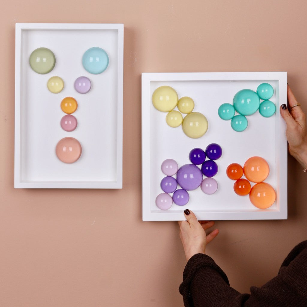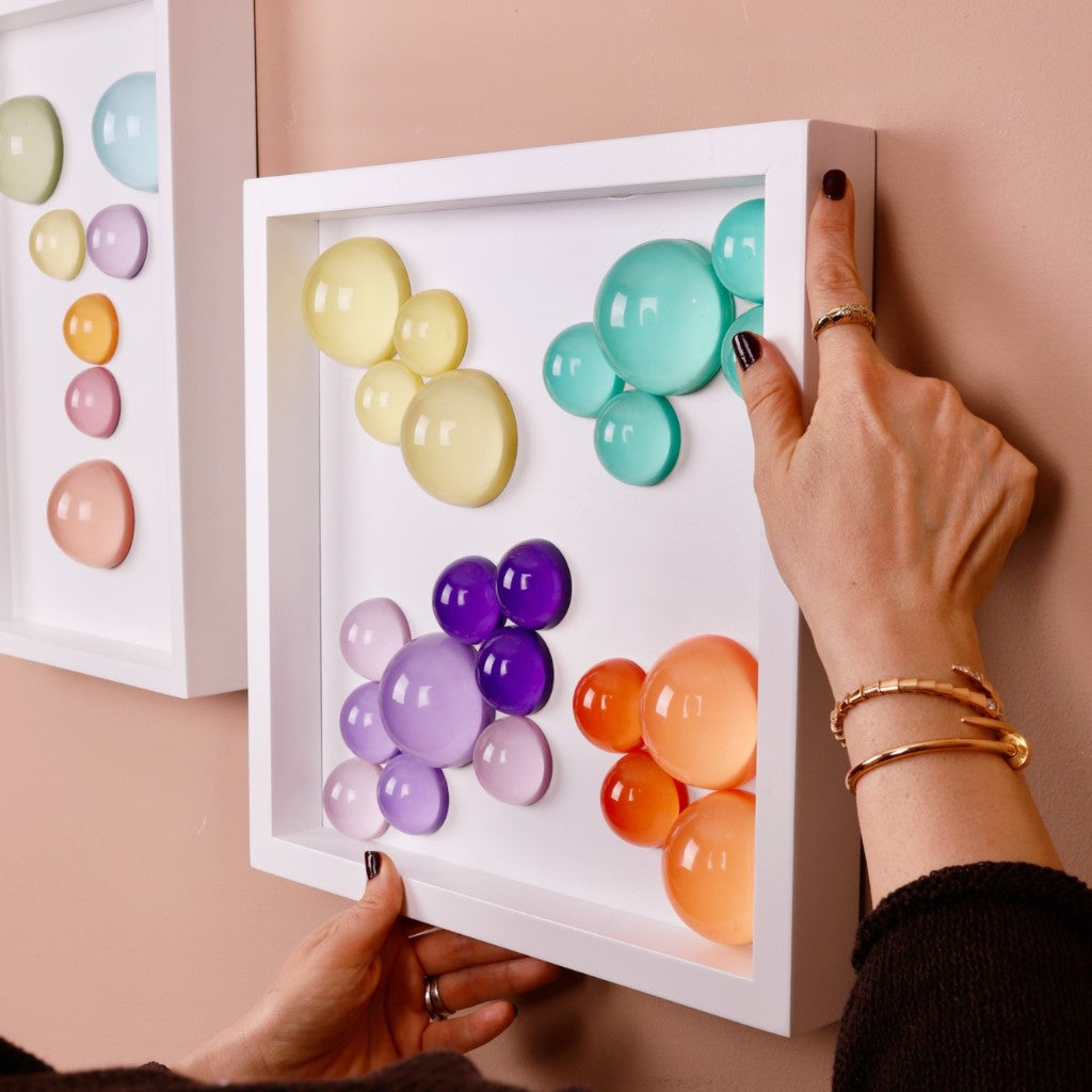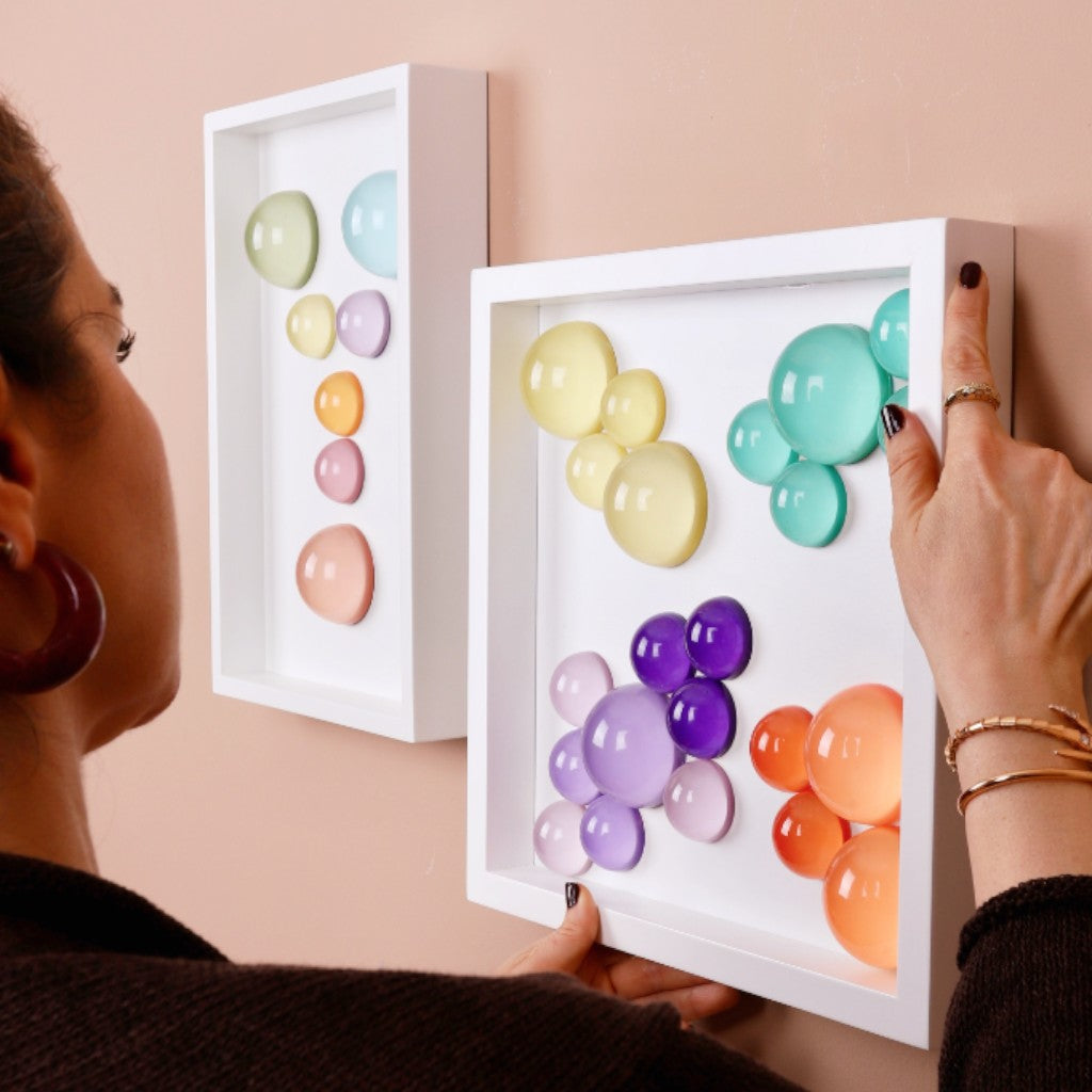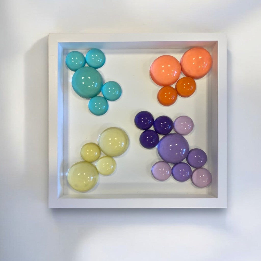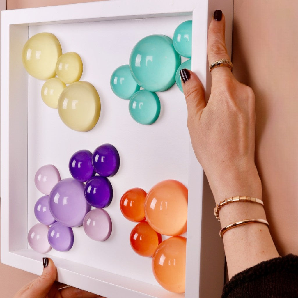 32x32 cm derinlikli kırık beyaz renk çerçeve içine 24 adet irili ufaklı turkuaz, turuncu, sarı ve mor renklerinde “Wallipop” ürününün yerleştirilmesiyle oluşturulmuştur.