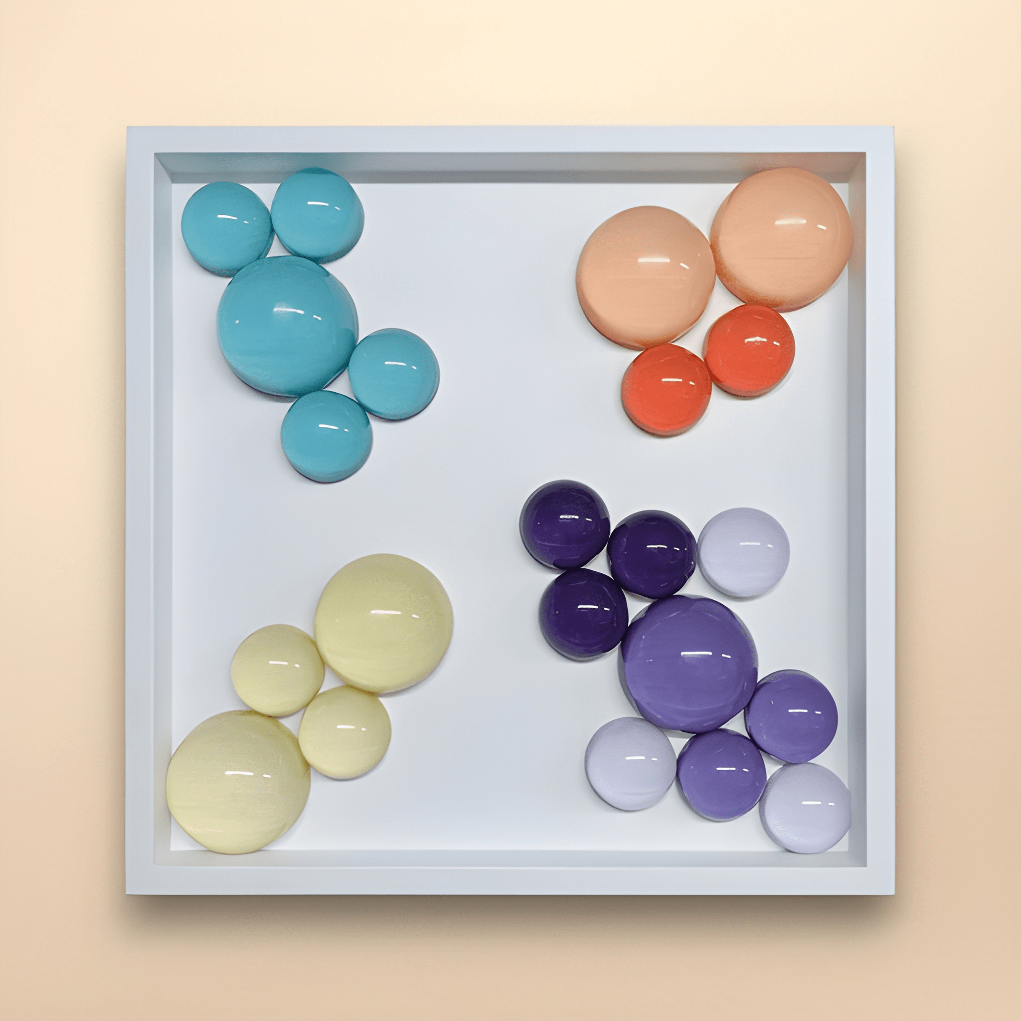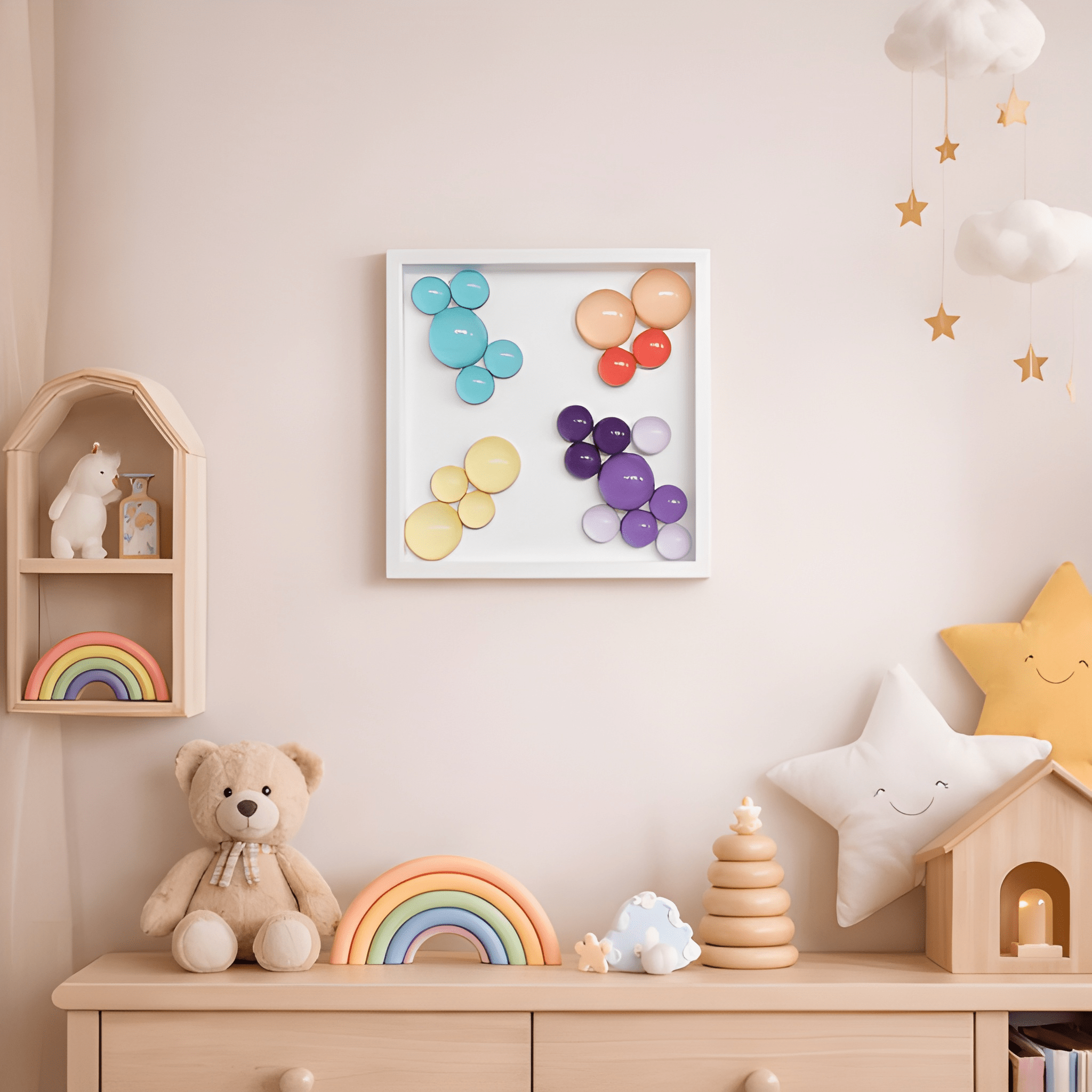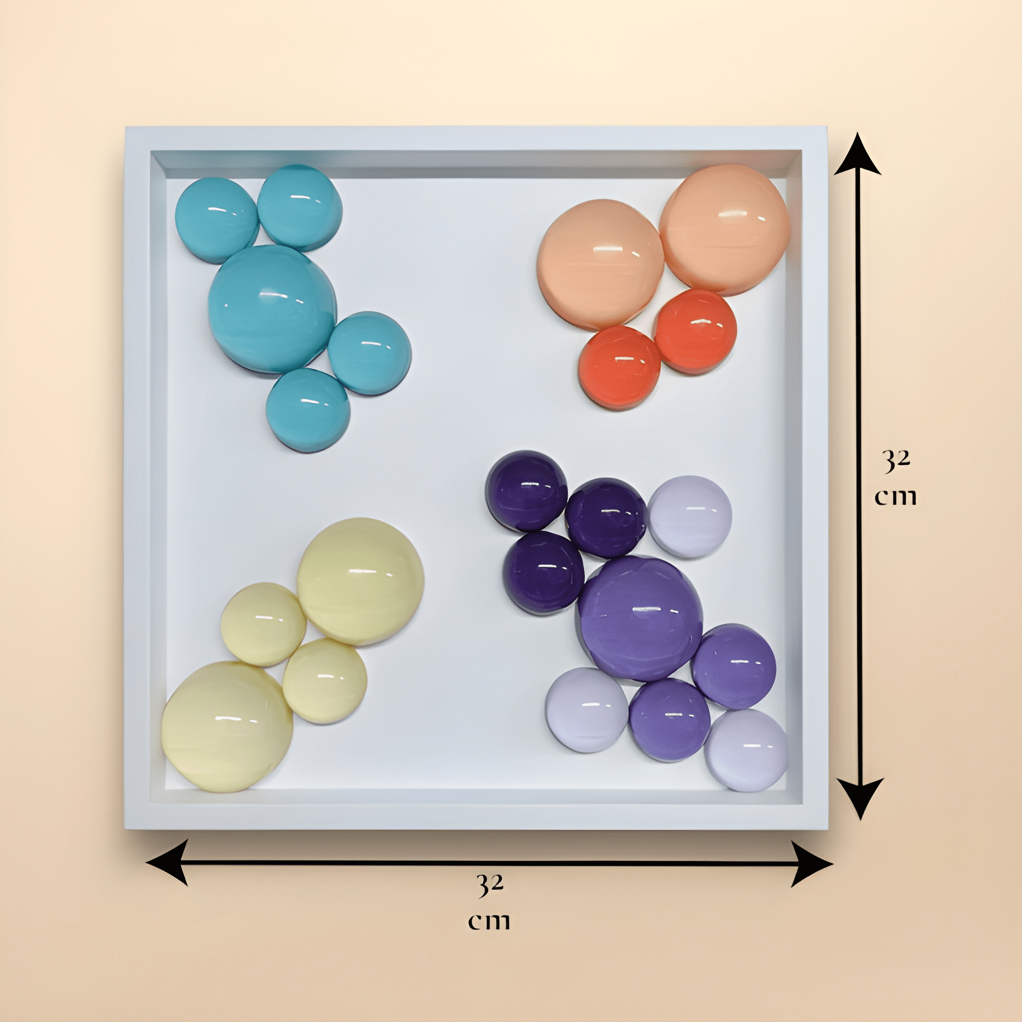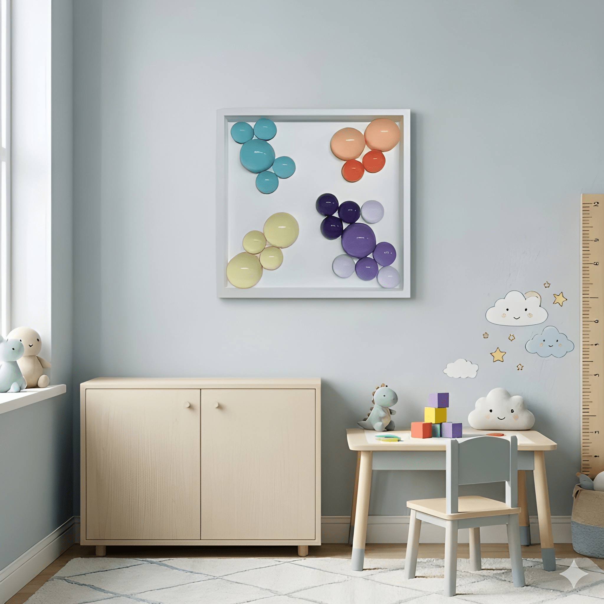 Pastel tonların yumuşak uyumu ve üç boyutlu formuyla tasarlanan Lolliframe Soft, bulunduğu ortama sakin ama karakterli bir dokunuş katar. 32x32 cm ölçülerindeki çerçeve içinde yer alan 6 cm ve 4 cm çapındaki wallipop parçalar, dengeli ama özgür bir yerleşimle bir araya getirilerek modern bir kompozisyon oluşturur. Her bir detay, minimal estetik ile eğlenceli formun kesişiminde durur. Özellikle çocuk odaları, çalışma alanları ve sade dekorasyonlara renk katmak isteyenler için ideal bir tamamlayıcıdır. El yapımı olması sayesinde her parça kendine özgüdür ve bulunduğu alana sıcak bir karakter kazandırır.