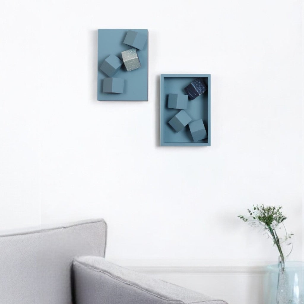 Toplamda 8 adet çapraz kesim “Wallicon” ürününün yerleştirildiği 14x20x4 cm ebatlarında 2 adet ahşap dikdörtgen panonun birinin iç kısmının birinin dış kısmının kullanılmasıyla oluşturulan; kozmik mavi, metalik gece ve buz mavisi tonlarında 2'li settir.
