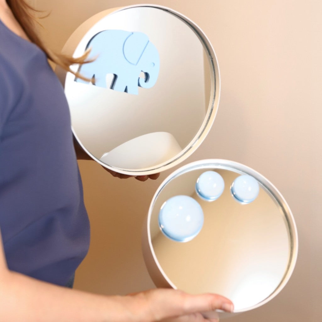 Elektrostatik boyalı beyaz renkli sac levha çerçeve içindeki ayna üzerine ahşap fil figürleri ile üç adet epoksi malzemeden yapılmış yarım kürenin yerleştirilmesiyle oluşturulmuştur. 3'lü settir.