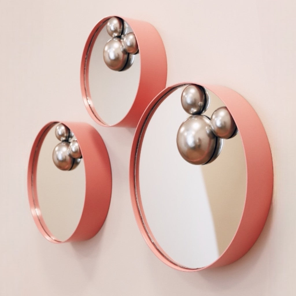 Elektrostatik boyalı pembe renkli sac levha çerçeve içindeki ayna üzerine epoksi malzemeden yapılmış yarım kürelerin yerleştirilmesiyle oluşturulmuştur. 3'lü settir.