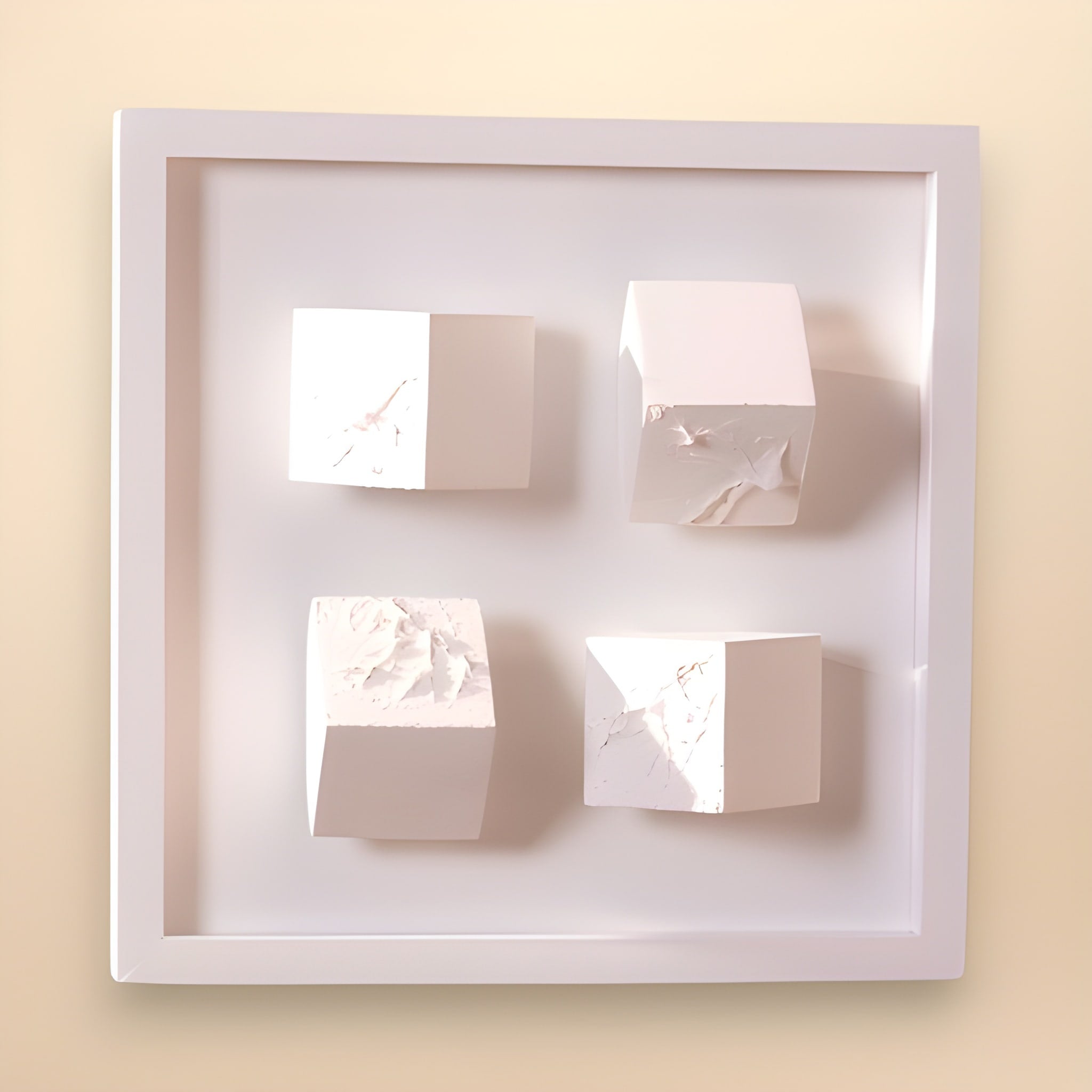 Kırık beyaz derinlikli çerçeve içine yerleştirilmiş 4 adet çapraz kesilmiş ve tek yüzü dokulu küp bulunmaktadır.