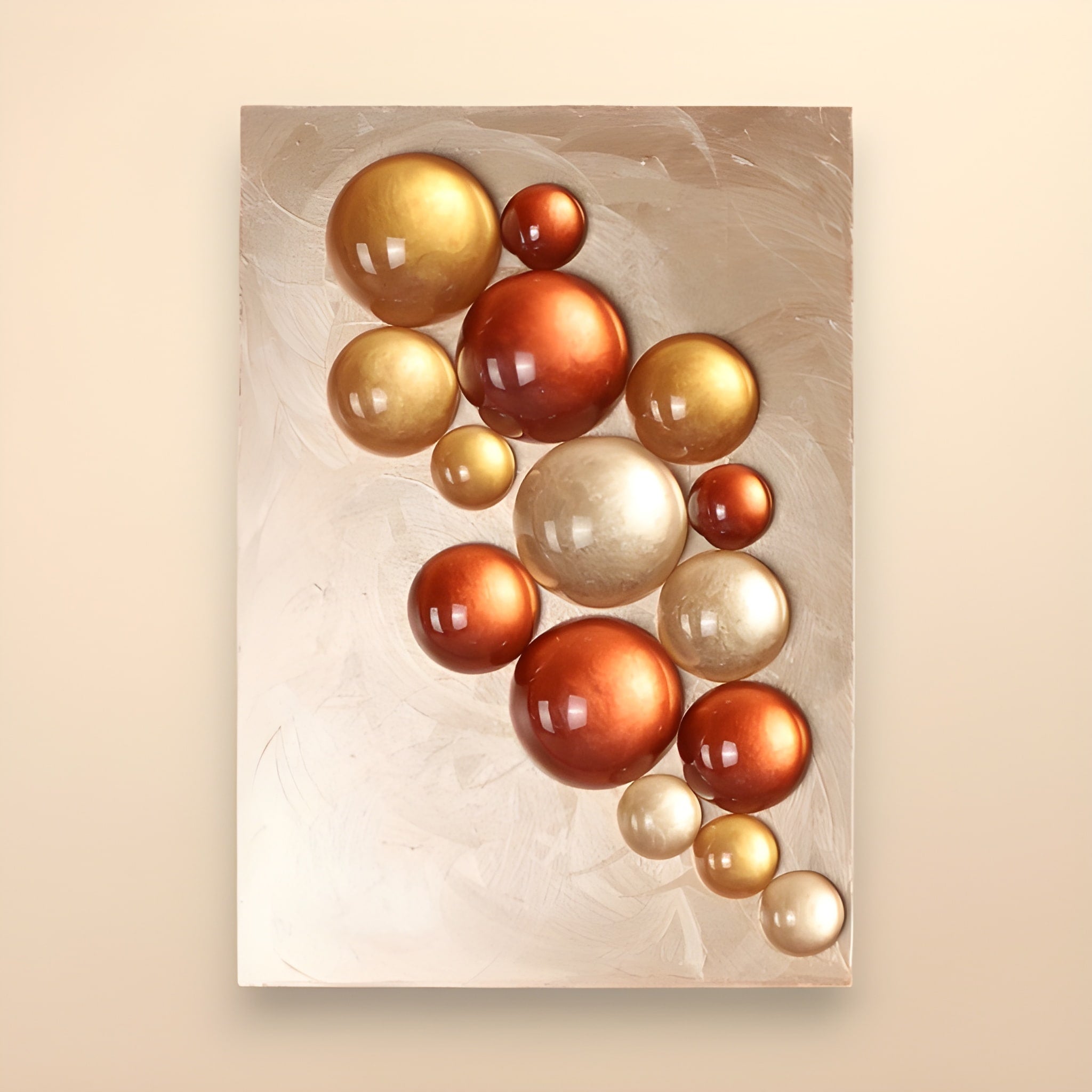 Reçine özlü malzemeden ve renklendirmeleri iç yüzeylerinden yapılmış 4 cm, 6 cm ve 8 cm yarım kürelerin, dokulu boyanmış ahşap pano üzerine yerleştirilmesiyle oluşturulmuştur.