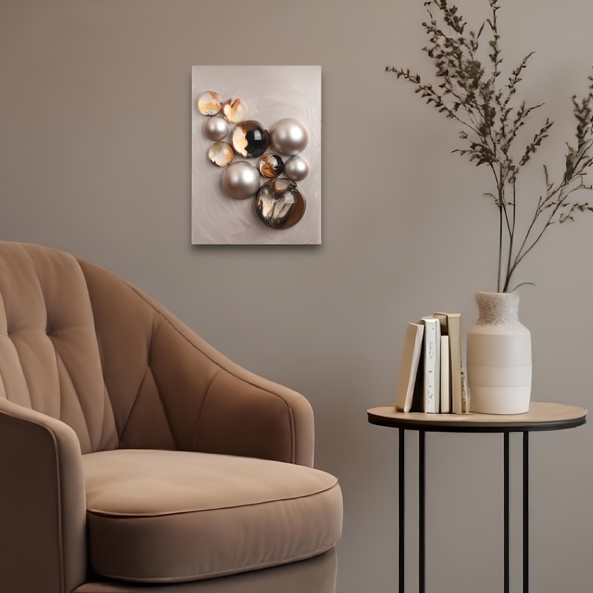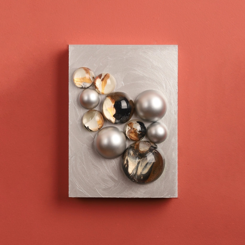 Reçine özlü malzemeden; renklendirmeleri dış yüzeylerinden yapılmış 4 cm, 6 cm ve 8 cm çaplarında “Wallipop Silver” ürünleri ile içlerine orijinal resim yerleştirilmiş “Wallipop Art” ürünlerinin, dokulu boyanmış ahşap pano üzerine yerleştirilmesiyle oluşturulmuştur.