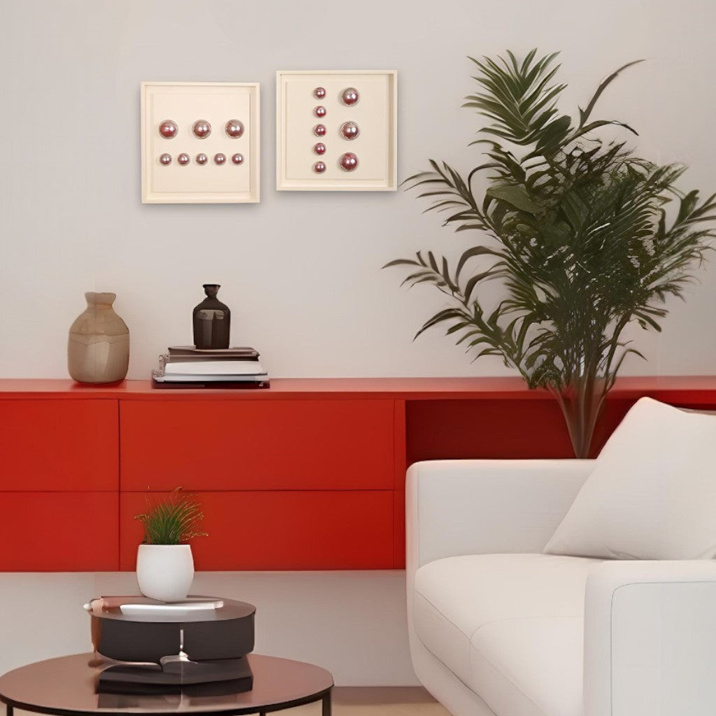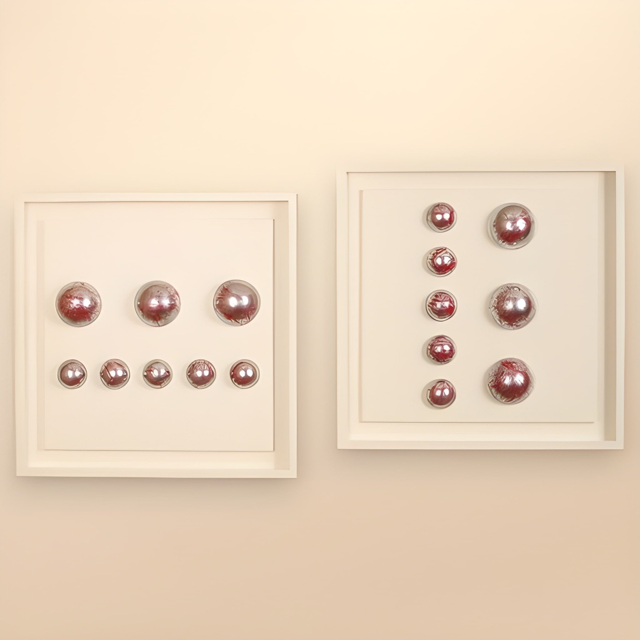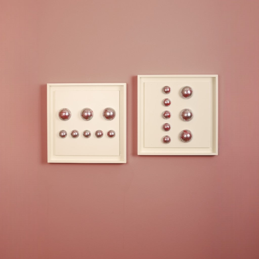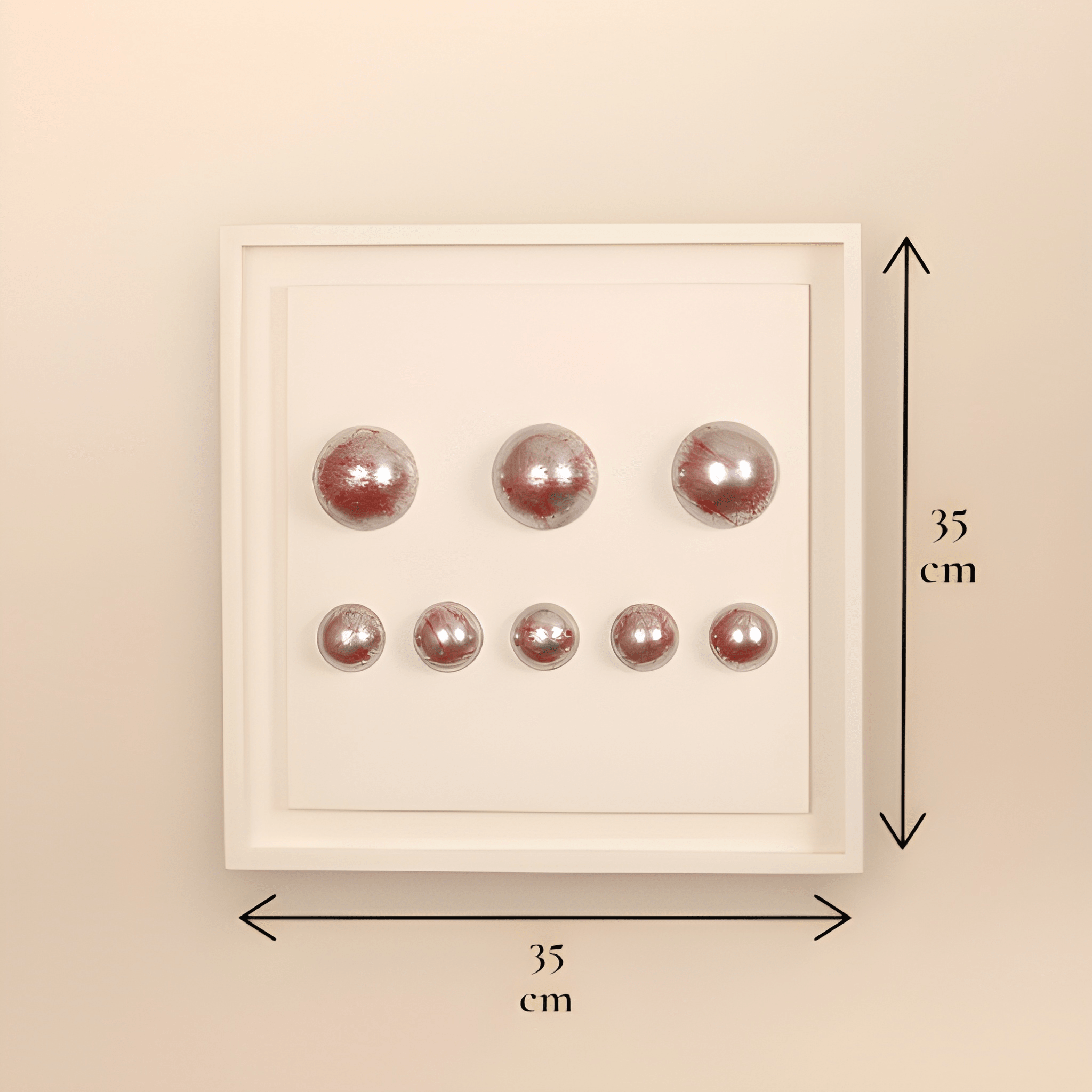 5 adet 4 cm çapında ve 3 adet 6 cm çapında kırmızı renk boya sıçratılmış görünümünde gümüş renk “Wallipop” ürünlerinin yerleştirilmiş olduğu; 35x35 cm ebatlarında ve kırık beyaz renginde 2 adet derinlikli çerçeveden oluşmaktadır.