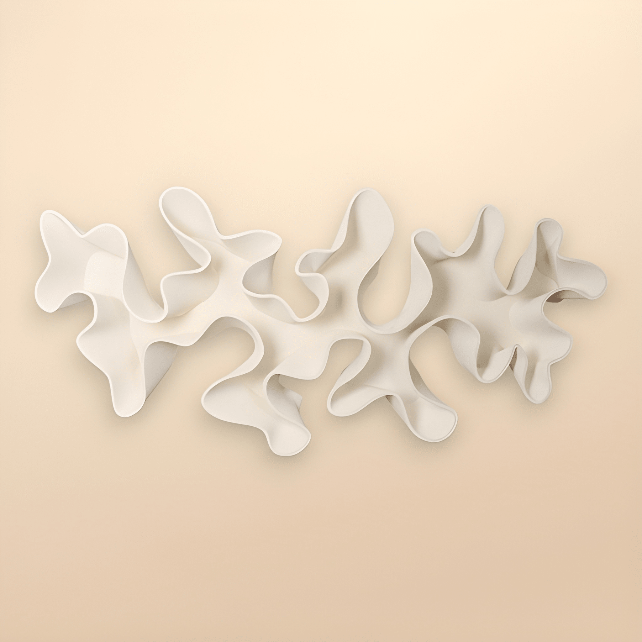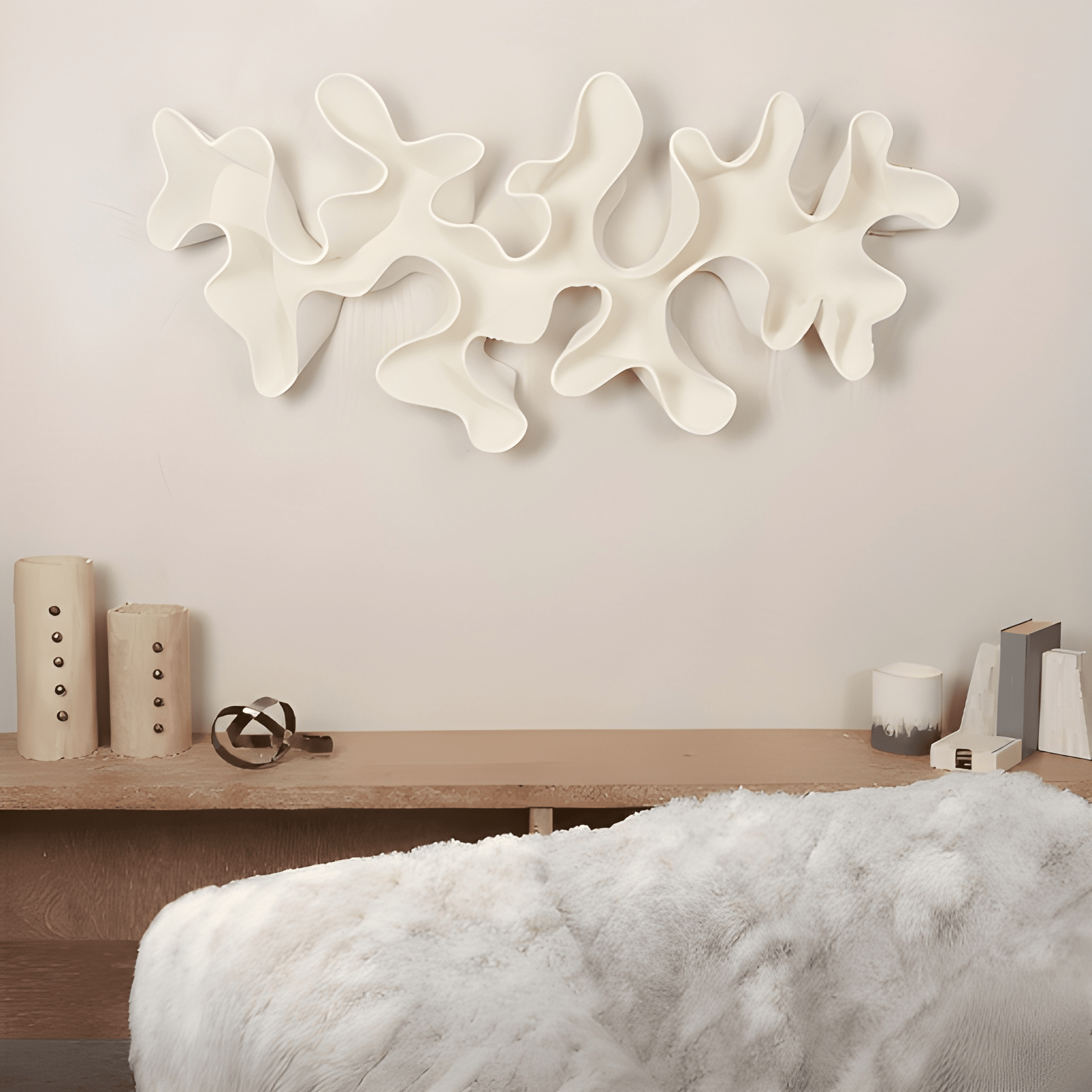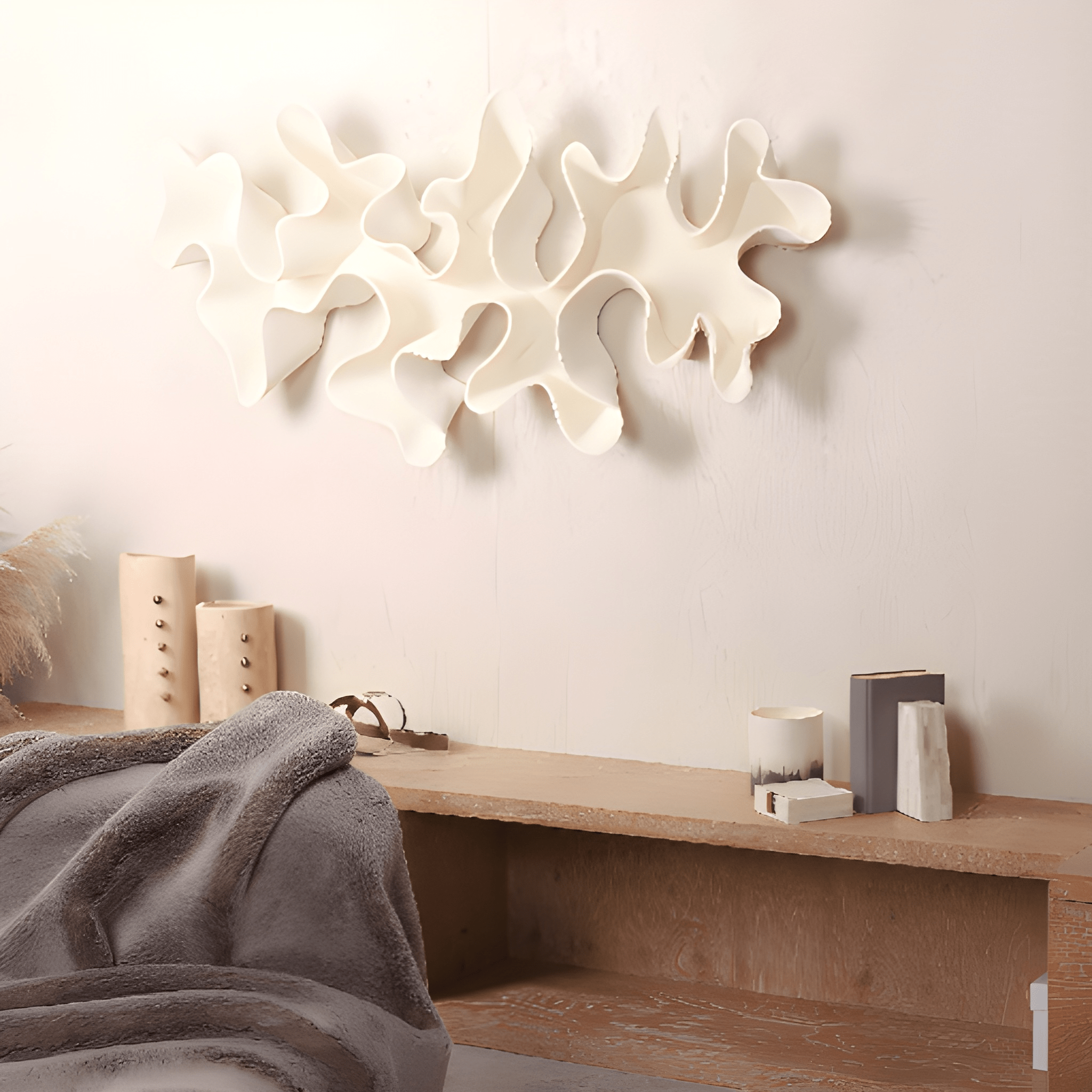 145x68x11 cm boyutlarında olan bu parça, poliüretan malzemeden üretilmiş, dayanıklı ve dekoratif objedir. Organik formu sayesinde mekâna hareket ve derinlik katar. Yüzeyi, yüksek dayanımlı sprey boya tamamlanarak mat, dokulu bir görünüm elde edilmiştir.