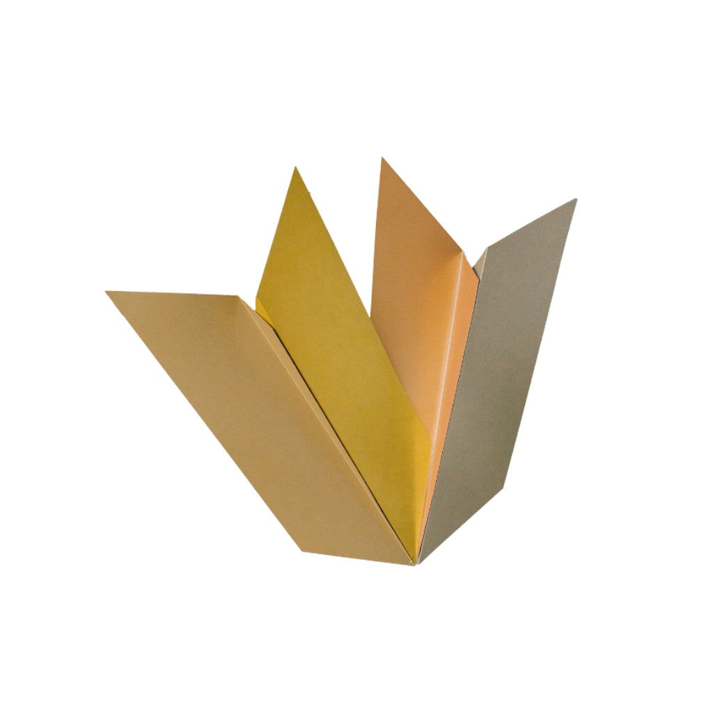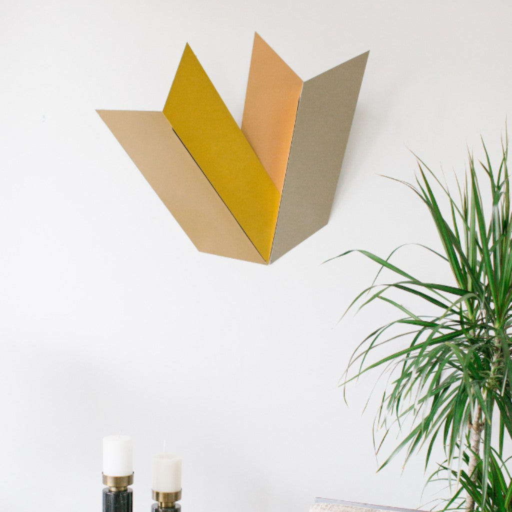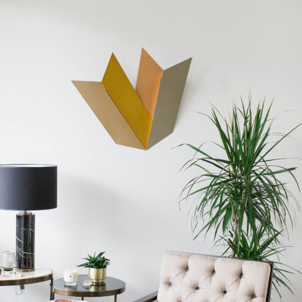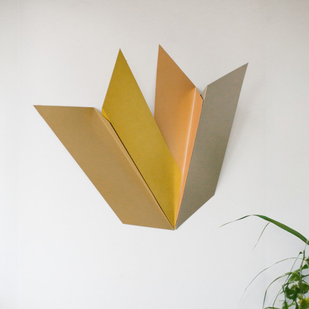Bronz, altın, yeşil altın ve vizon renklerinden oluşan elektrostatik boyalı metal formlardan oluşan kompozisyondur.