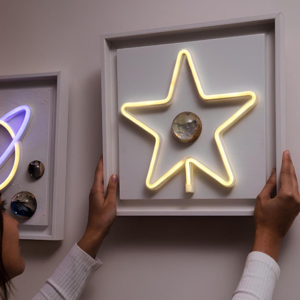 32x32 cm derinlikli kırık beyaz renk çerçeve içine pilli özel sistemiyle yerleştirilmiş “yıldız” formundaki sıcak sarı neon ışık ile 1 adet Wallipop Art ürününün birleştirilmesiyle oluşturulmuştur.