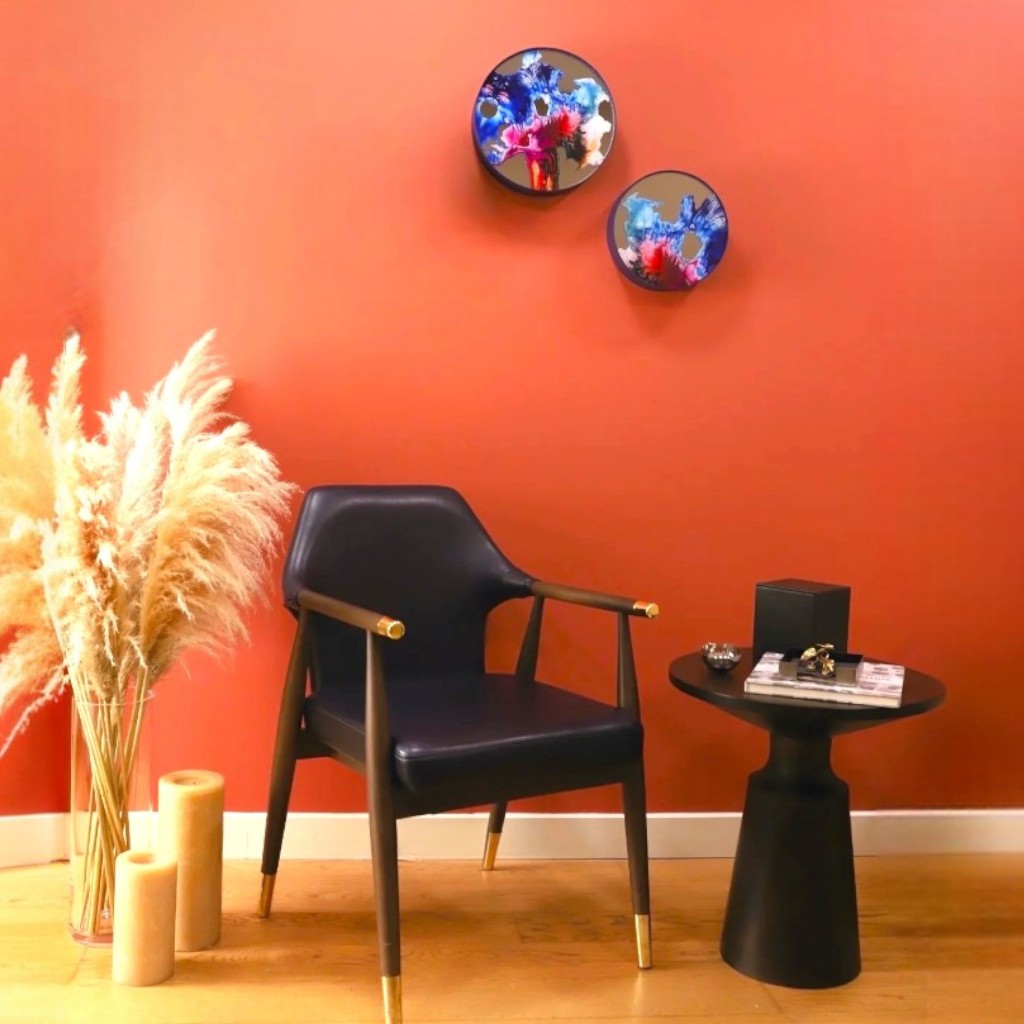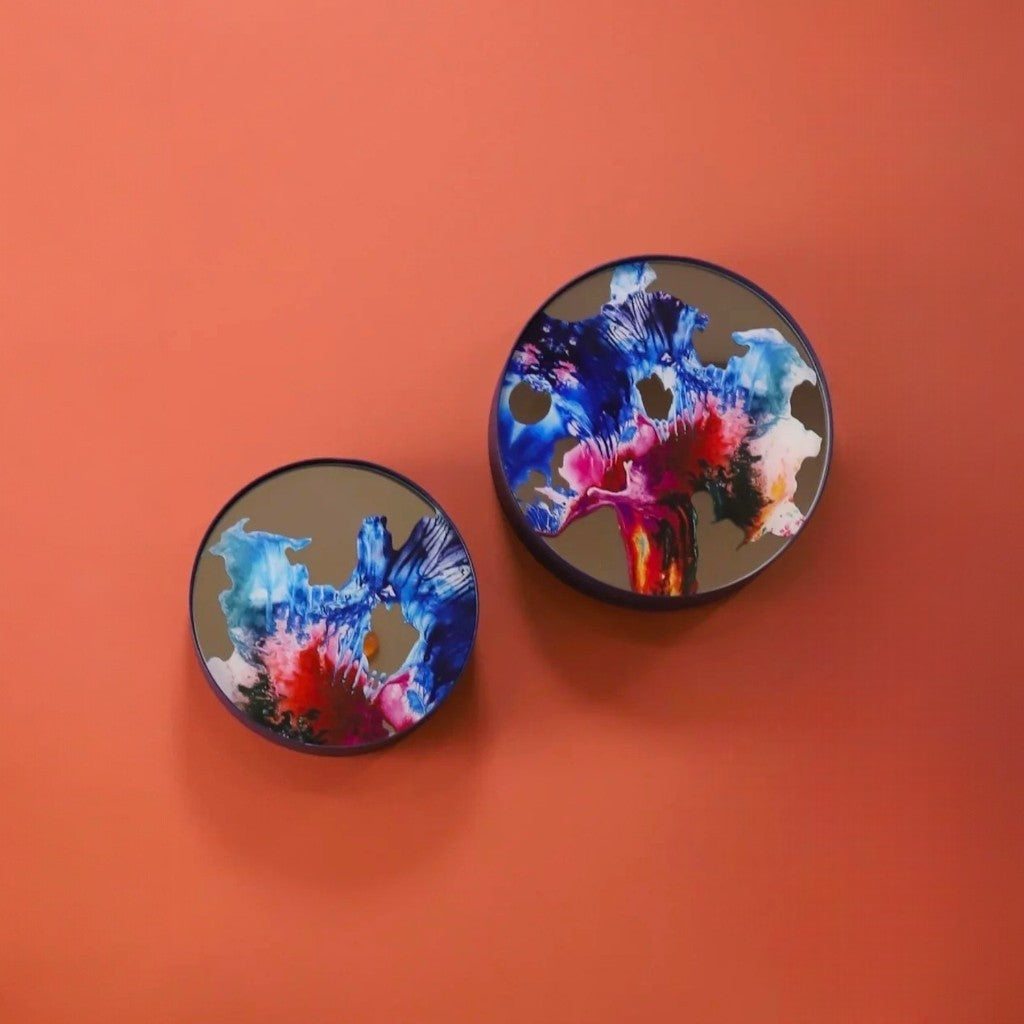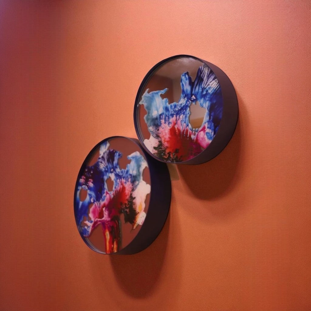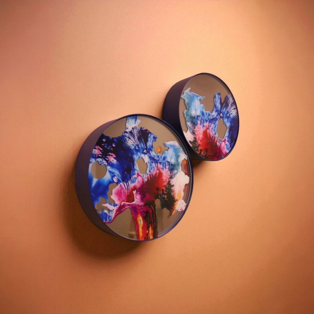 Elektrostatik tekstüre boyalı lacivert renkli metal levha çerçeve içine yerleştirilen ayna üzerine Melis Önalan Altıparmak’a ait görsel, dijital baskı ile uygulanmıştır. 2’li settir
