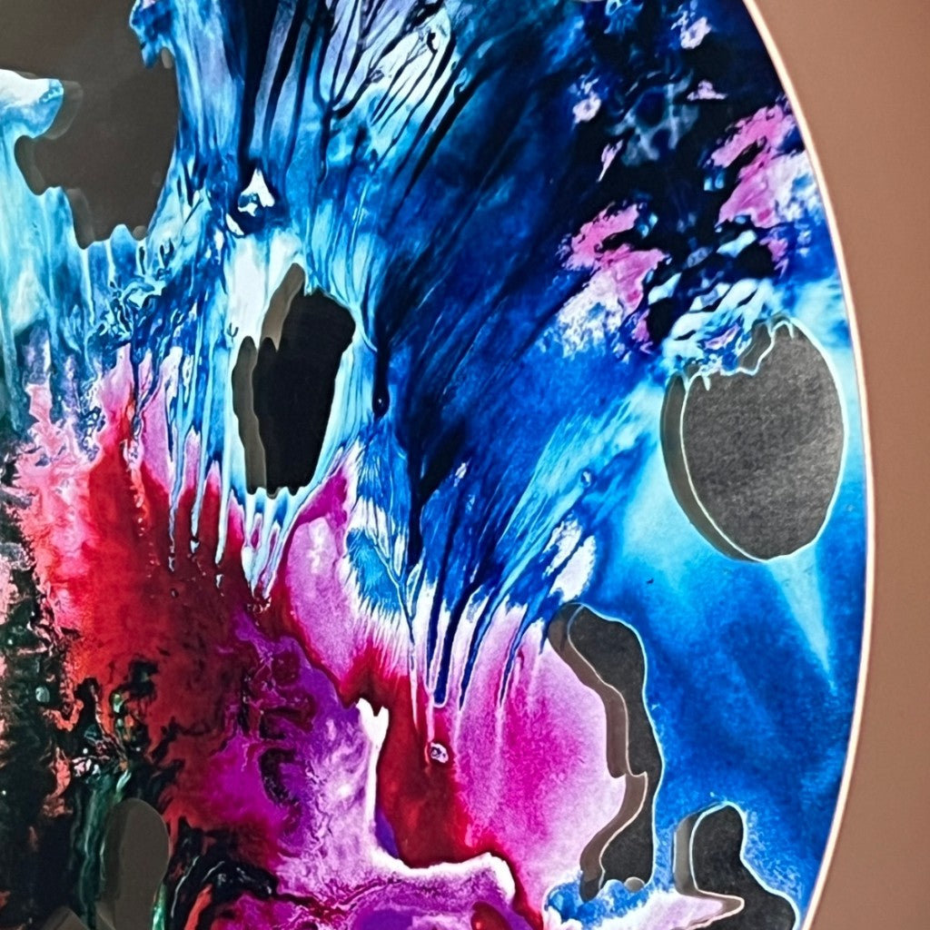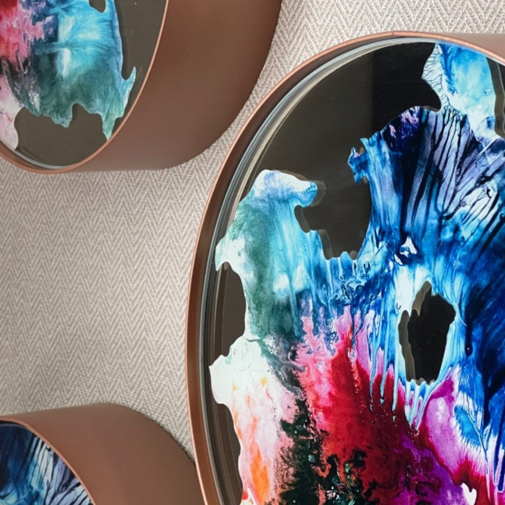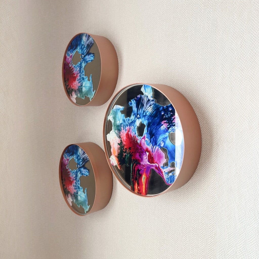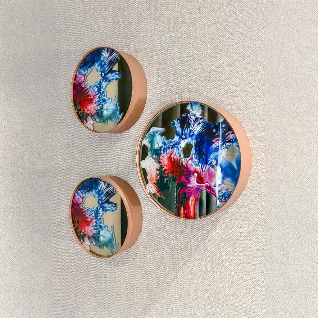Elektrostatik bronz renk boyalı sac levha çerçeve içine yerleştirilen ayna üzerine Melis Önalan Altıparmak’a ait görsel dijital baskı yoluyla uygulanmıştır. 3'lü settir.