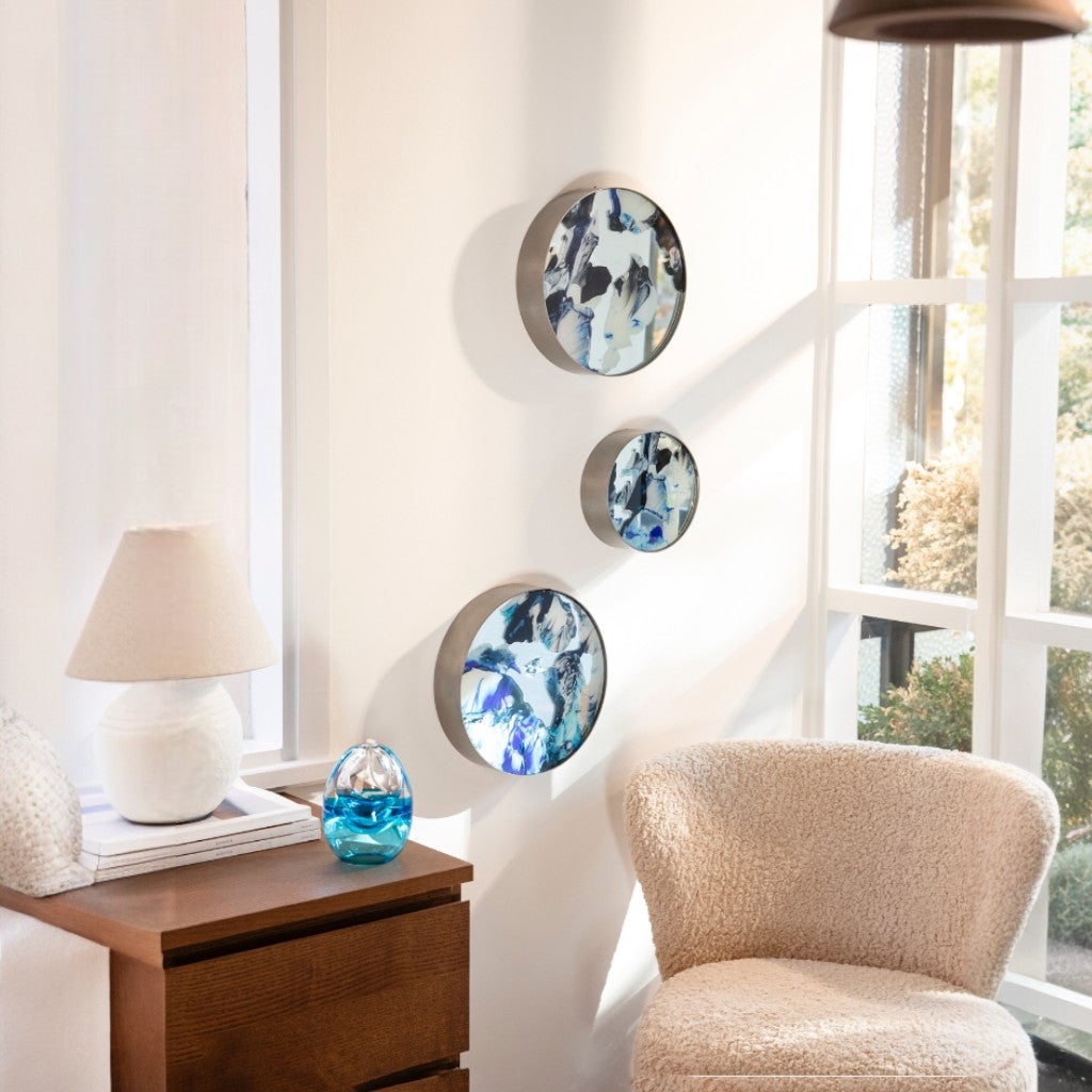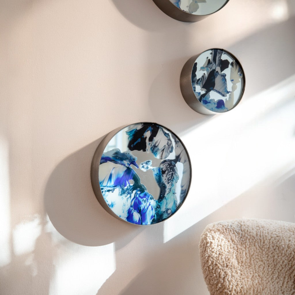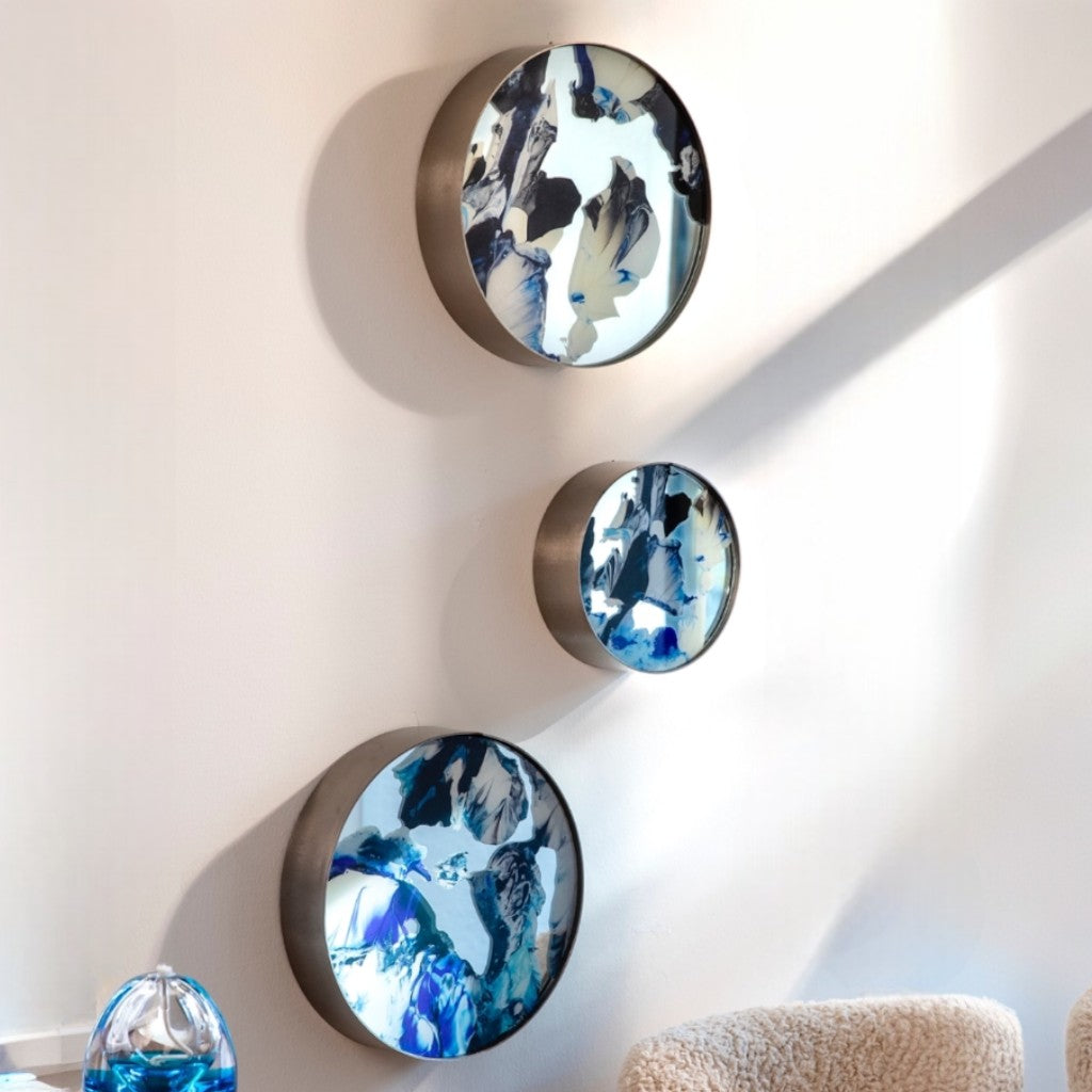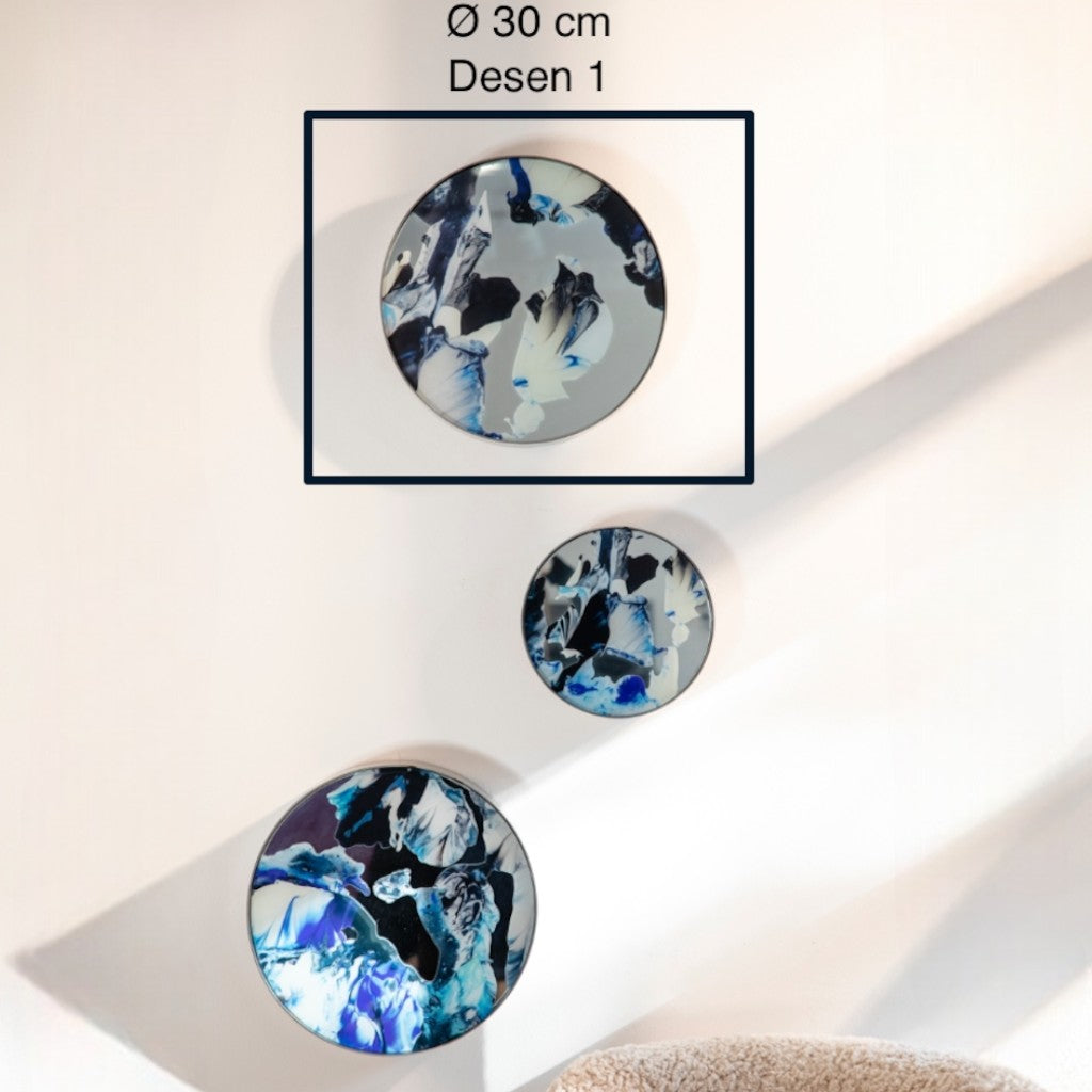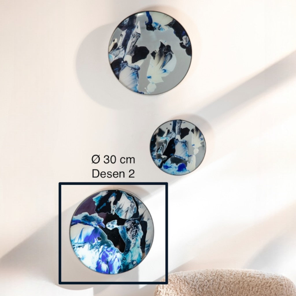 Gümüş renk metal çerçeve içine yerleştirilen ayna üzerine mavi tonlarının hakim olduğu Melis Önalan Altıparmak’a ait görsel, dijital baskı ile uygulanmıştır. 3'lü settir.