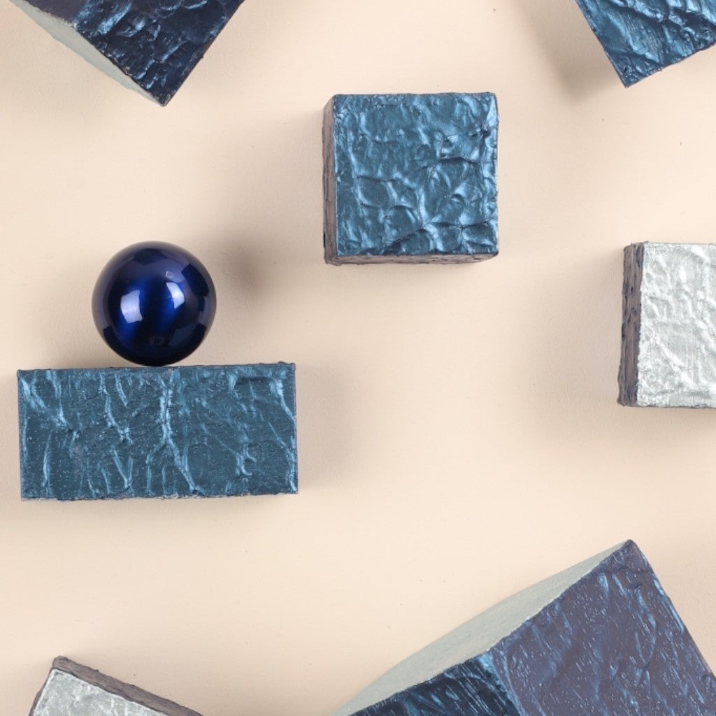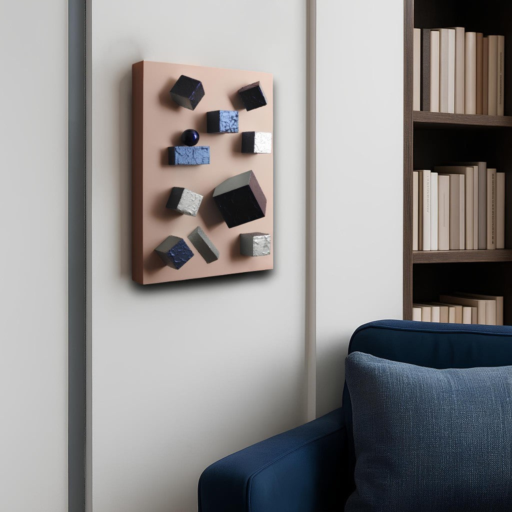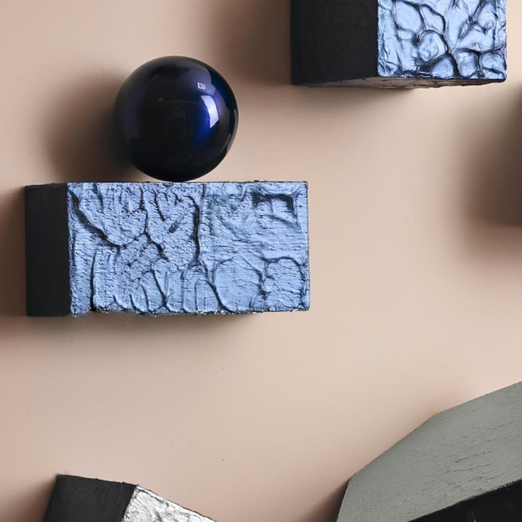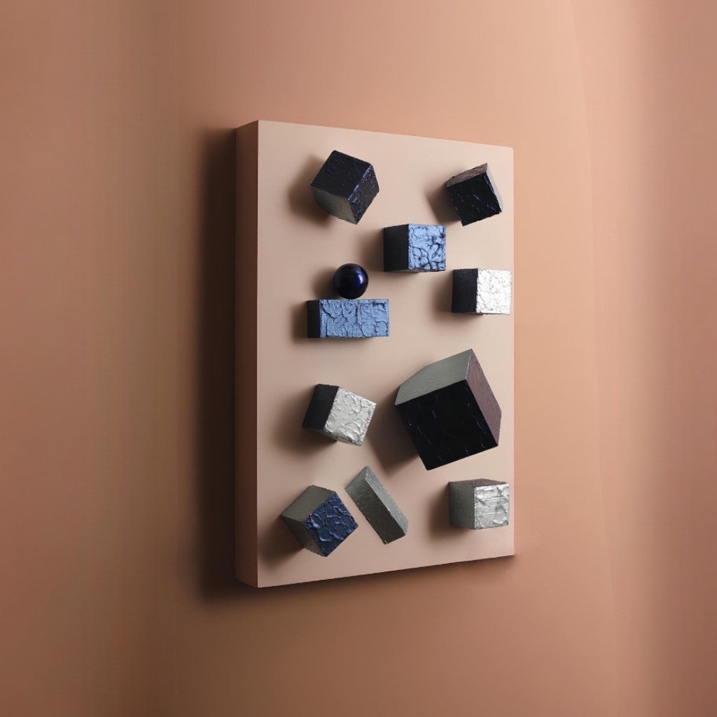 2 adet küçük ve 1 adet büyük tek köşesinden çapraz kesilmiş; ayrıca 5 adet düz kesim metalik gece mavisi ve metalik buz mavi tonlarında iki renk karışık boyanmış “Wallicon” ürünlerine iki adet düz ve köşeli kesim dikdörtgen parçanın ve 3,2 cm metalik kürenin eşlik ettiği; 28x20x4 cm ebatlarında ve krem renginde ahşap üç boyutlu dikdörtgen panodur.