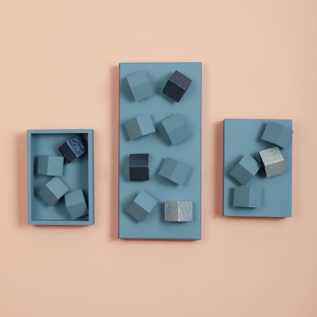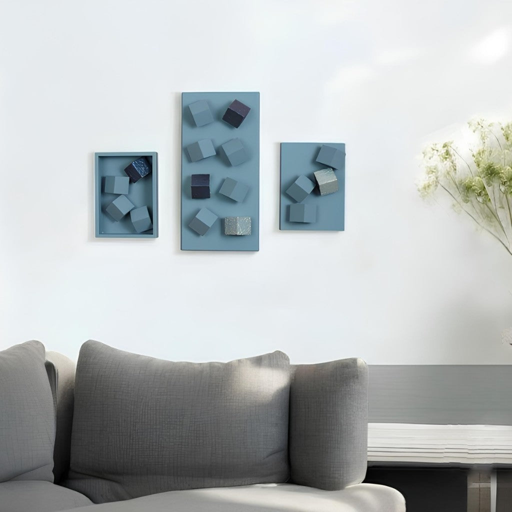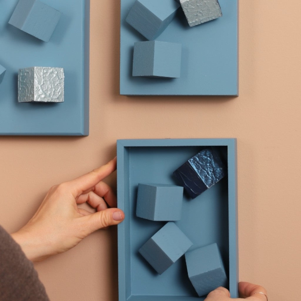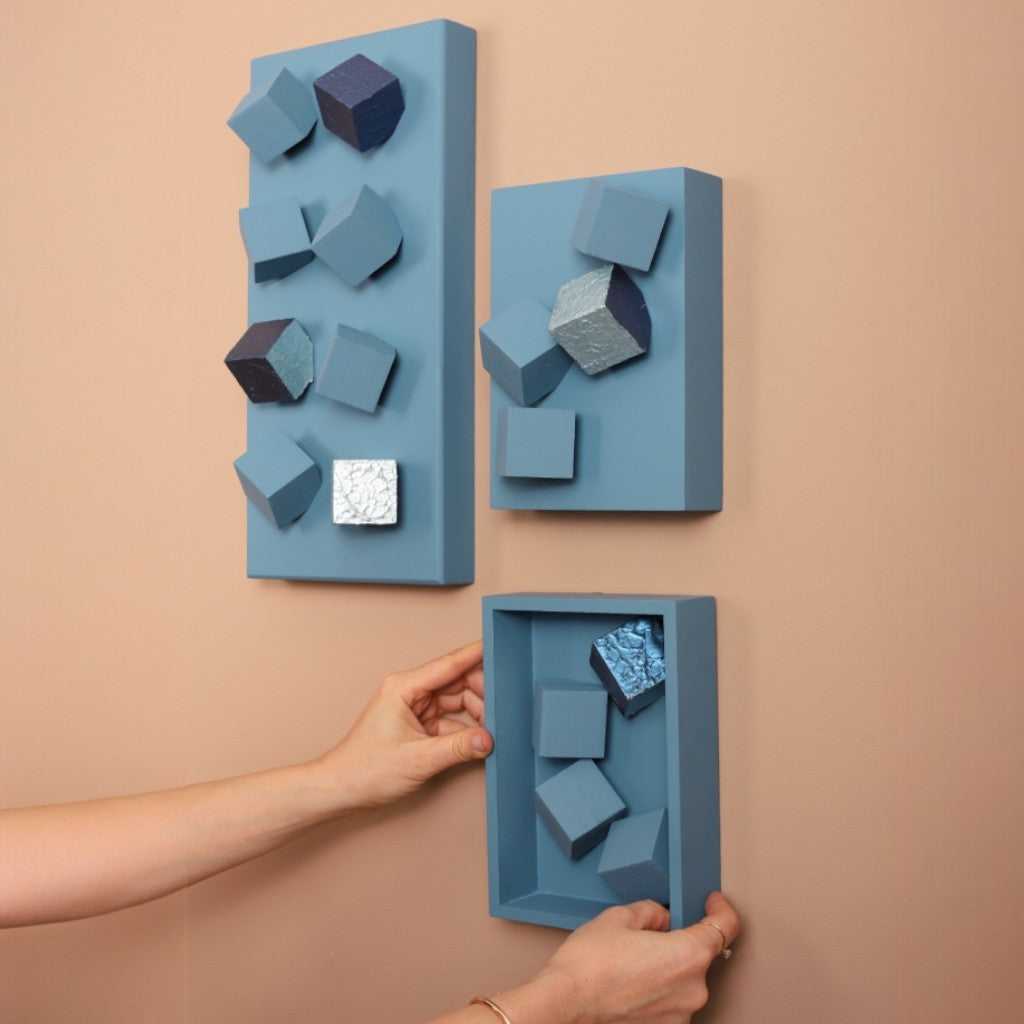 8 adet çapraz kesim “Wallicon” ürününün yerleştirildiği 18x37x4 cm ebatlarında 1 adet; 4 adet çapraz kesim “Wallicon” ürününün yerleştirildiği 14x20x4 cm ebatlarında 2 adet ahşap dikdörtgen panodan oluşan, kozmik mavi, metalik gece ve buz mavisi tonlarında 3’lü settir.