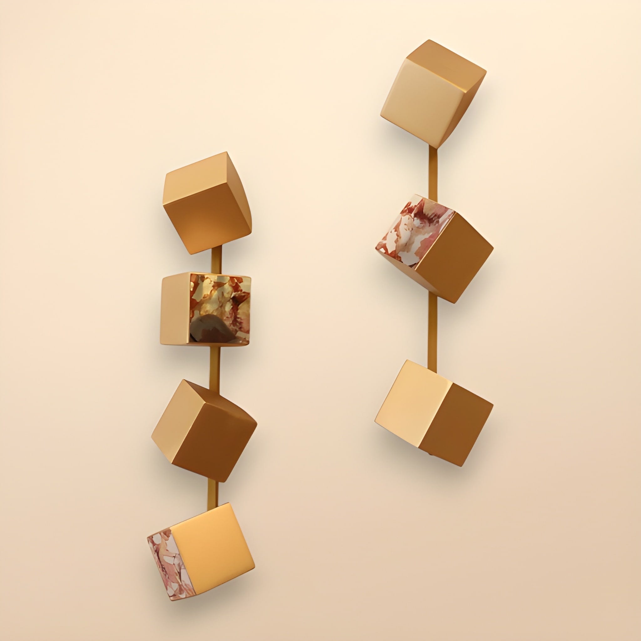 2 adet gold renkli demir kutu profilden oluşmaktadır. Bir profil üzerinde 4; diğeri üzerinde ise 3 adet çapraz kesim küp bulunmaktadır. Küplerin dördü düz gold renk boyalıdır. Diğer üçünün bir yüzünde, üzerinde Melis Önalan Altıparmak'ın çalışmasının baskısının bulunduğu metal plaka bulunmaktadır. 2'li settir.