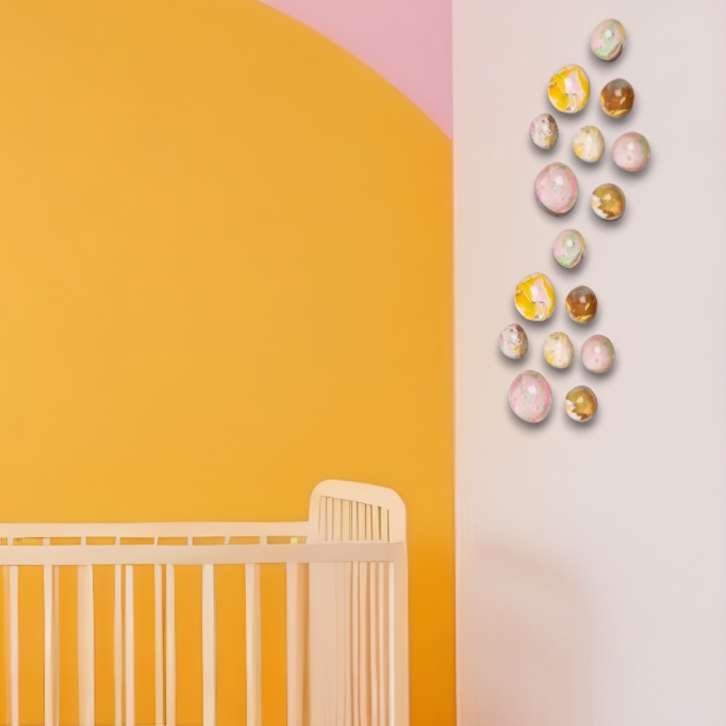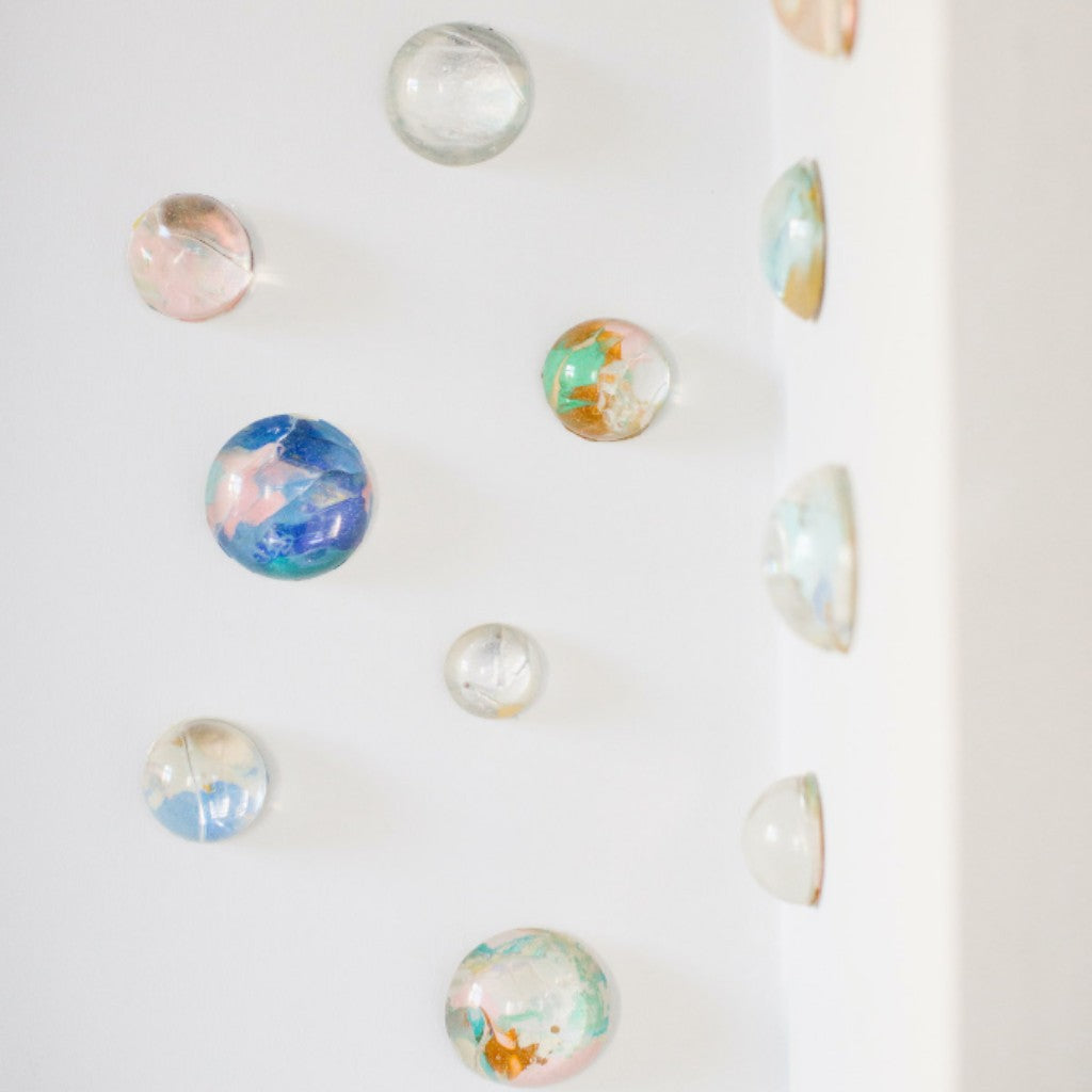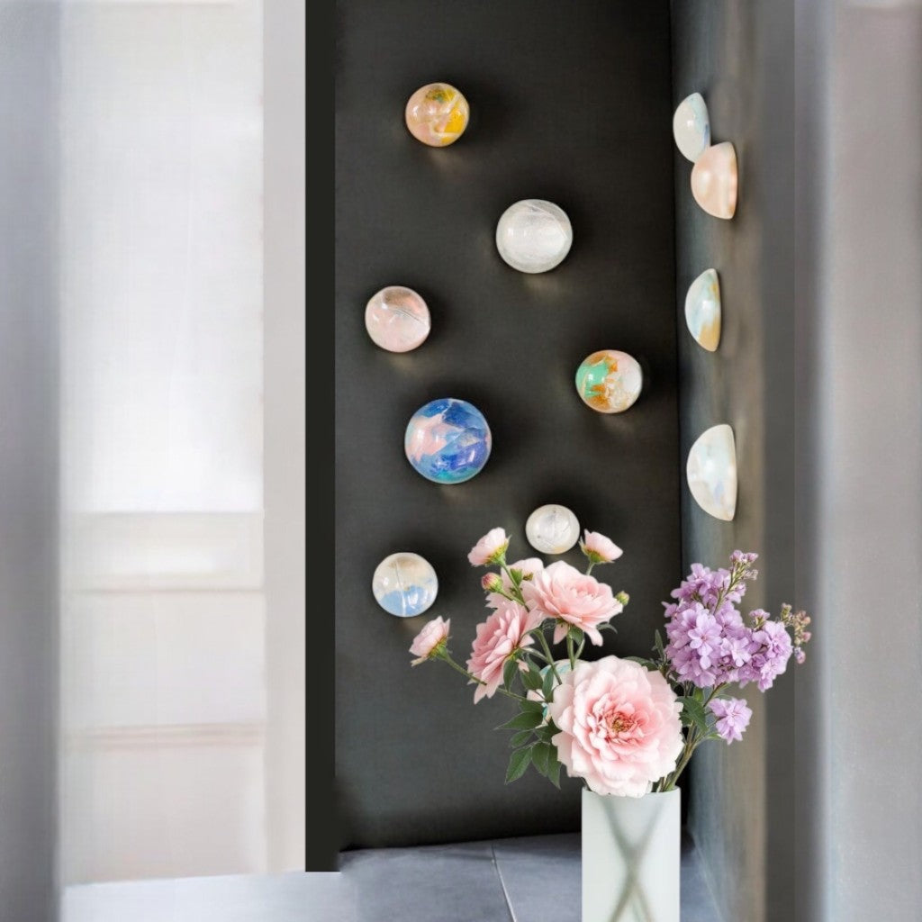 Doğal özlü malzemenin sertleştirilmesi ile kırılmaz hale getirilmiş yarım küreler, alt yüzeyine ressam Melis Önalan Altıparmak'a ait orijinal resimlerden parçalar eklenerek oluşturulmuş duvar dekorlarıdır. Resimlerden alınan orijinal parçalar benzersiz olduğundan setlerin hiçbiri birbirinin tekrarı değildir. Kendi içlerinde de hepsi birbirine uyumlu renklerde olup, her biri bir diğerinden farklılardır. Not: Yarım kürelerin desen kısımlarına denk gelen kısımda kesikler oluşabilmektedir. Bu baloncuklar malzemenin doğal sonucu olarak ürünün doğasında bulunan özelliklerdir. 24'lü settir.