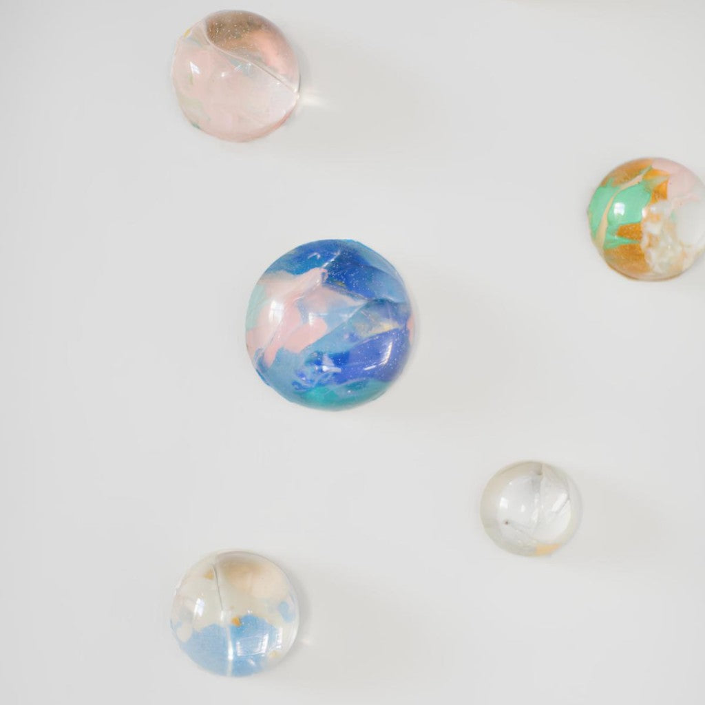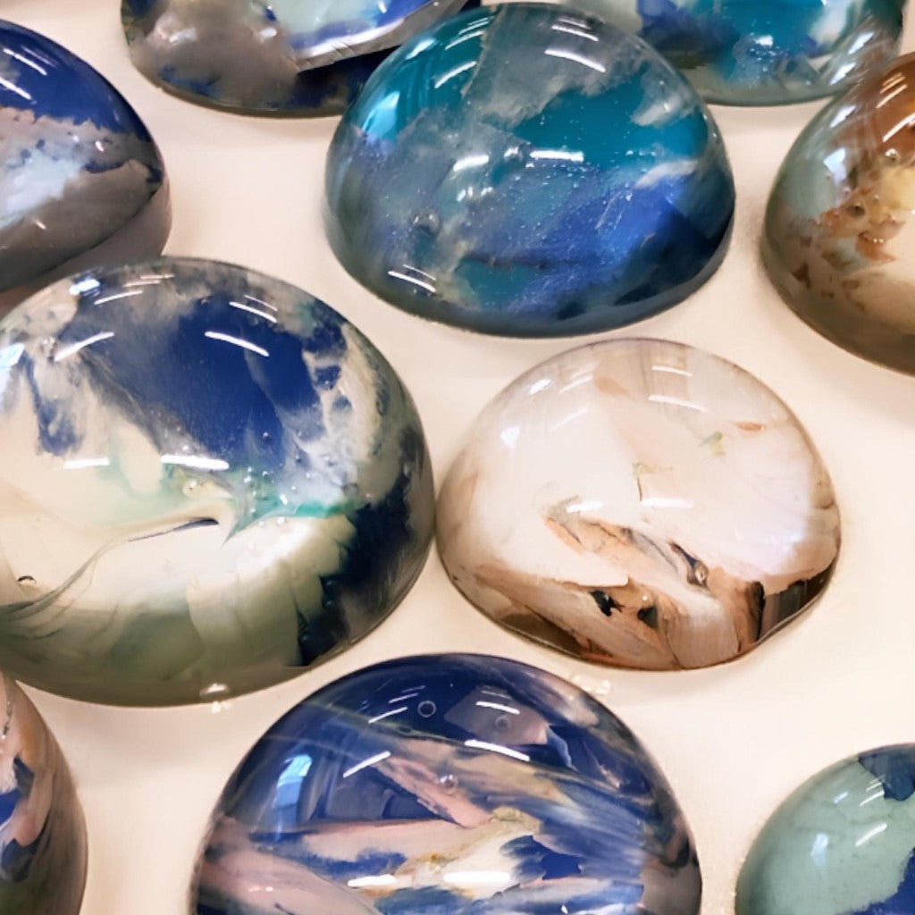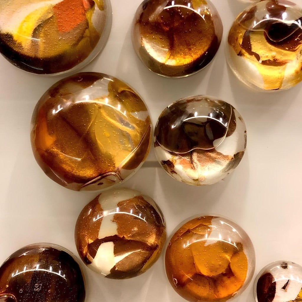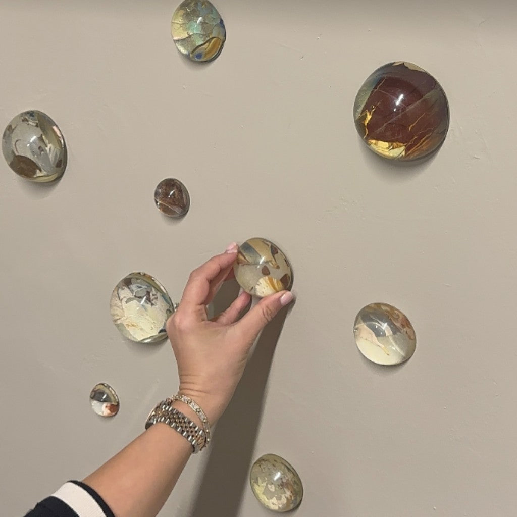 Doğal özlü malzemenin sertleştirilmesi ile kırılmaz hale getirilmiş yarım küreler, alt yüzeyine ressam Melis Önalan Altıparmak'a ait orijinal resimlerden parçalar eklenerek oluşturulmuş duvar dekorlarıdır. Resimlerden alınan orijinal parçalar benzersiz olduğundan setlerin hiçbiri birbirinin tekrarı değildir. Kendi içlerinde de hepsi birbirine uyumlu renklerde olup, her biri bir diğerinden farklılardır. Not: Yarım kürelerin desen kısımlarına denk gelen kısımda kesikler oluşabilmektedir. Bu baloncuklar malzemenin doğal sonucu olarak ürünün doğasında bulunan özelliklerdir. 24'lü settir.