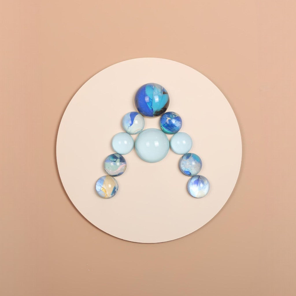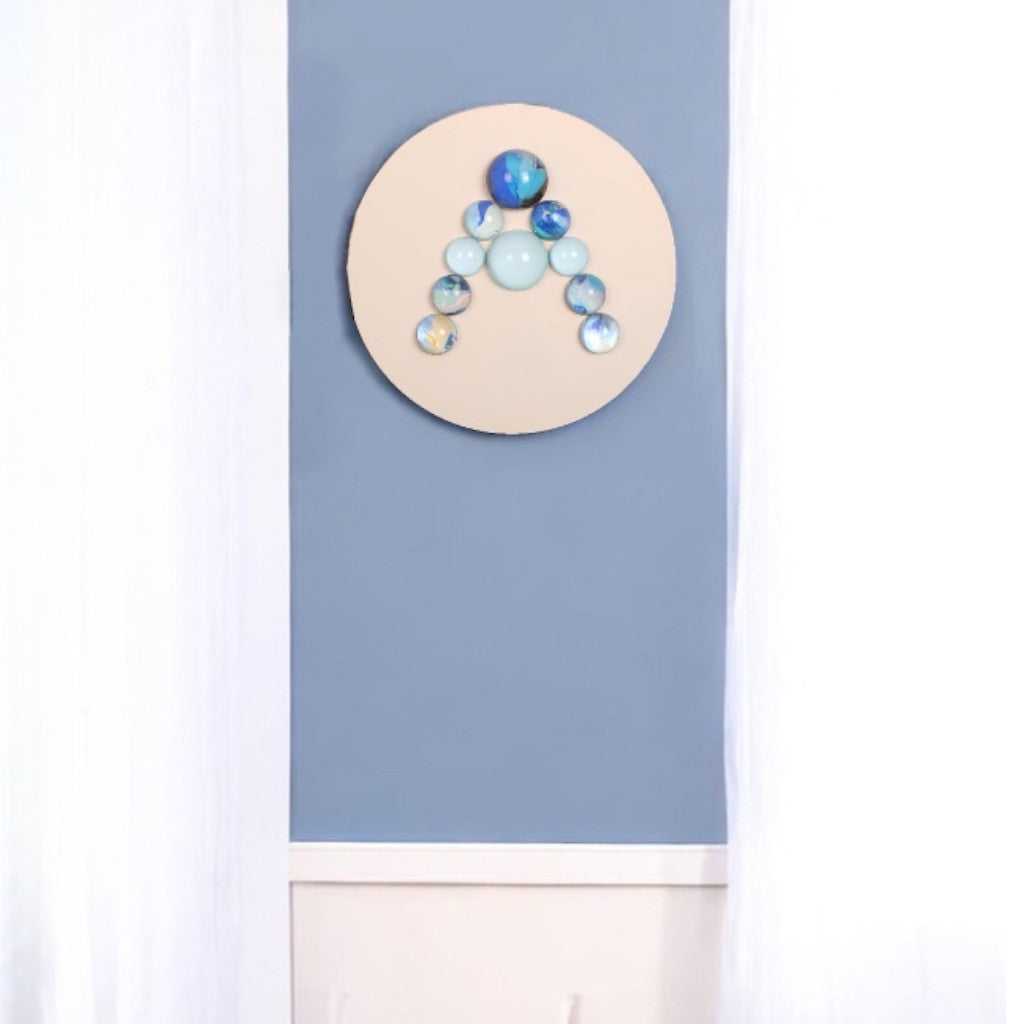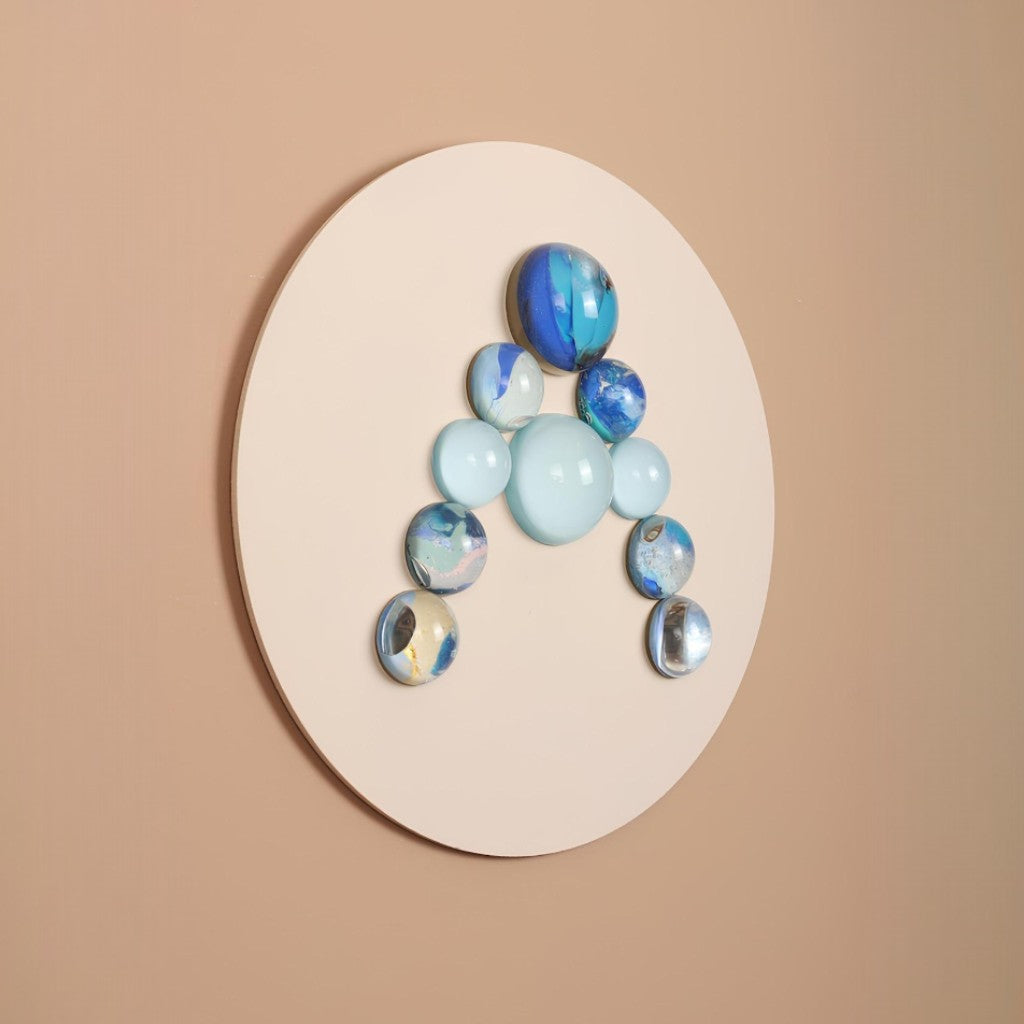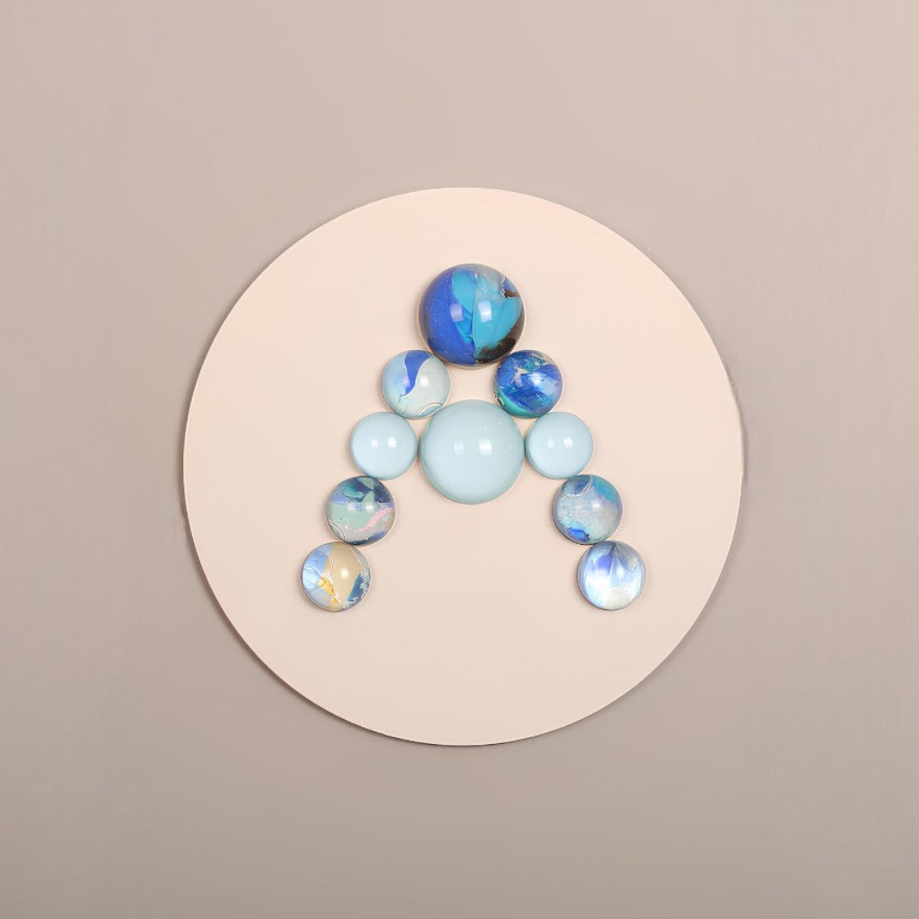 32 cm çapında ahşap yuvarlak duvar panosu üzerine orjinal boya çalışmalarının içlerine yerleştirildiği yarım kürelerin harf formunu oluşturacak şekilde düzenlenmesiyle oluşturulmuştur.