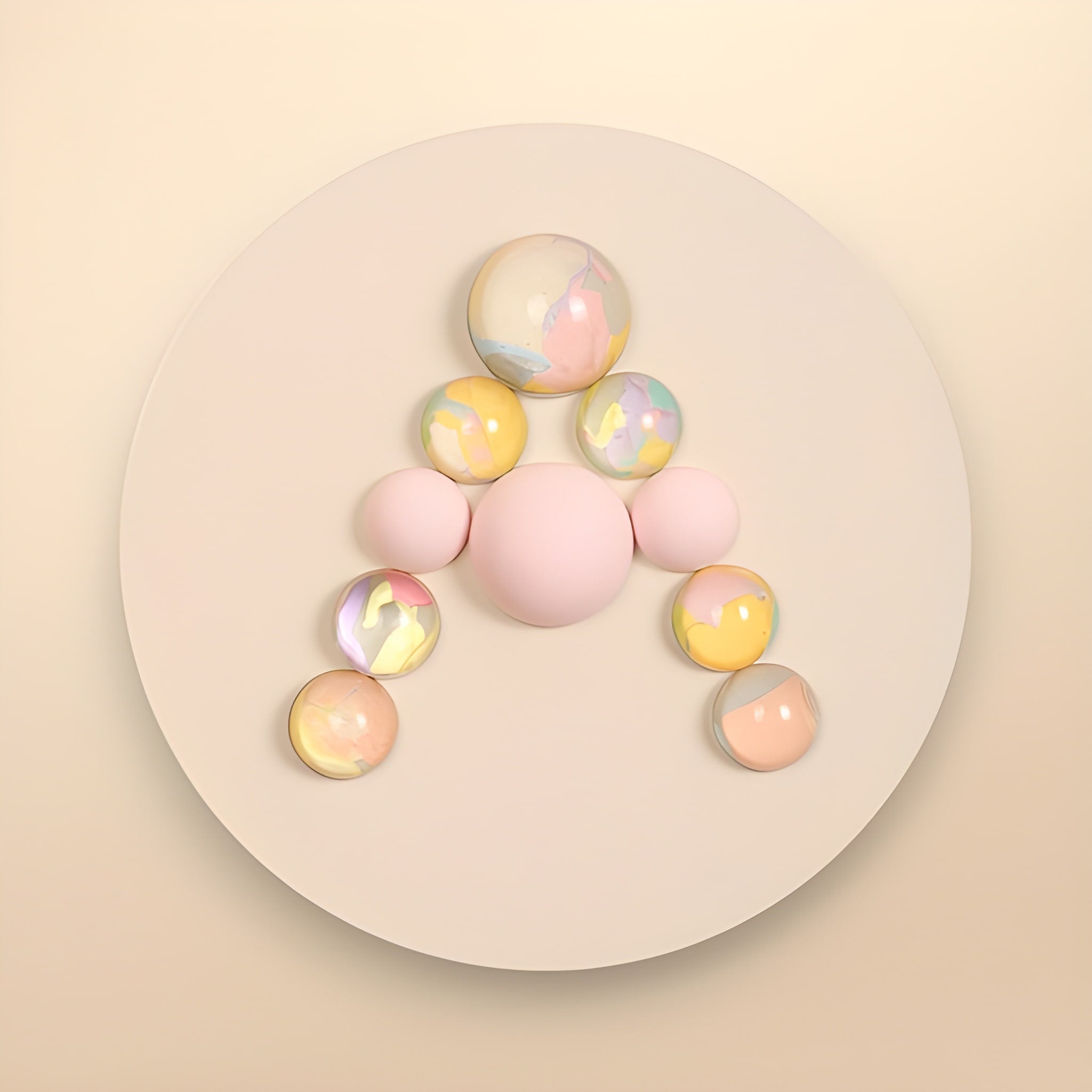 32 cm çapında ahşap yuvarlak duvar panosu üzerine orijinal boya çalışmalarının içlerine yerleştirildiği yarım kürelerin harf formunu oluşturacak şekilde düzenlenmesiyle oluşturulmuştur.