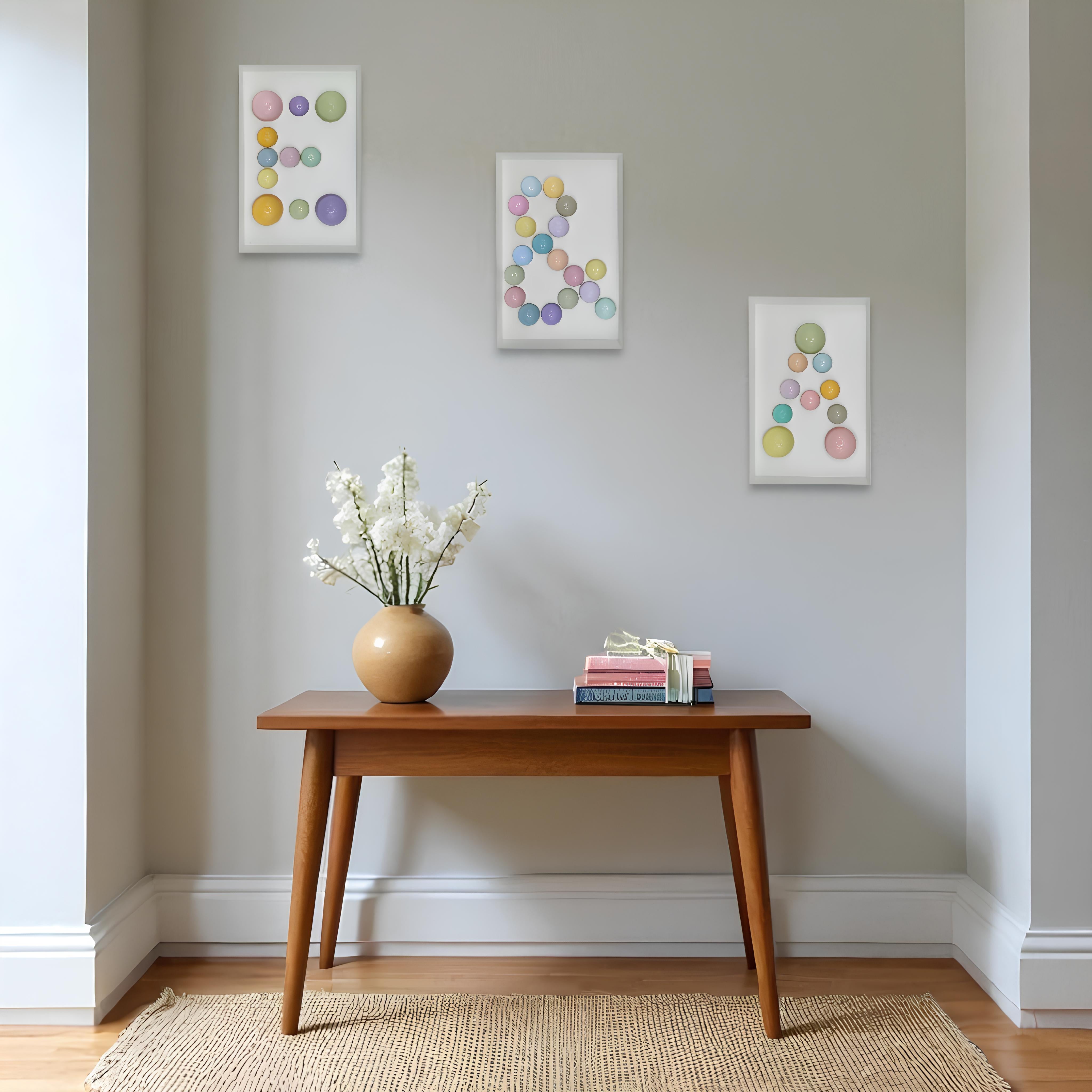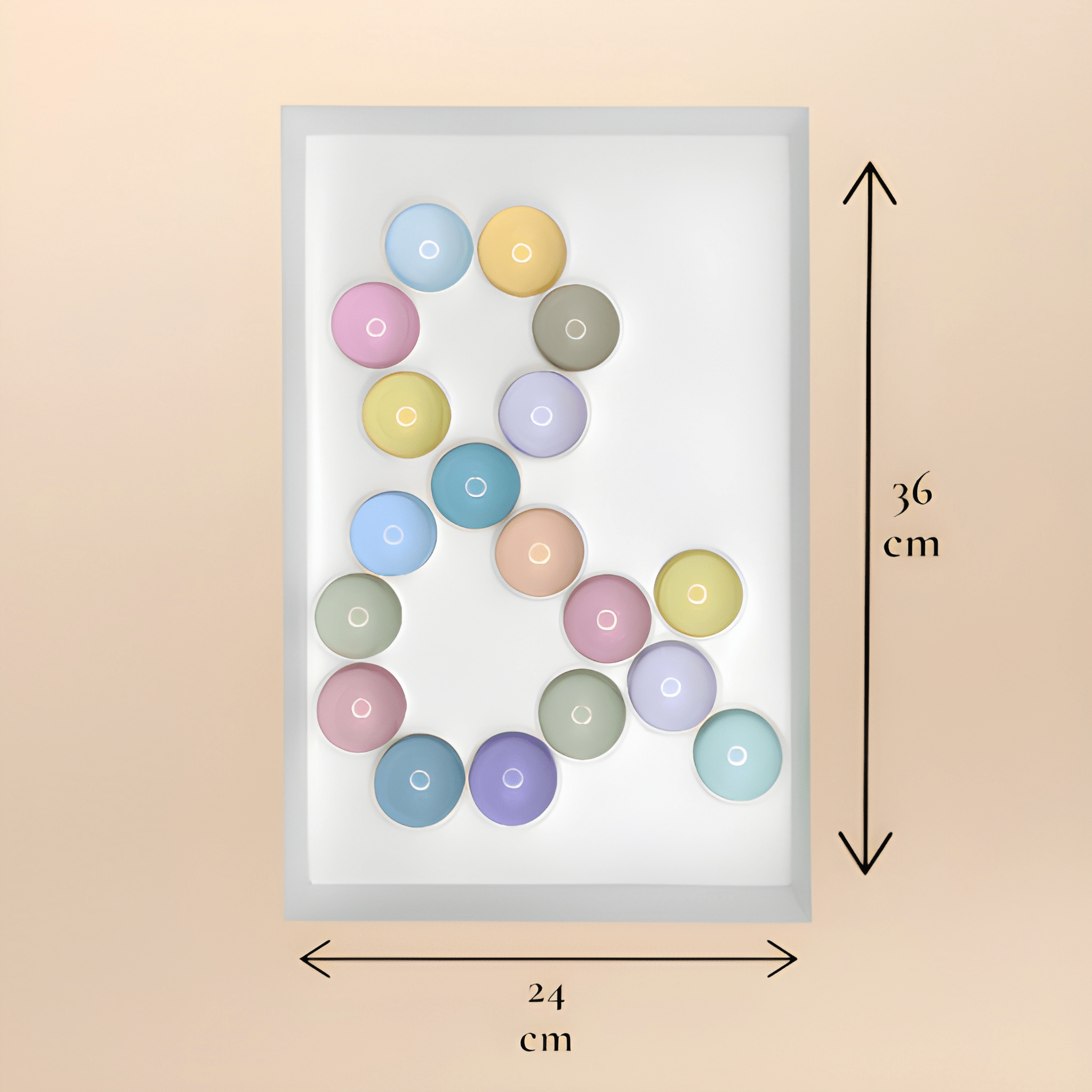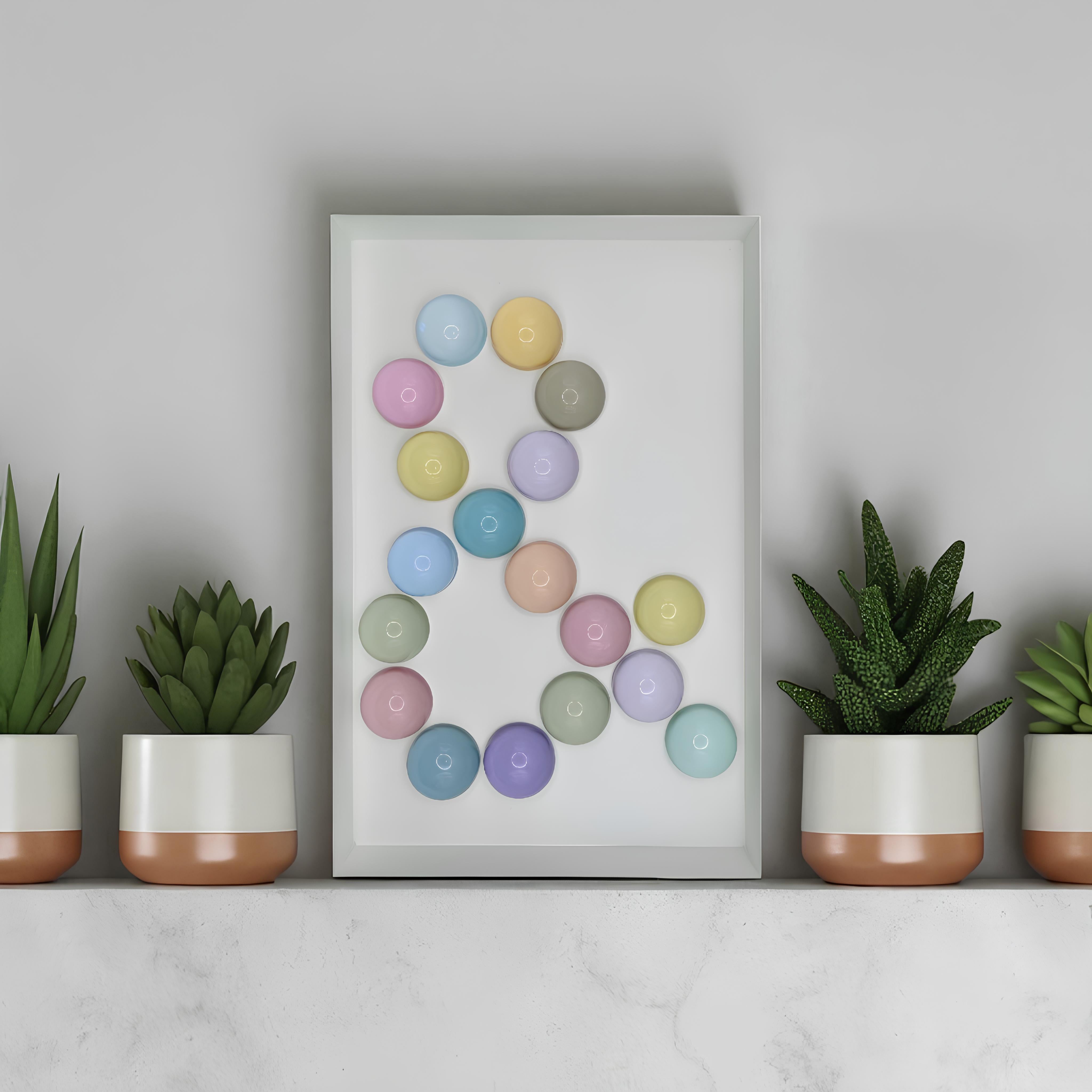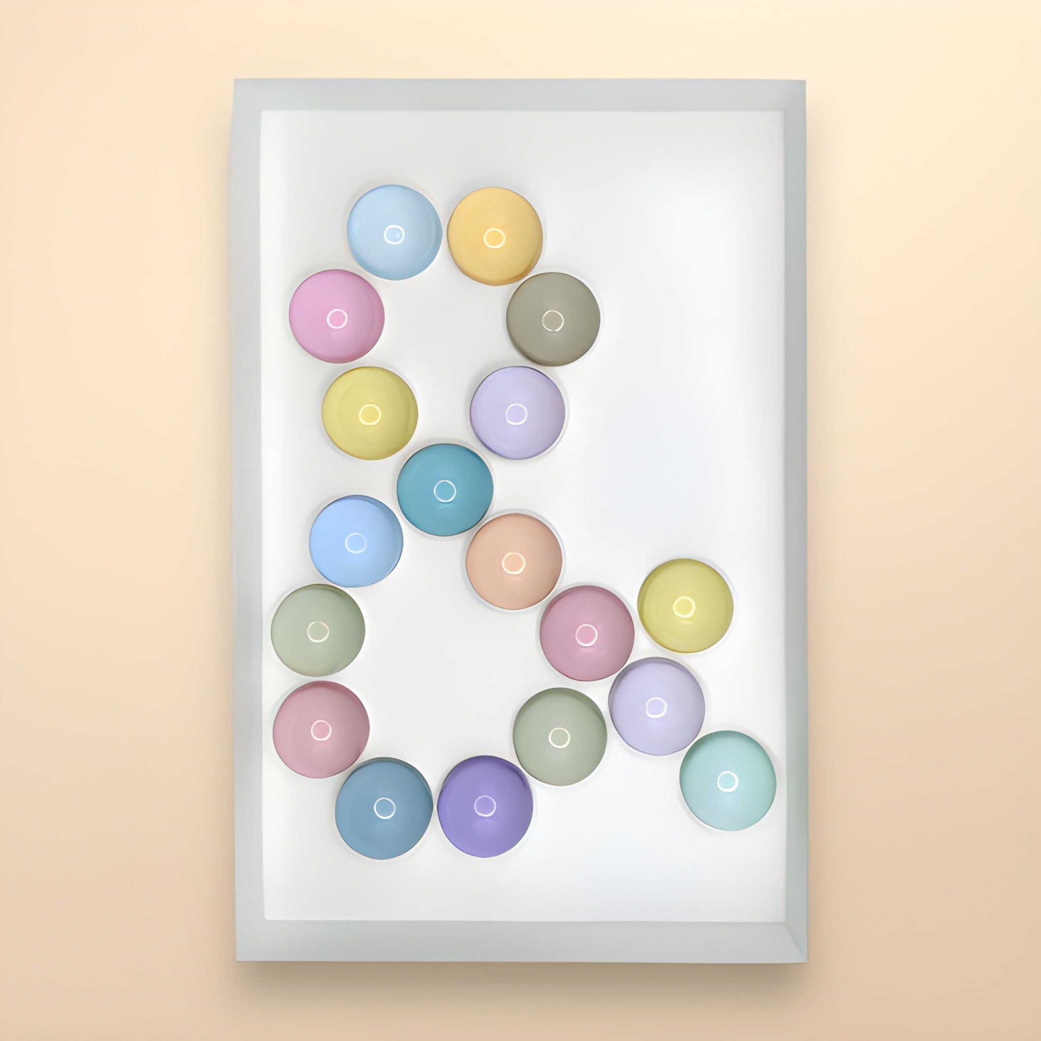 24x36x5 cm ölçülerinde ahşap derinlikli çerçeve içerisine arka yüzlerinden pastel renklerde boyanmış epoksi yarım kürelerin & formunu oluşturacak şekilde düzenlenmesiyle oluşturulmuştur.