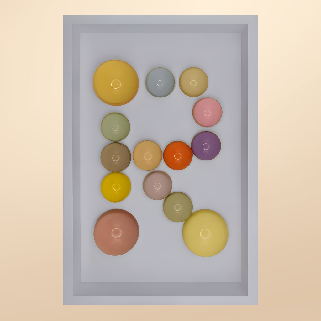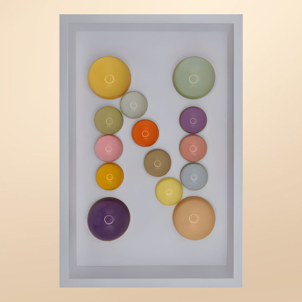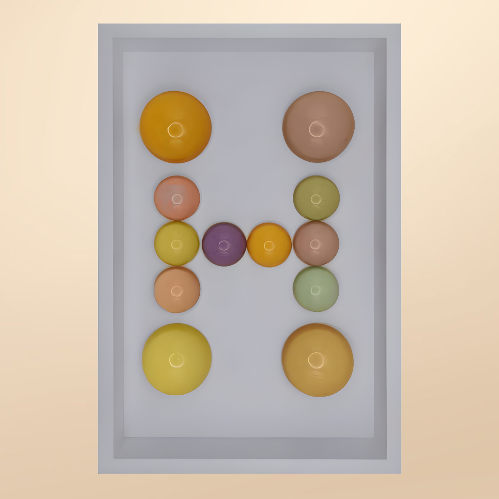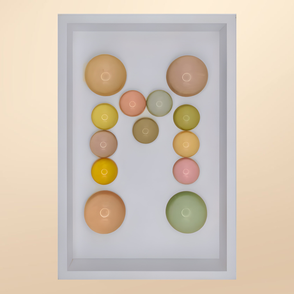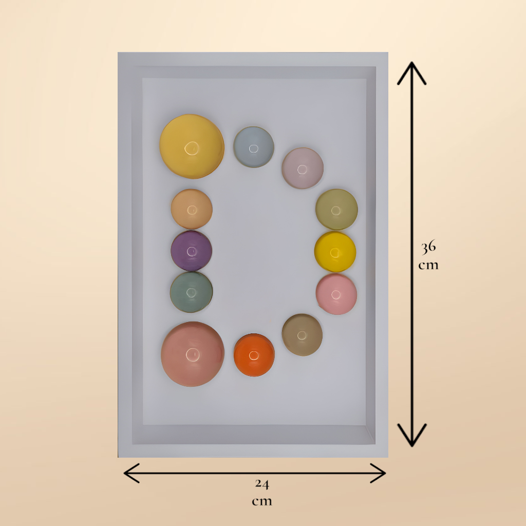 24x36x5 cm ölçülerinde ahşap derinlikli çerçeve içerisine arka yüzlerinden pastel renklerde boyanmış epoksi yarım kürelerin harf formunu oluşturacak şekilde düzenlenmesiyle oluşturulmuştur.
