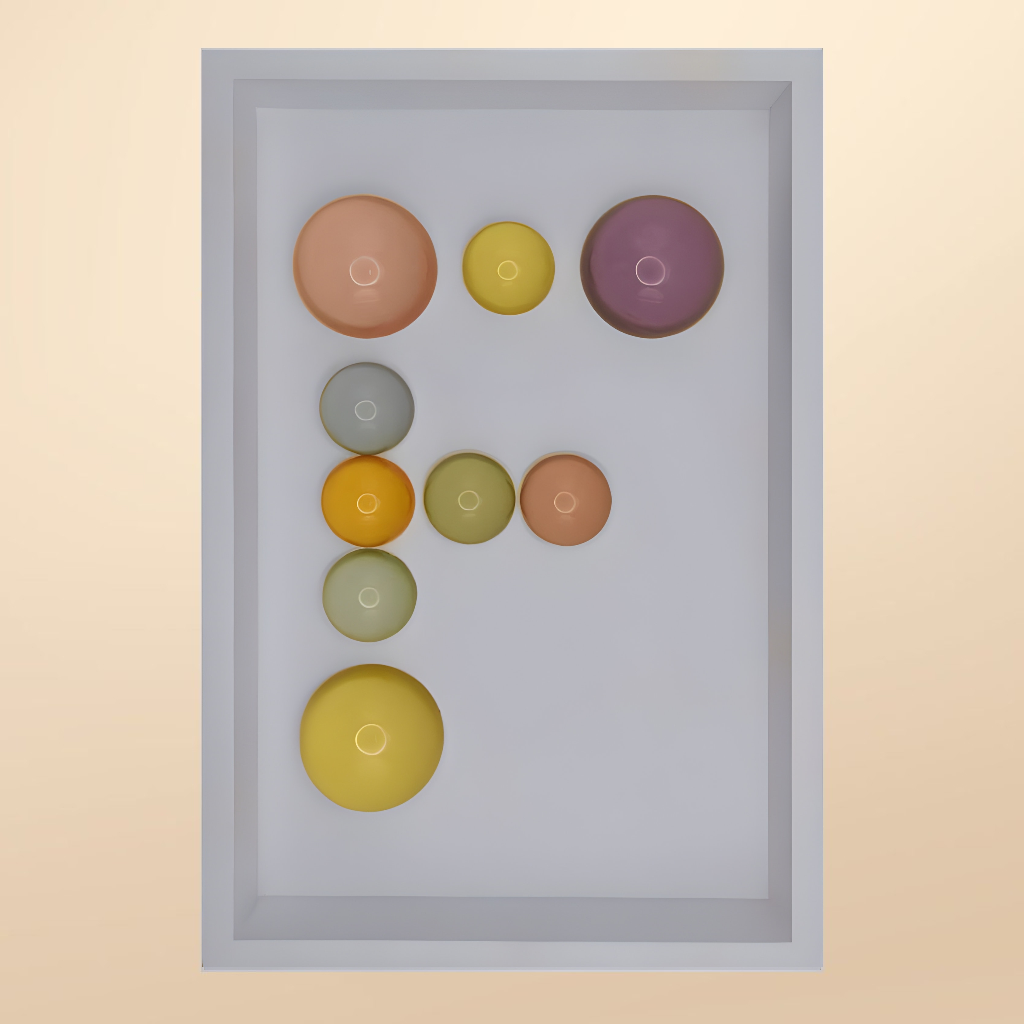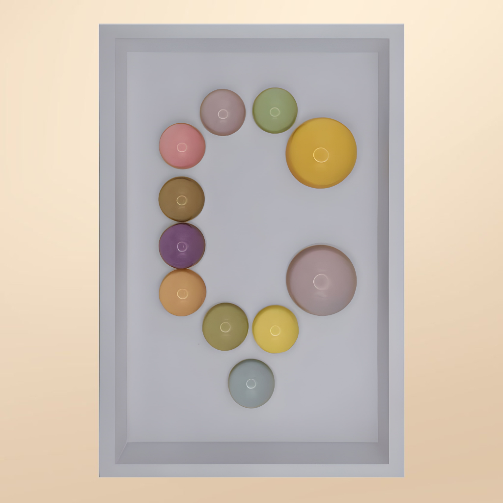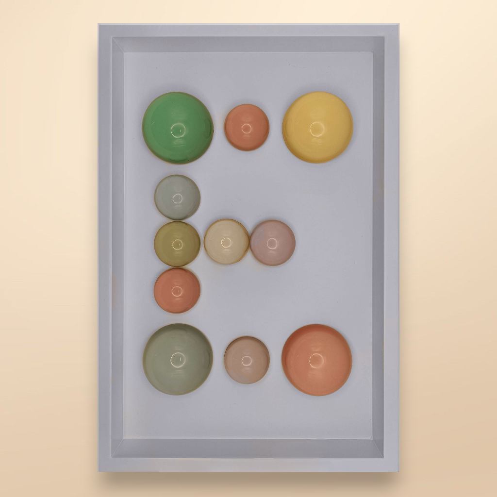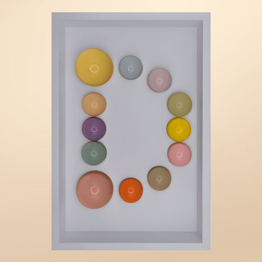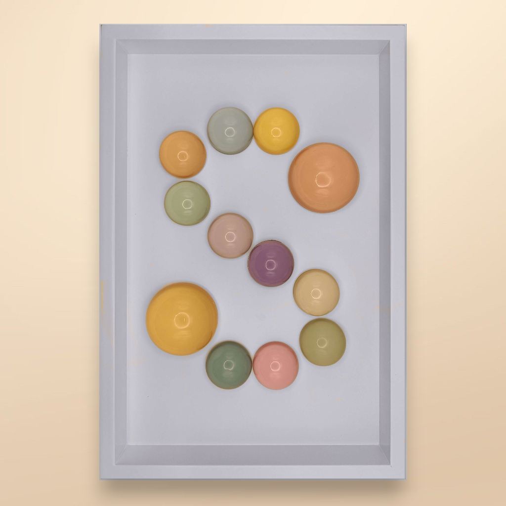 24x36x5 cm ölçülerinde ahşap derinlikli çerçeve içerisine arka yüzlerinden pastel renklerde boyanmış epoksi yarım kürelerin harf formunu oluşturacak şekilde düzenlenmesiyle oluşturulmuştur.