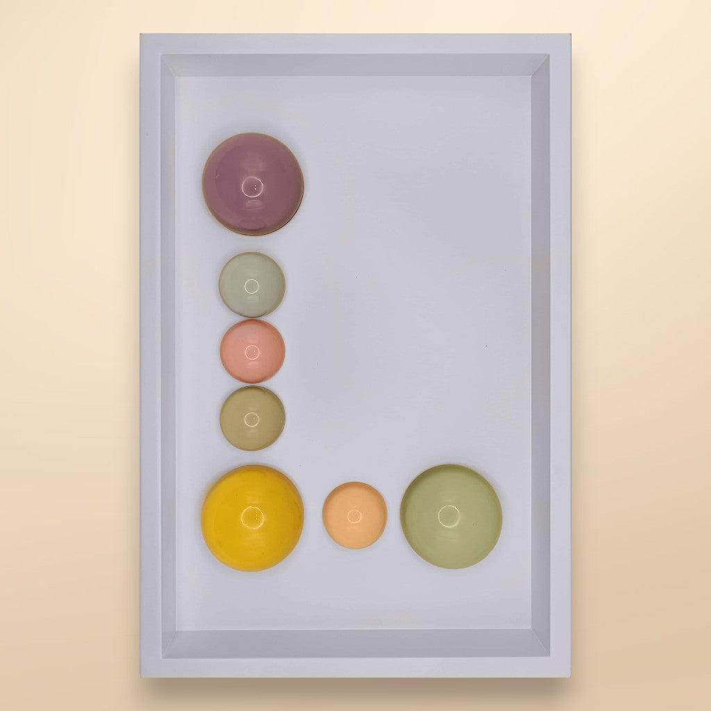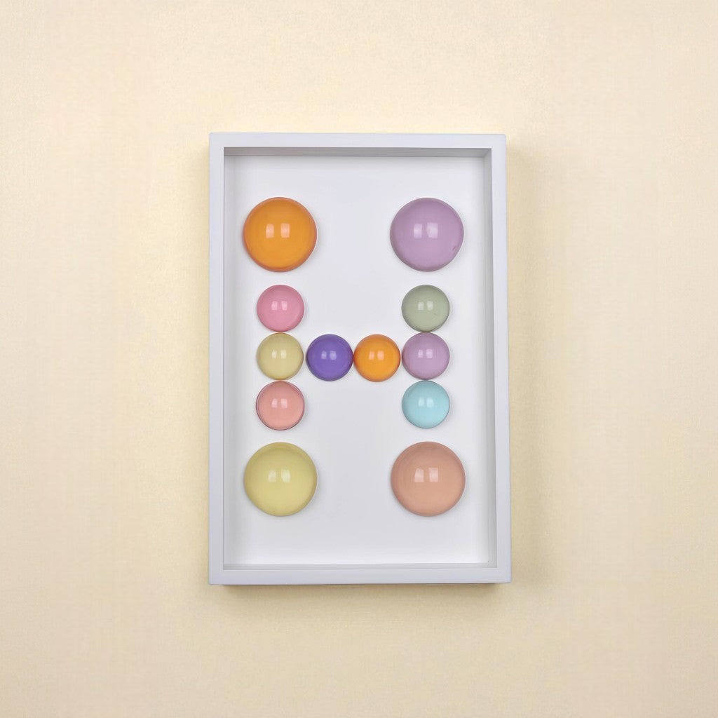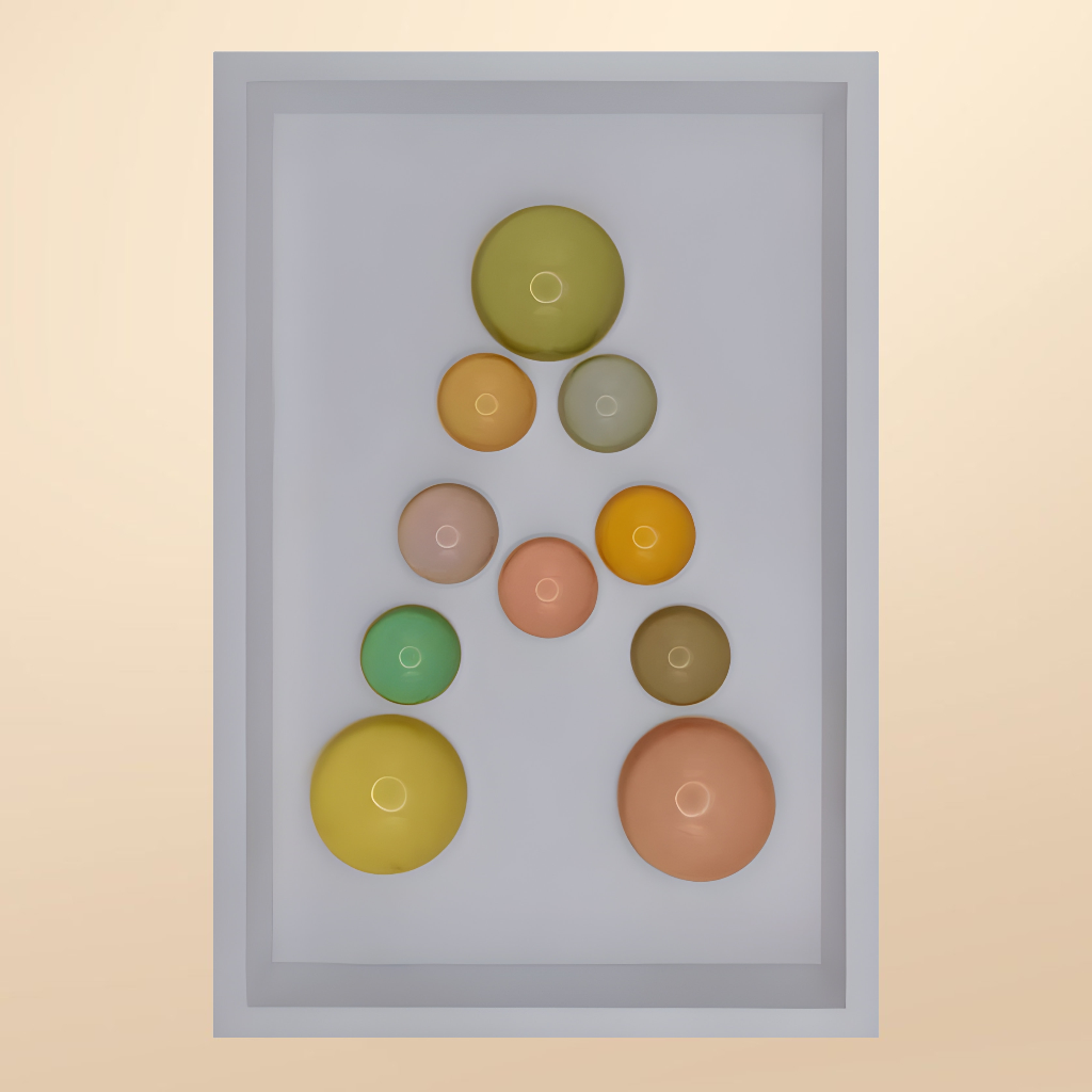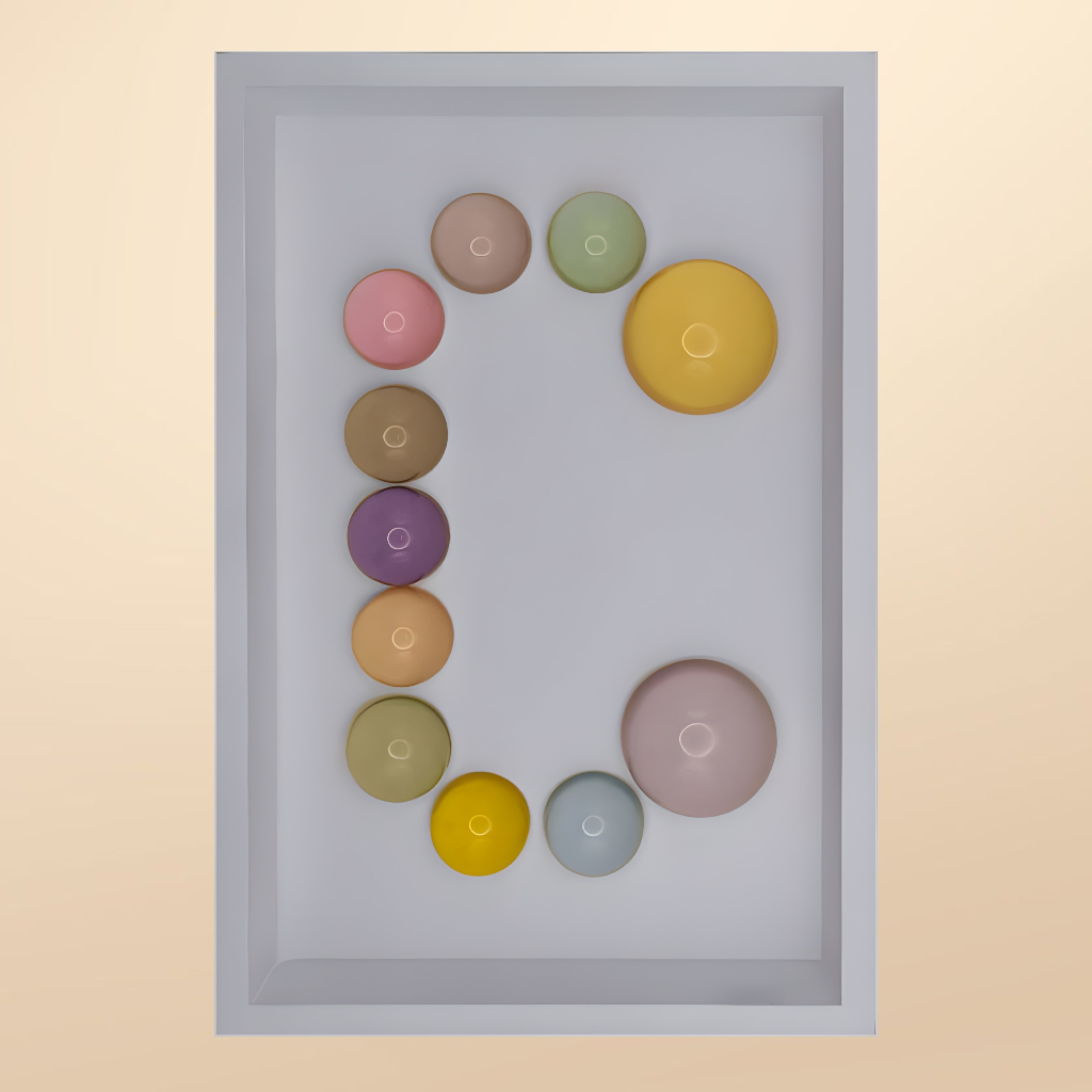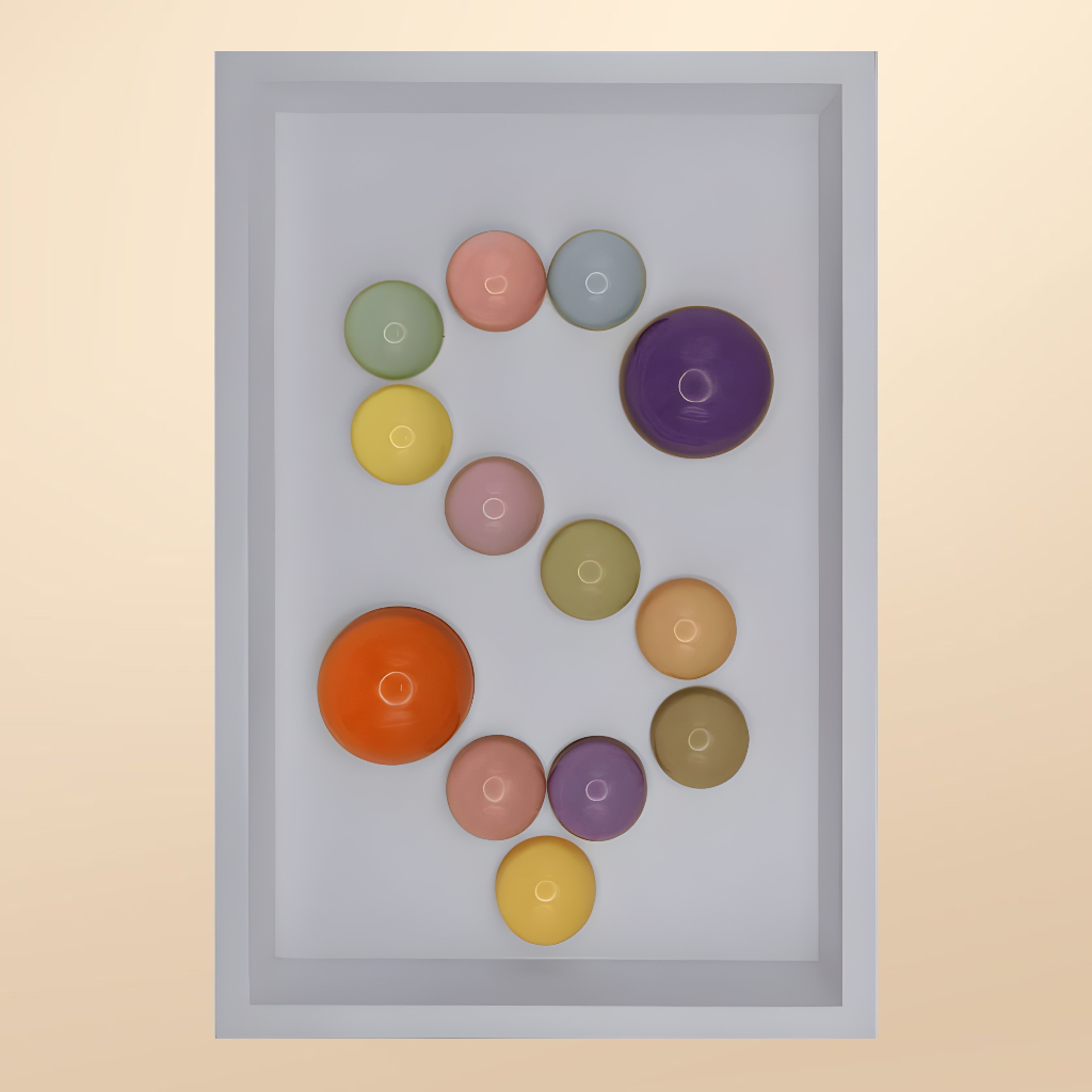 24x36x5 cm ölçülerinde ahşap derinlikli çerçeve içerisine arka yüzlerinden pastel renklerde boyanmış epoksi yarım kürelerin harf formunu oluşturacak şekilde düzenlenmesiyle oluşturulmuştur.
