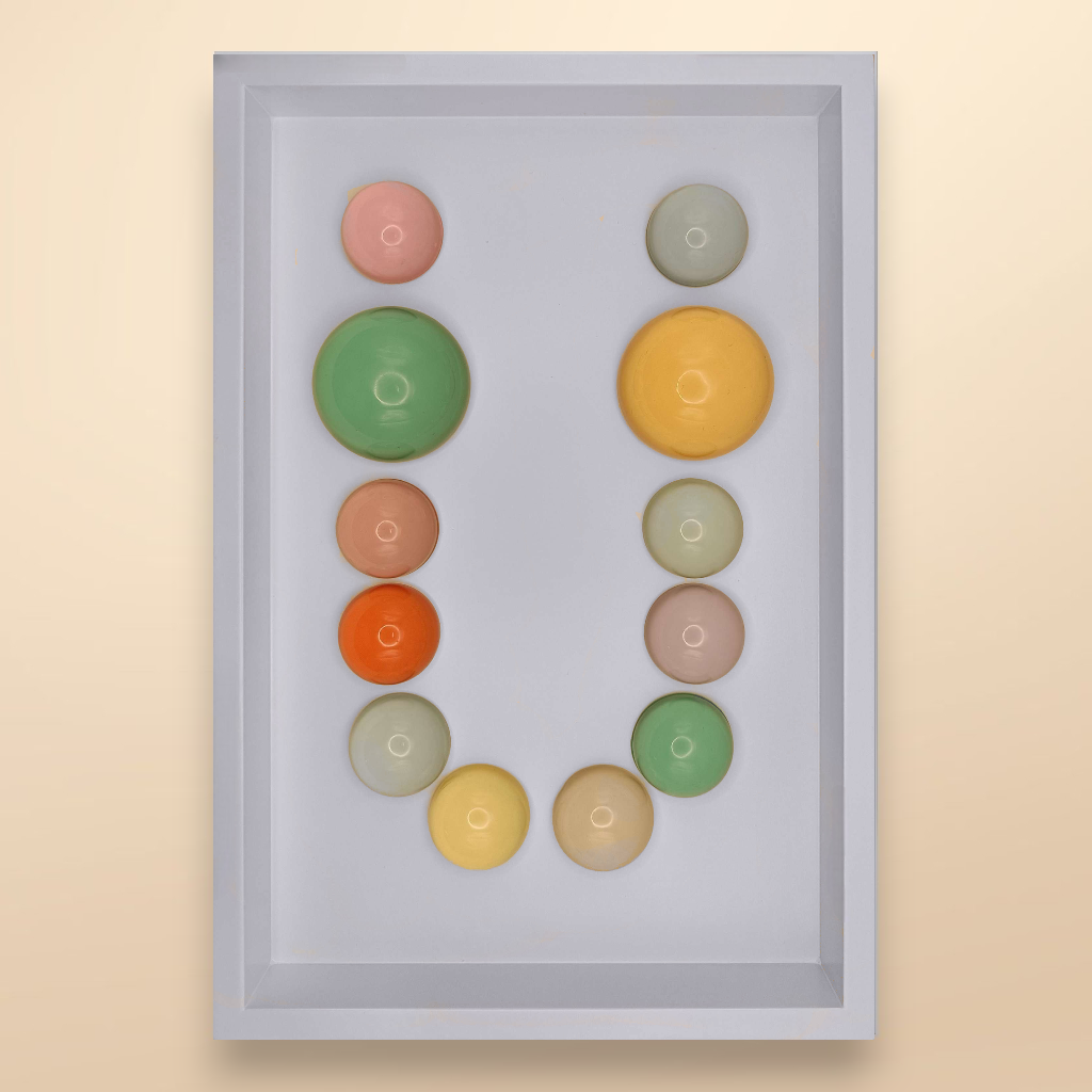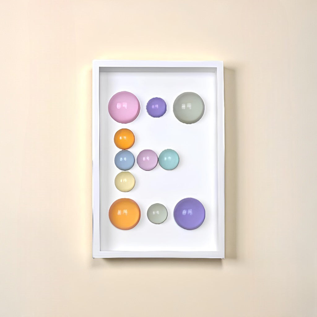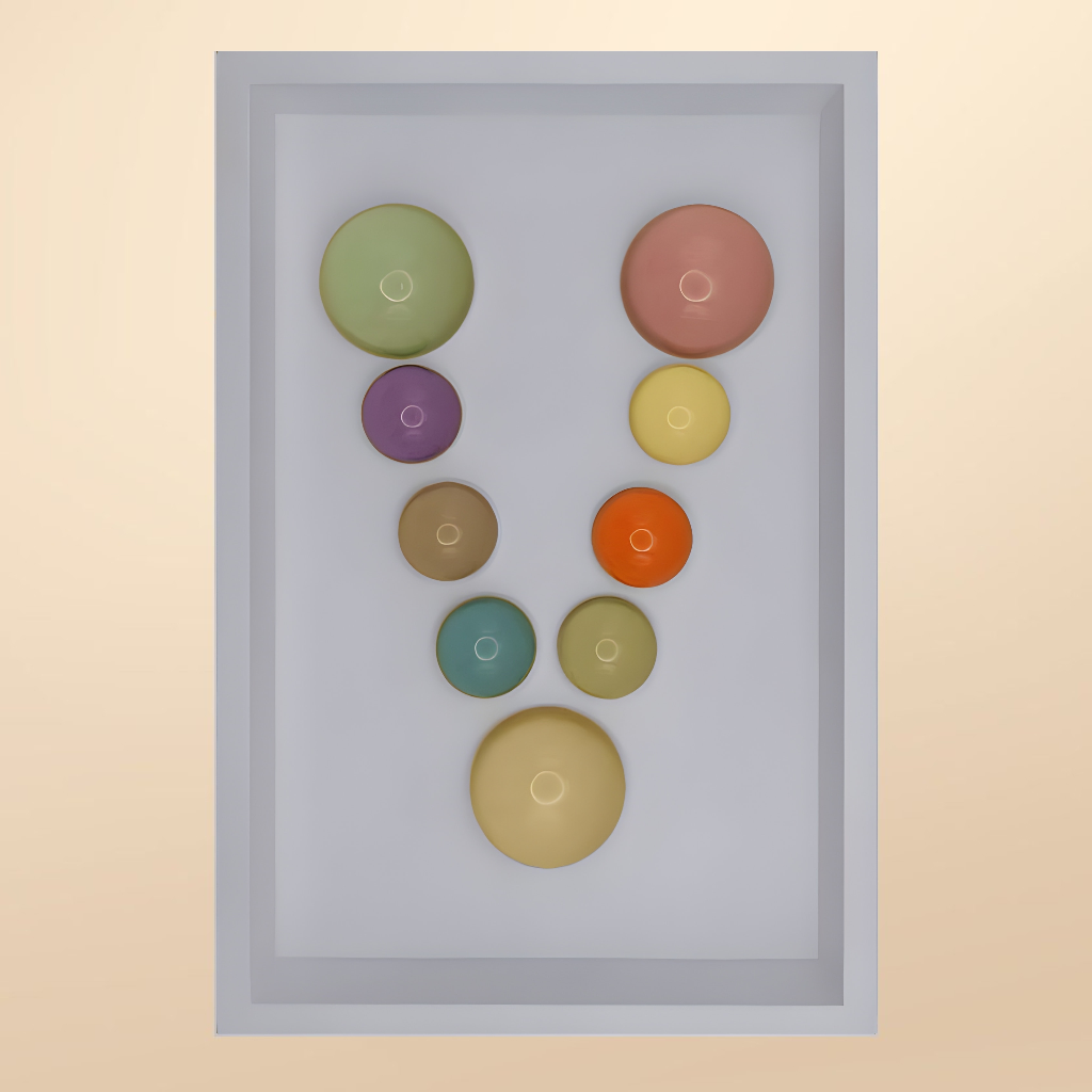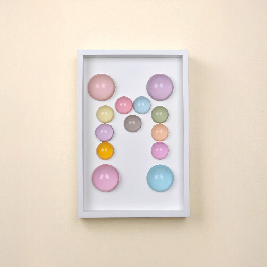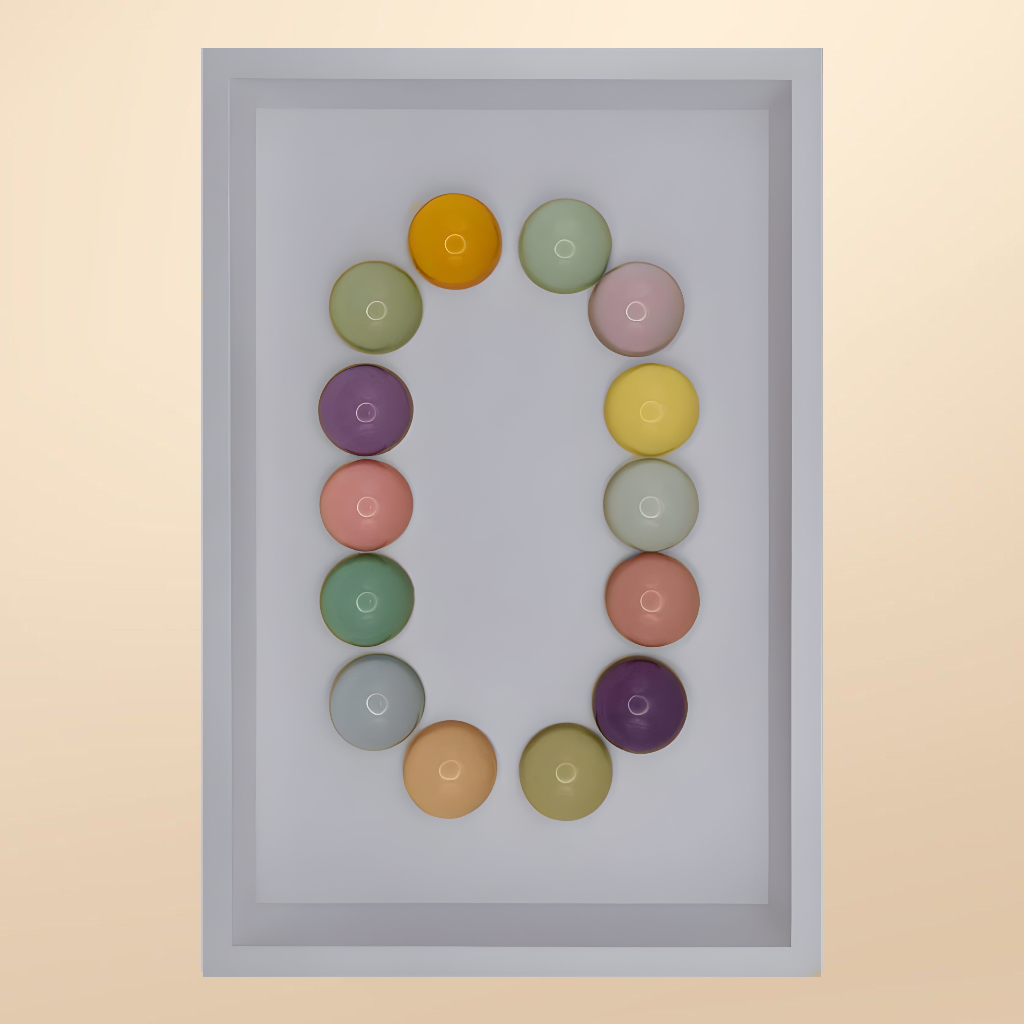 24x36x5 cm ölçülerinde ahşap derinlikli çerçeve içerisine arka yüzlerinden pastel renklerde boyanmış epoksi yarım kürelerin harf formunu oluşturacak şekilde düzenlenmesiyle oluşturulmuştur.