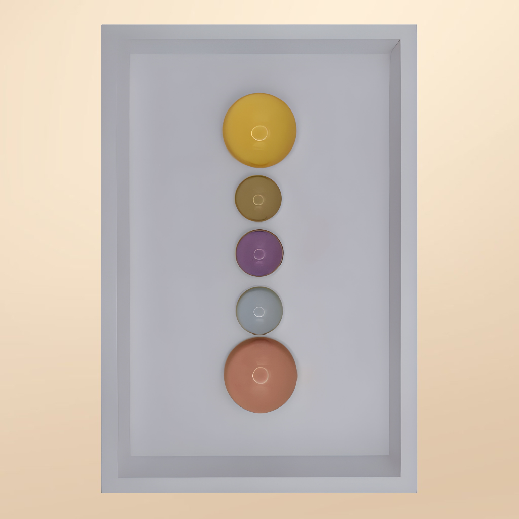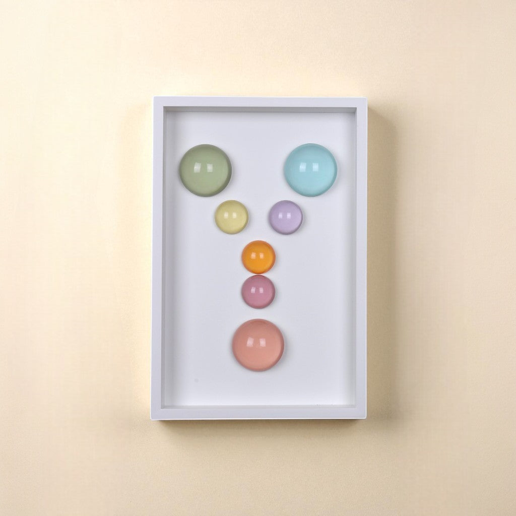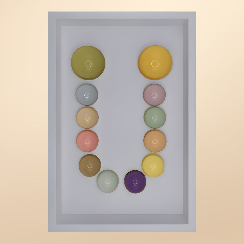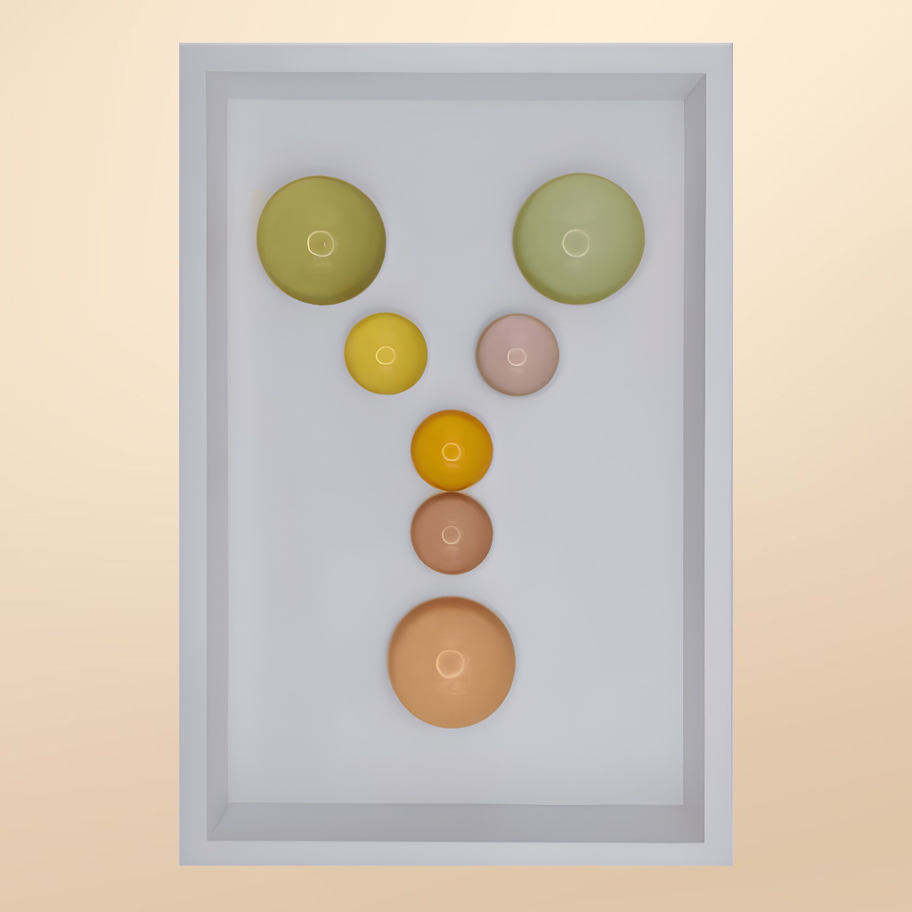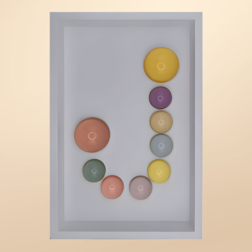 24x36x5 cm ölçülerinde ahşap derinlikli çerçeve içerisine arka yüzlerinden pastel renklerde boyanmış epoksi yarım kürelerin harf formunu oluşturacak şekilde düzenlenmesiyle oluşturulmuştur.
